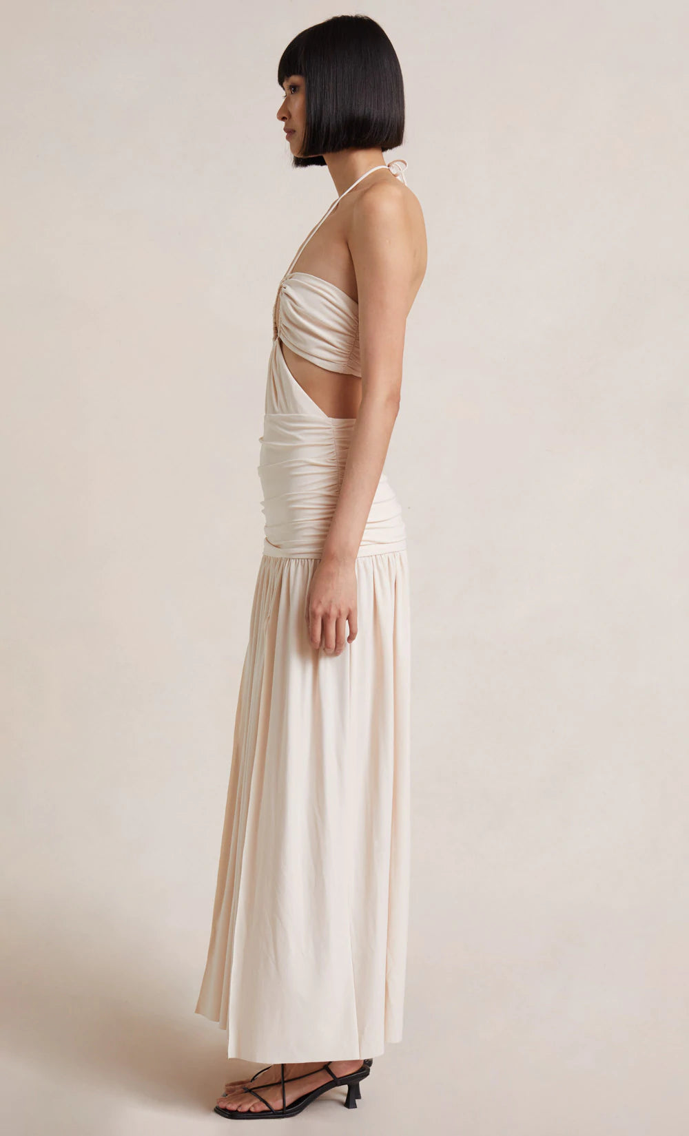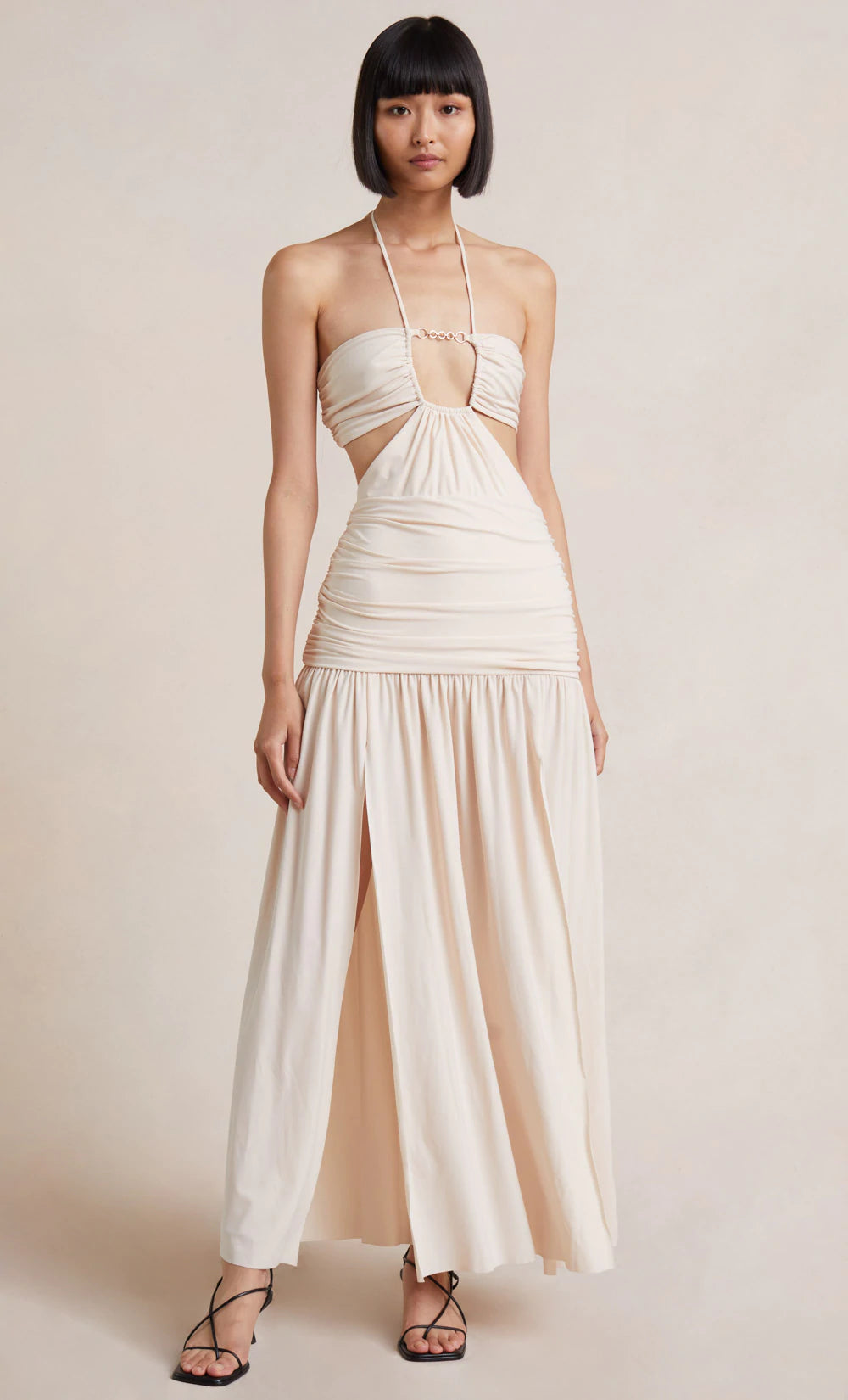 Make an entrance in the Adaline Cut Out Maxi Dress. The drop-waisted maxi features a gathered bodice, under-bust cut-outs and side-leg split, complemented with contrasting gold O-ring and chain hardware and a sweet self-tie detail.