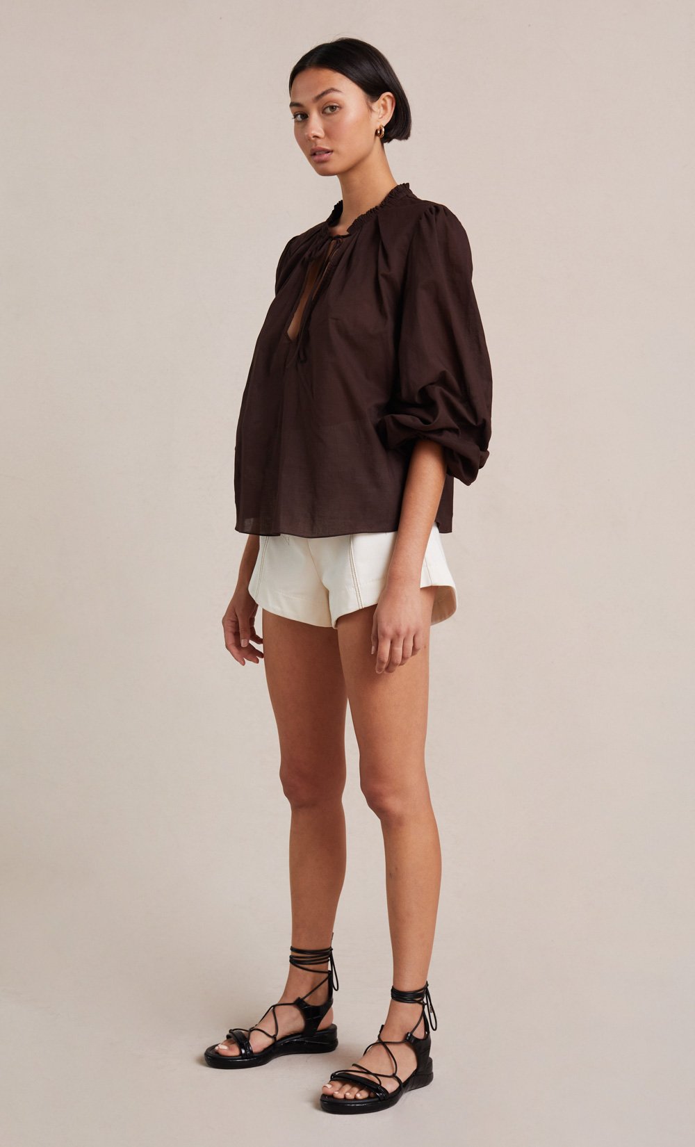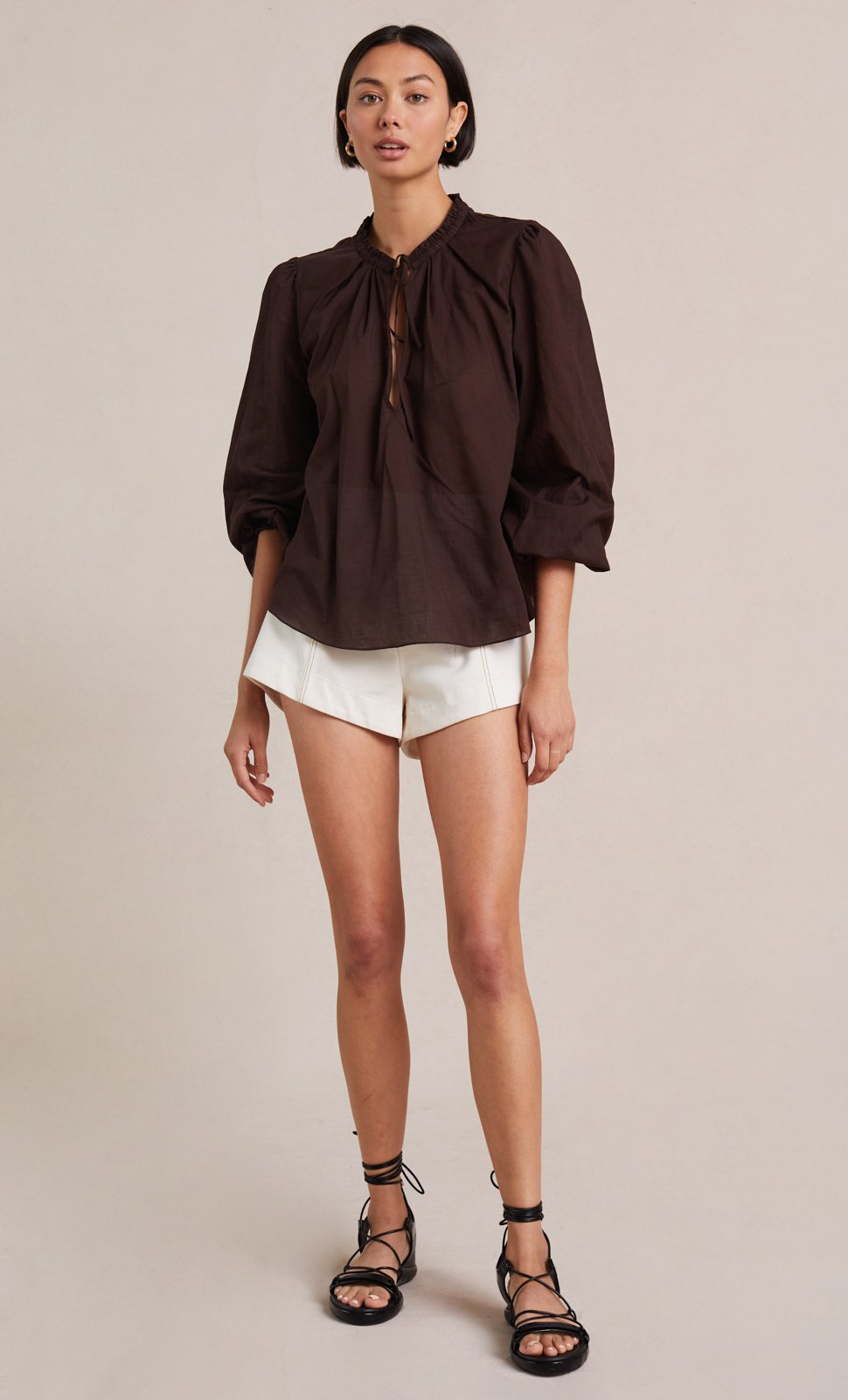 Cut from a breezy woven cotton fabric, the Alexandra Long Sleeve Blouse is an easy to wear style with a plunge neckline finished with an adjustable tie across the neckline. The blouse features voluminous puff sleeves with elasticated cuffs that finish at the elbow.