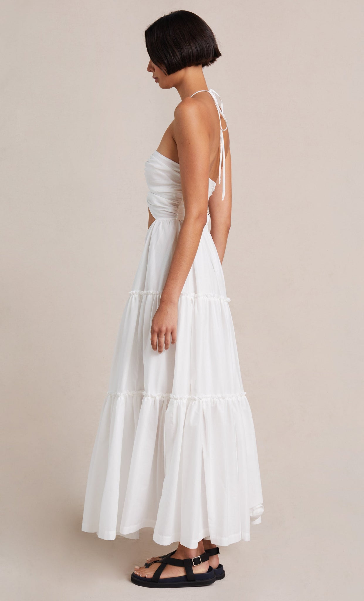 Make a statement with the Aurora Maxi Dress. Spun from a breezy cotton fabric, this maxi dress features a gathered bust with front keyhole cutouts, rouleau neck ties and a cutout at the waist that flows into a gathered tiered skirt.