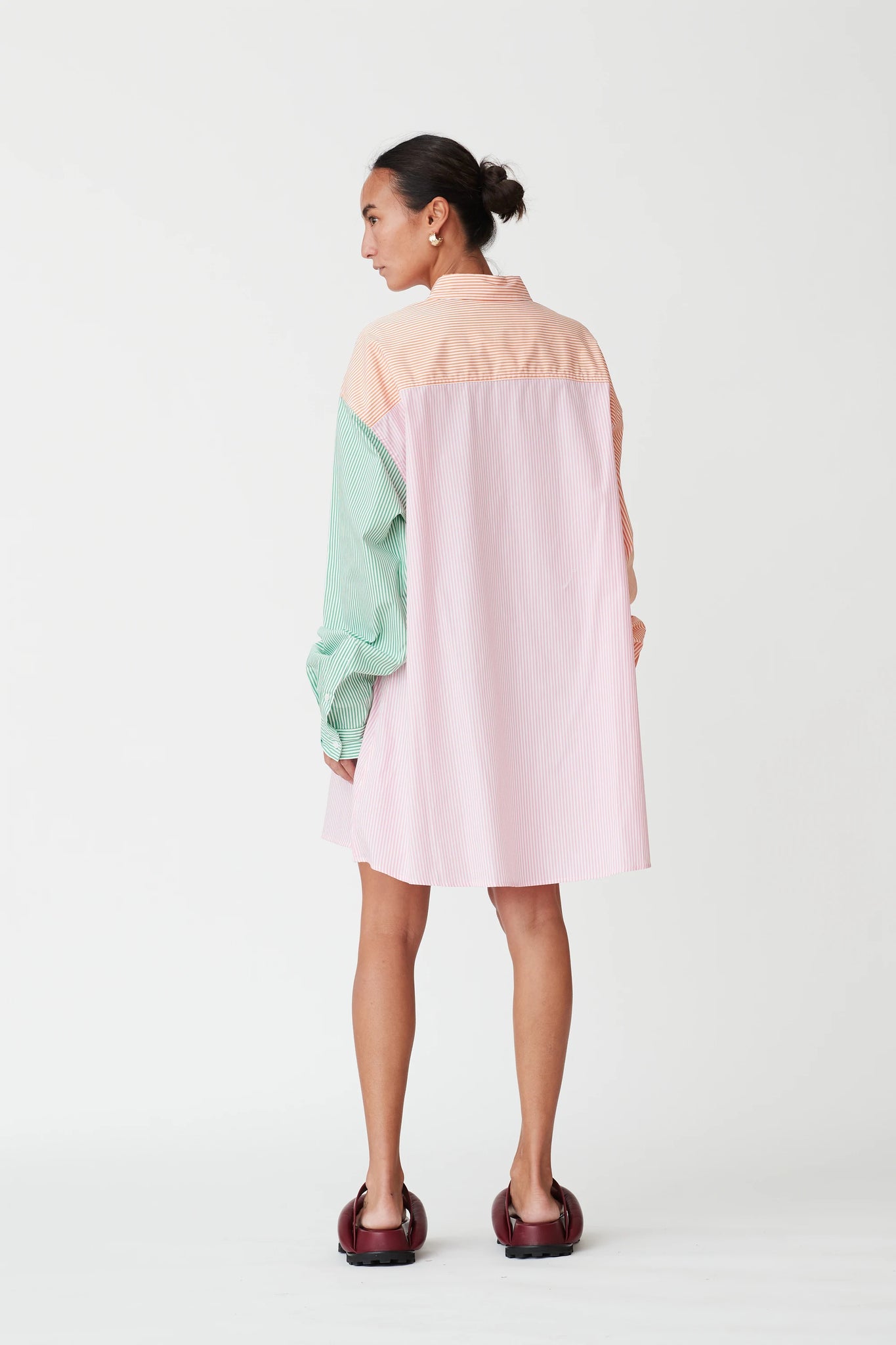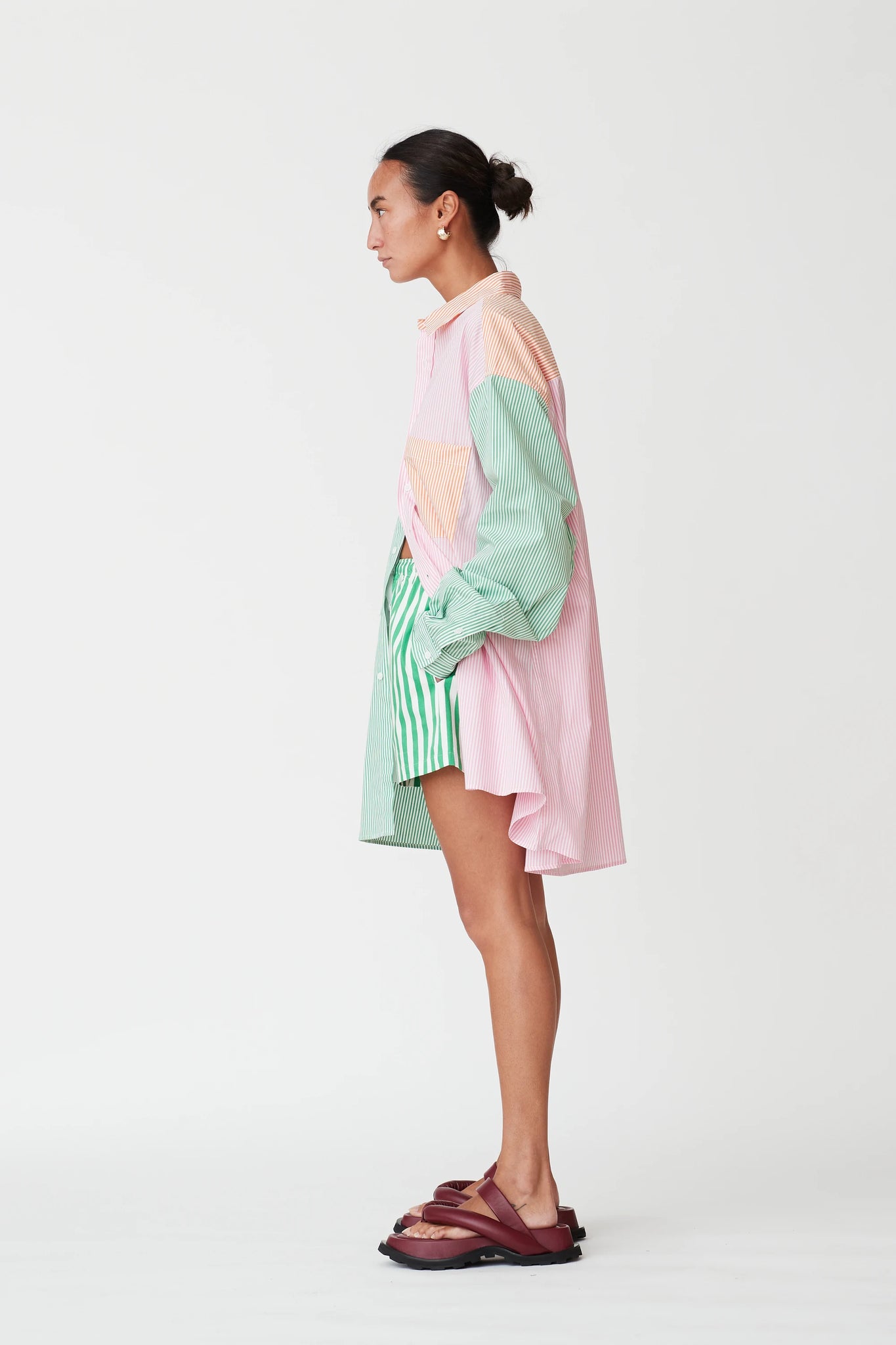 The Benny featuring a pinstripe pattern in contrasting hues and an easy to wear silhouette with a playful nod to workwear shirting.