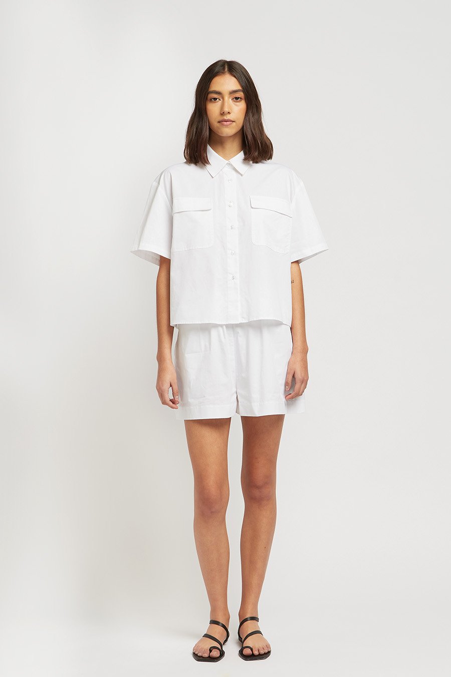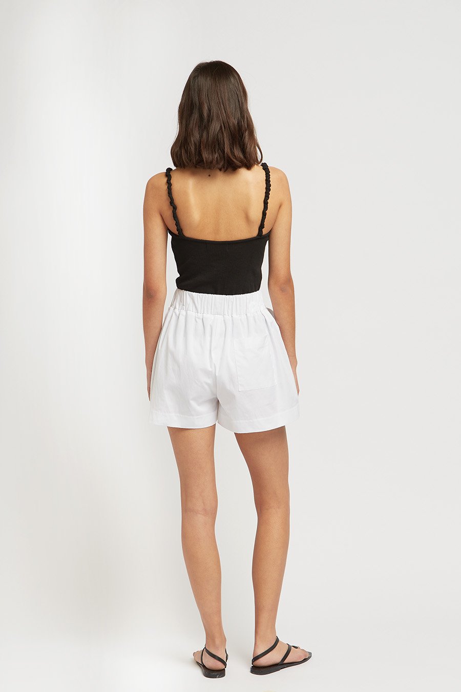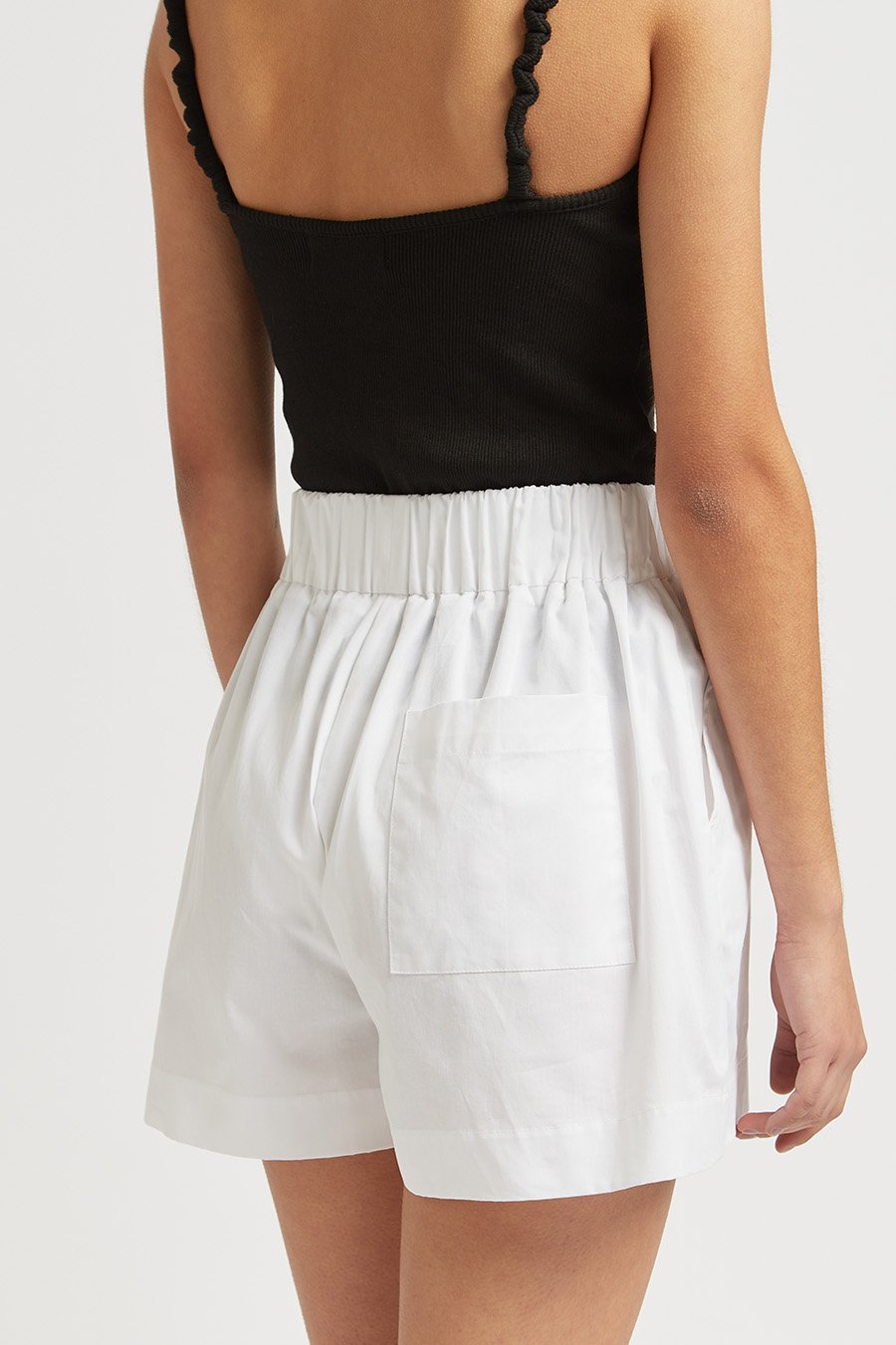 A pair of white shorts cut from 100% cotton shirting. Features an elastic waistband with side pockets. Wide elasticated waistband Side seam pockets Large back pocket Unlined This garment runs true to size.Garment length: 40cm (size AU 8)Main:...Read more