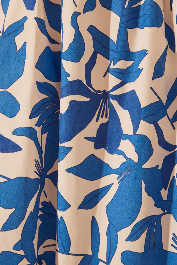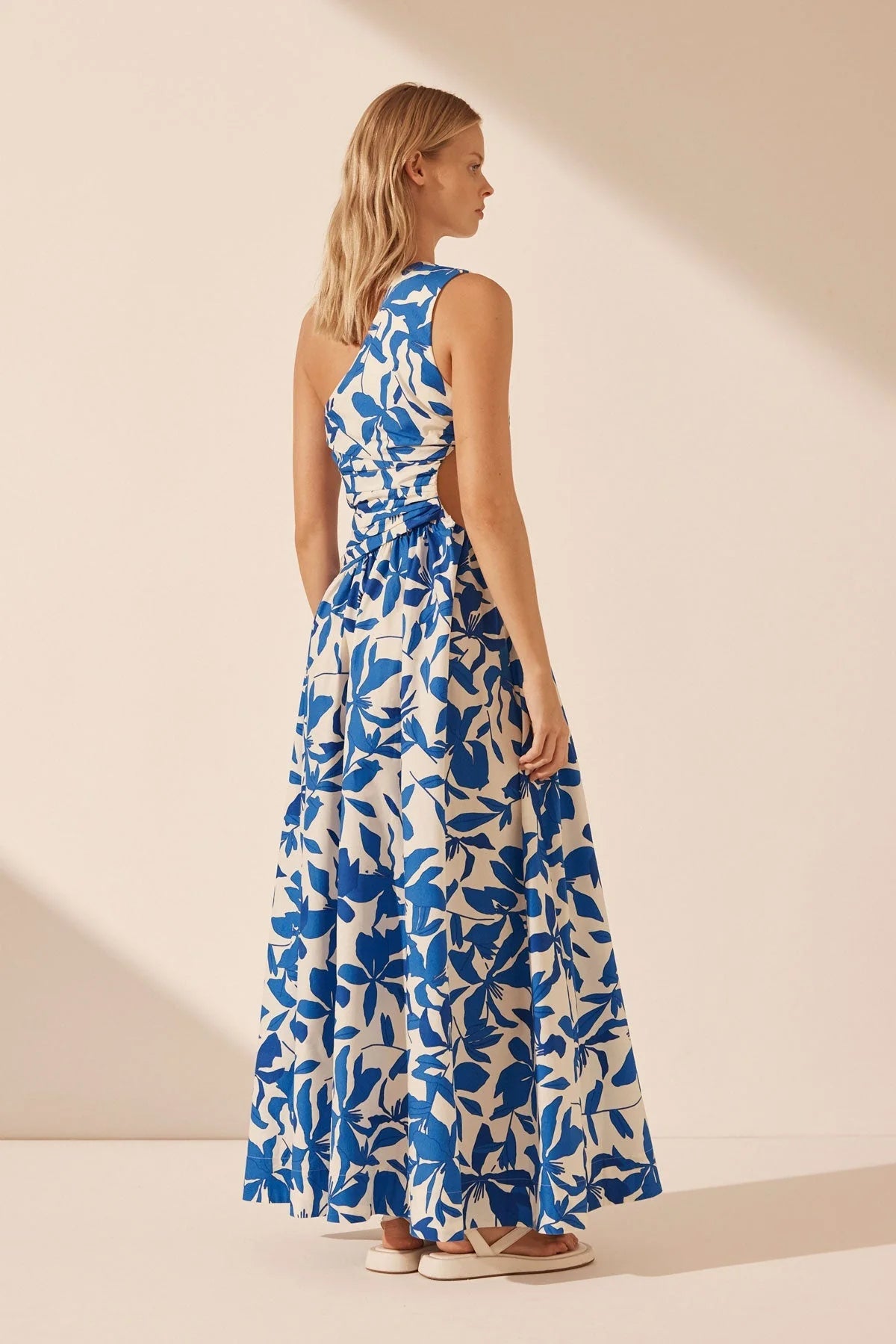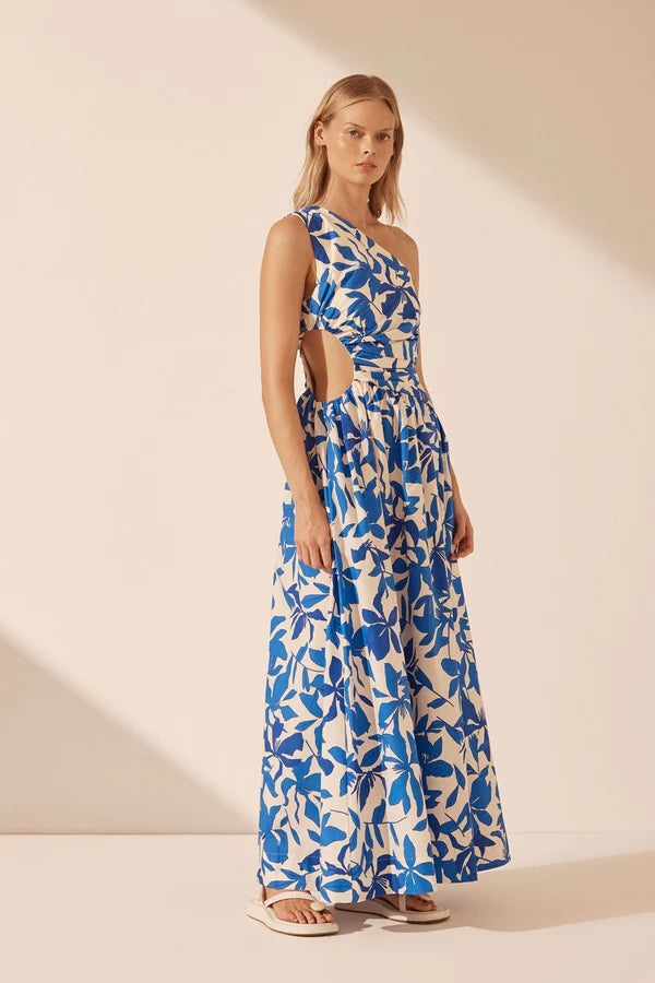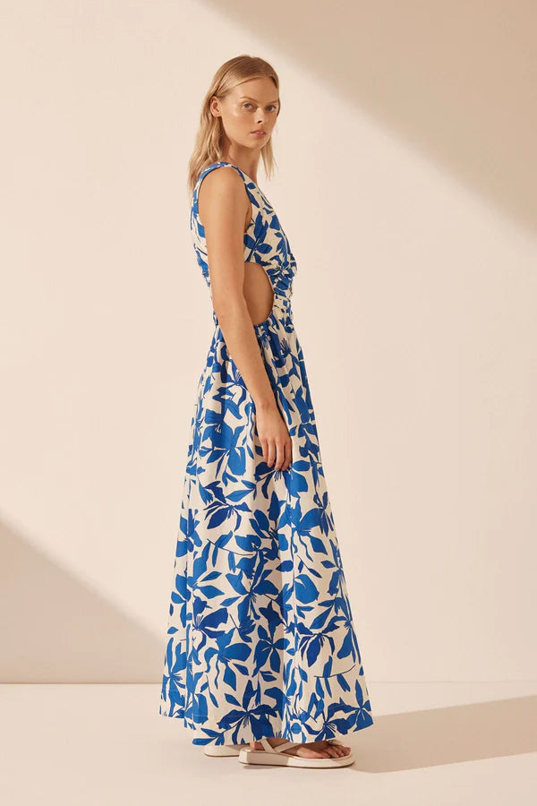 Asymmetrical maxi dress with cut out side detail in the exclusive Bleue print in a GOTS certified organic cotton.