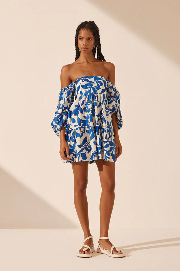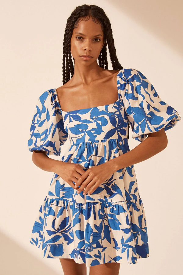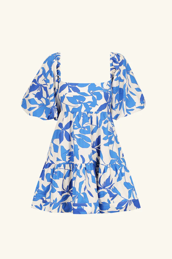 Short sleeve square neck mini dress in the exclusive Bleue print in a GOTS certified organic cotton.