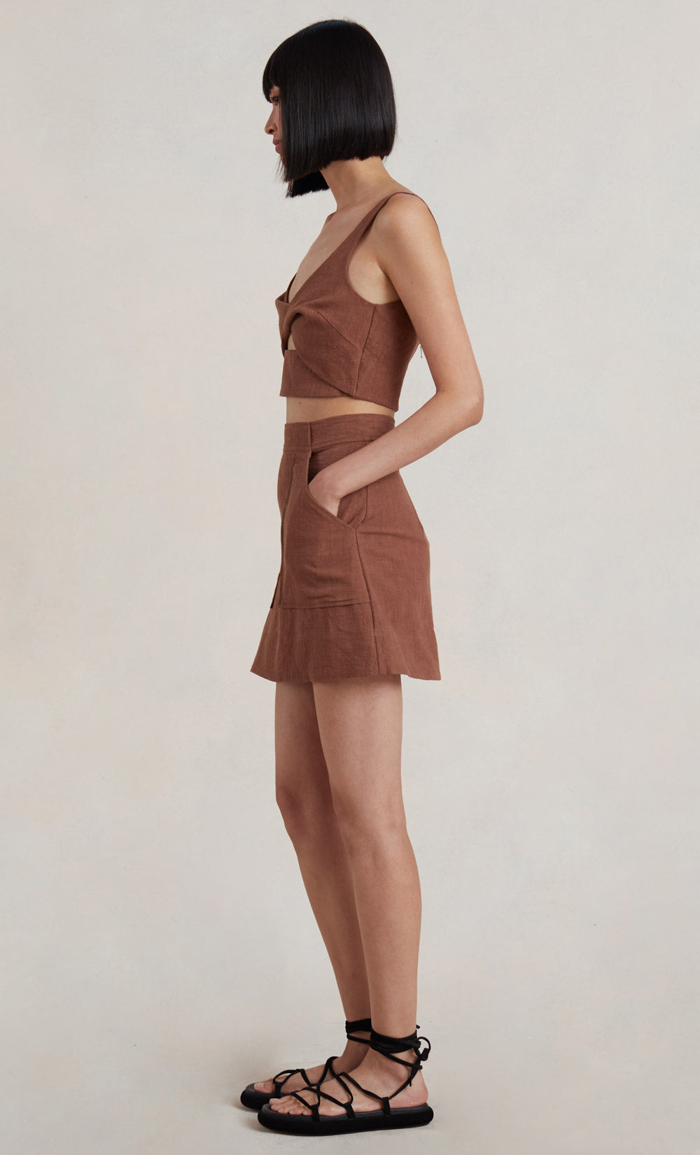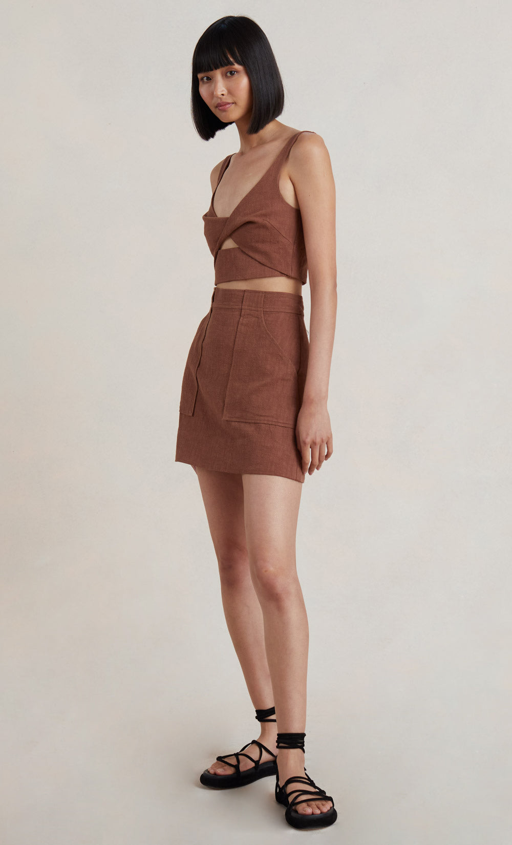 The Bonnie Mini Skirt is cut from a lightweight woven fabric. This retro inspired style features a high waist with oversized front patch pockets in a structured A-line silhouette. Styled with our Bonnie Twist Top.