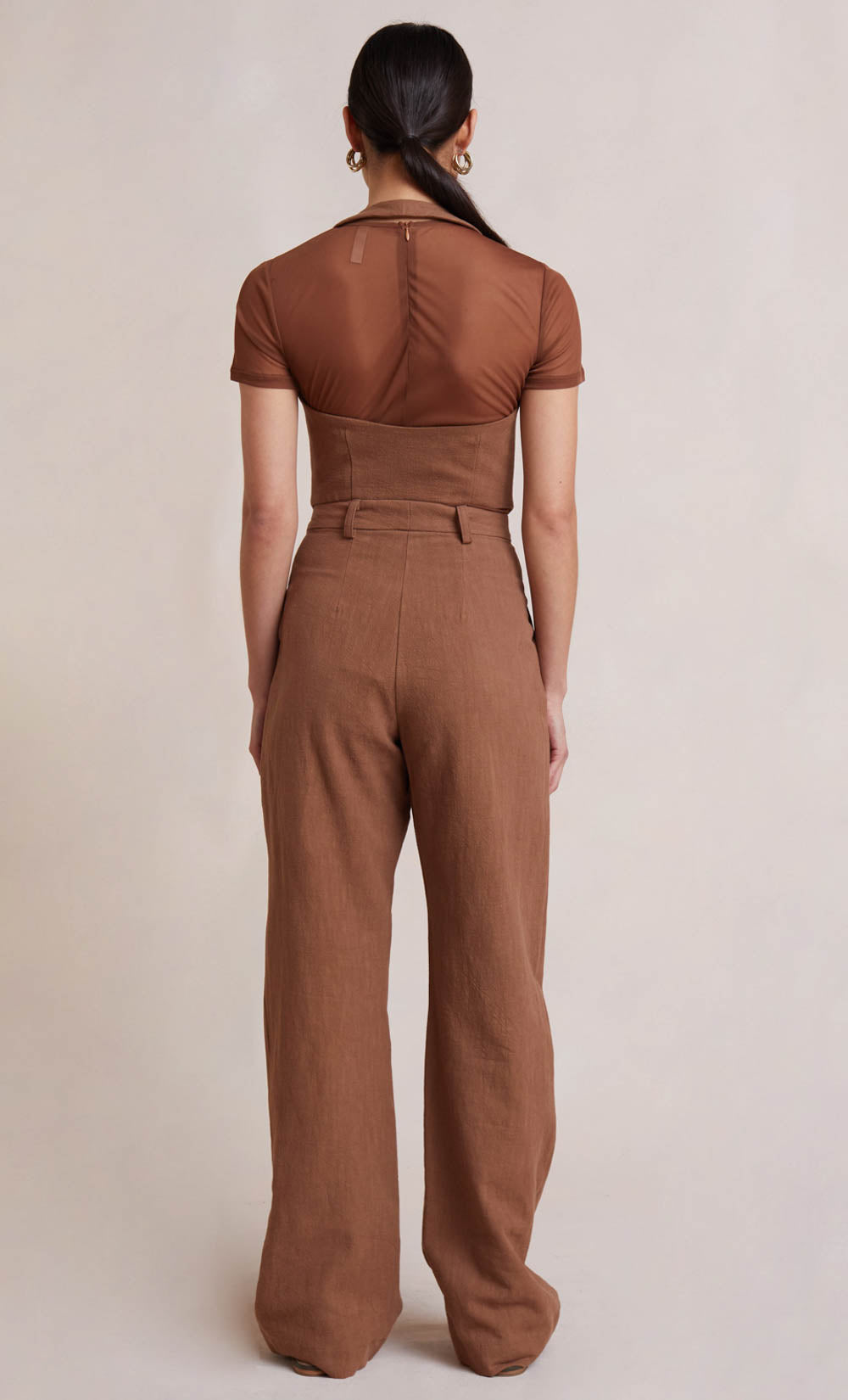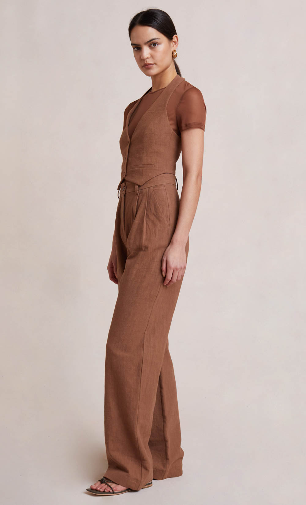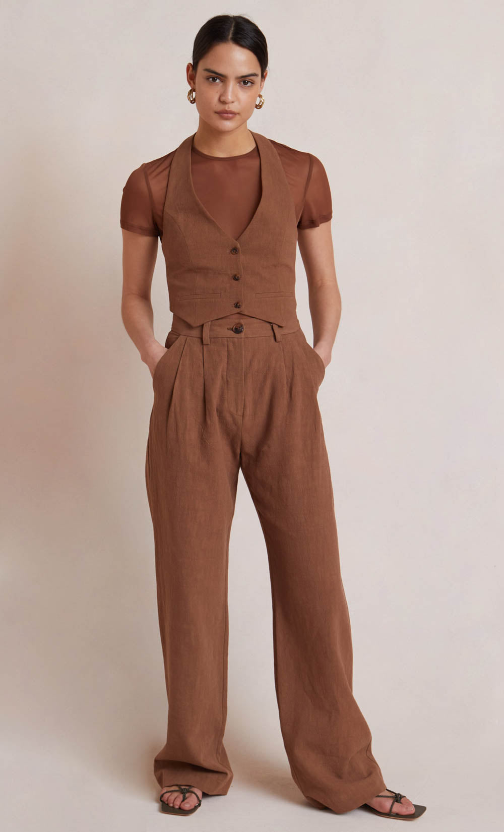 Cut from a lightweight woven fabric, the Bonnie Pant is a stylish and easy-to-wear tailored pant that sits high on the waist before falling into a relaxed straight leg silhouette. The pants are finished with a pleated front. Styled with our Bonnie Vest Top and Blossom Bodysuit.