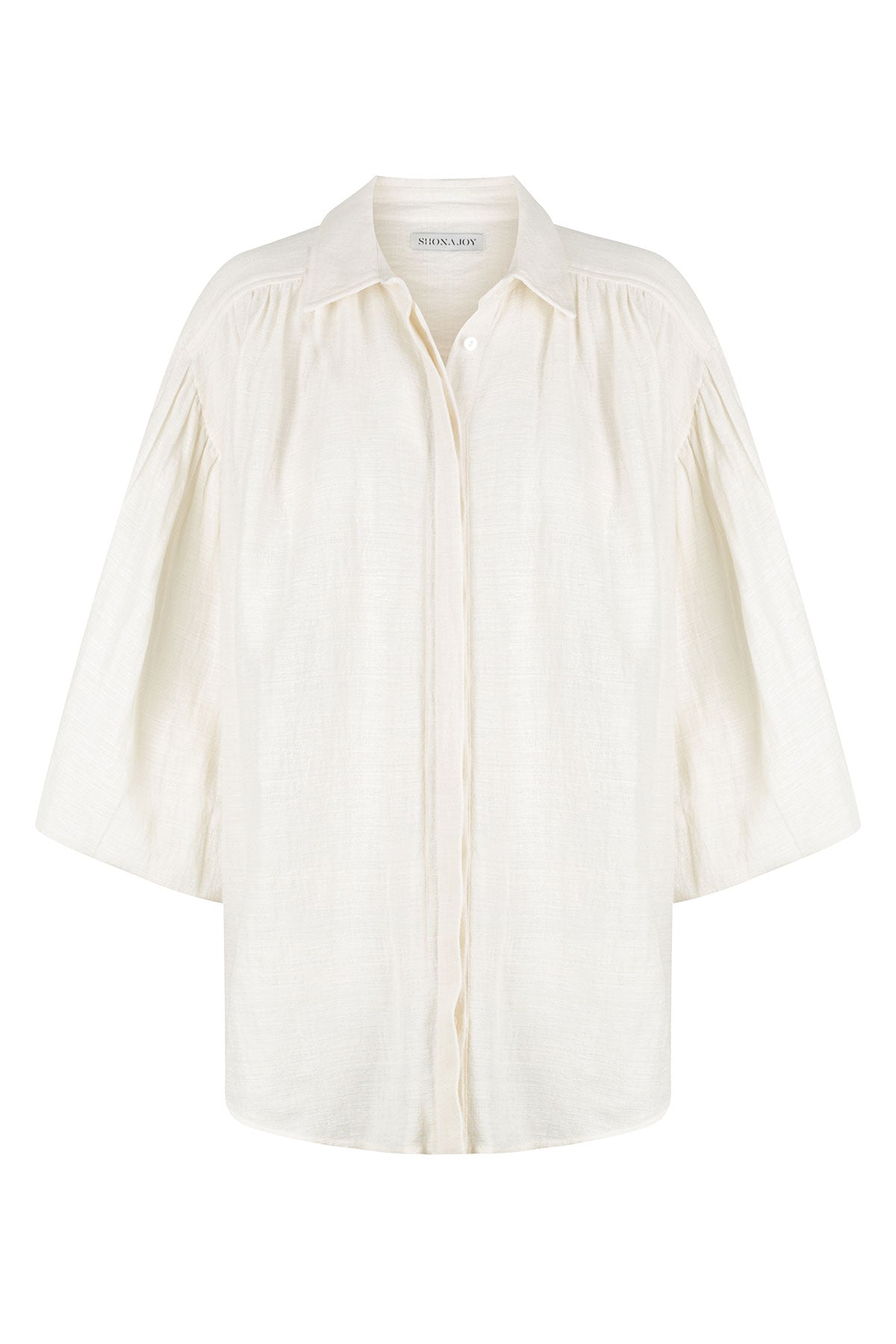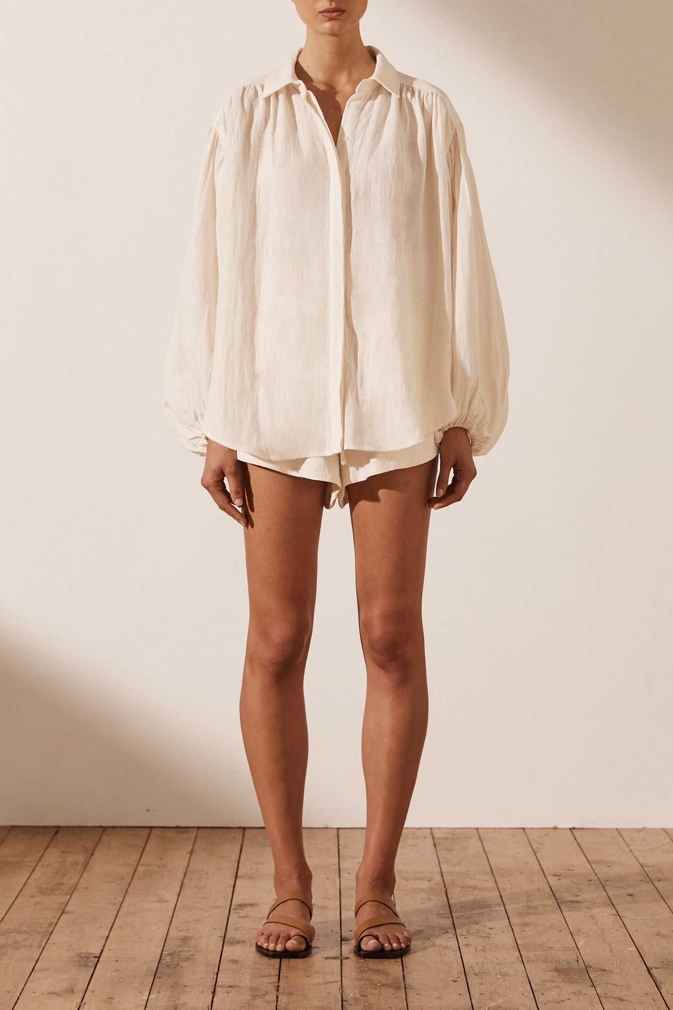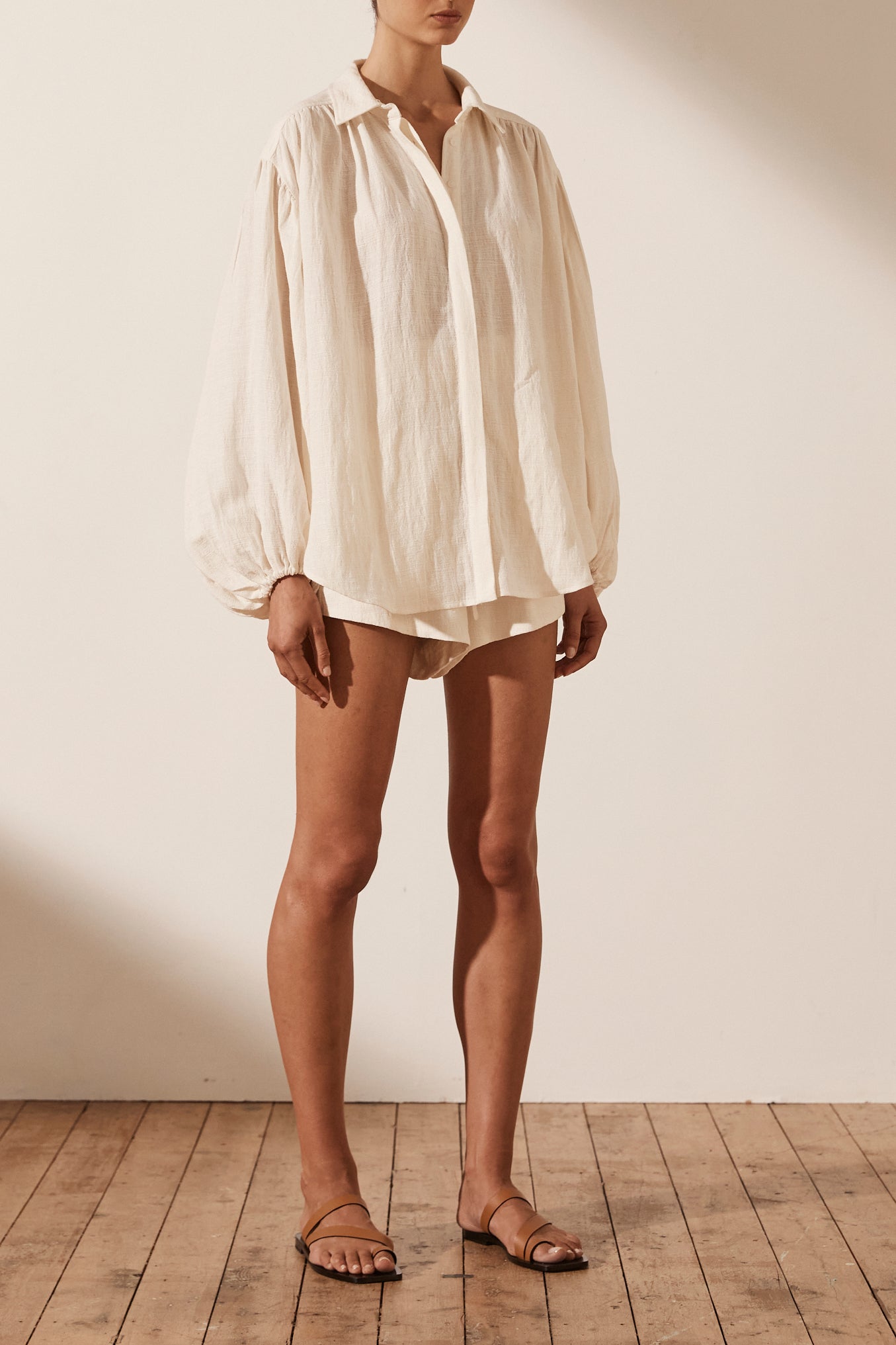 Textured linen cotton blend Spread collar Front button tab closure Balloon sleeve with elasticated cuff Curved hem Medium weight, non-stretchy woven 37% Viscose 32% Cotton 31% Linen Designed in Australia Made in China 37% Viscose 32% Cotton 31%...Read more