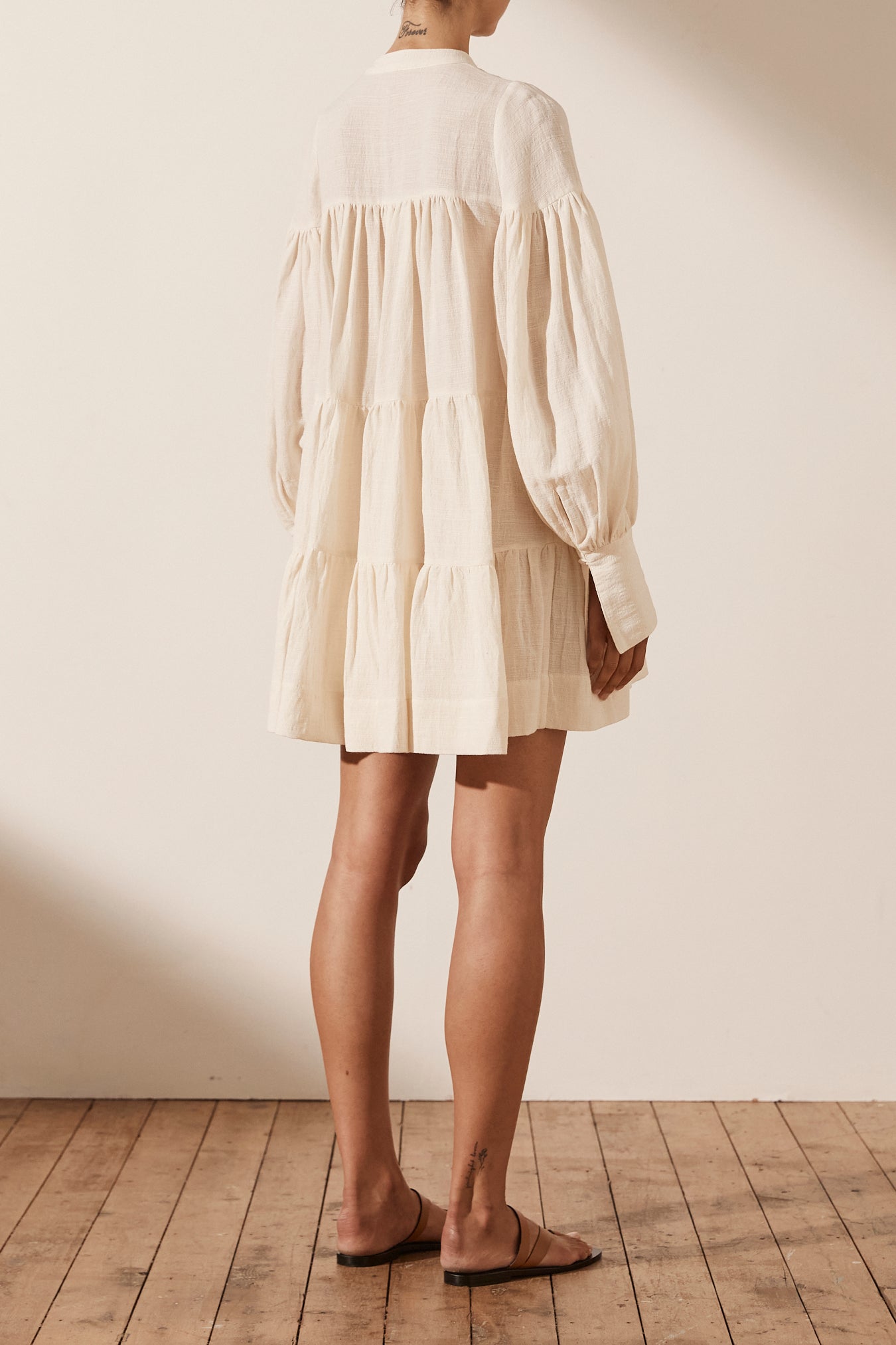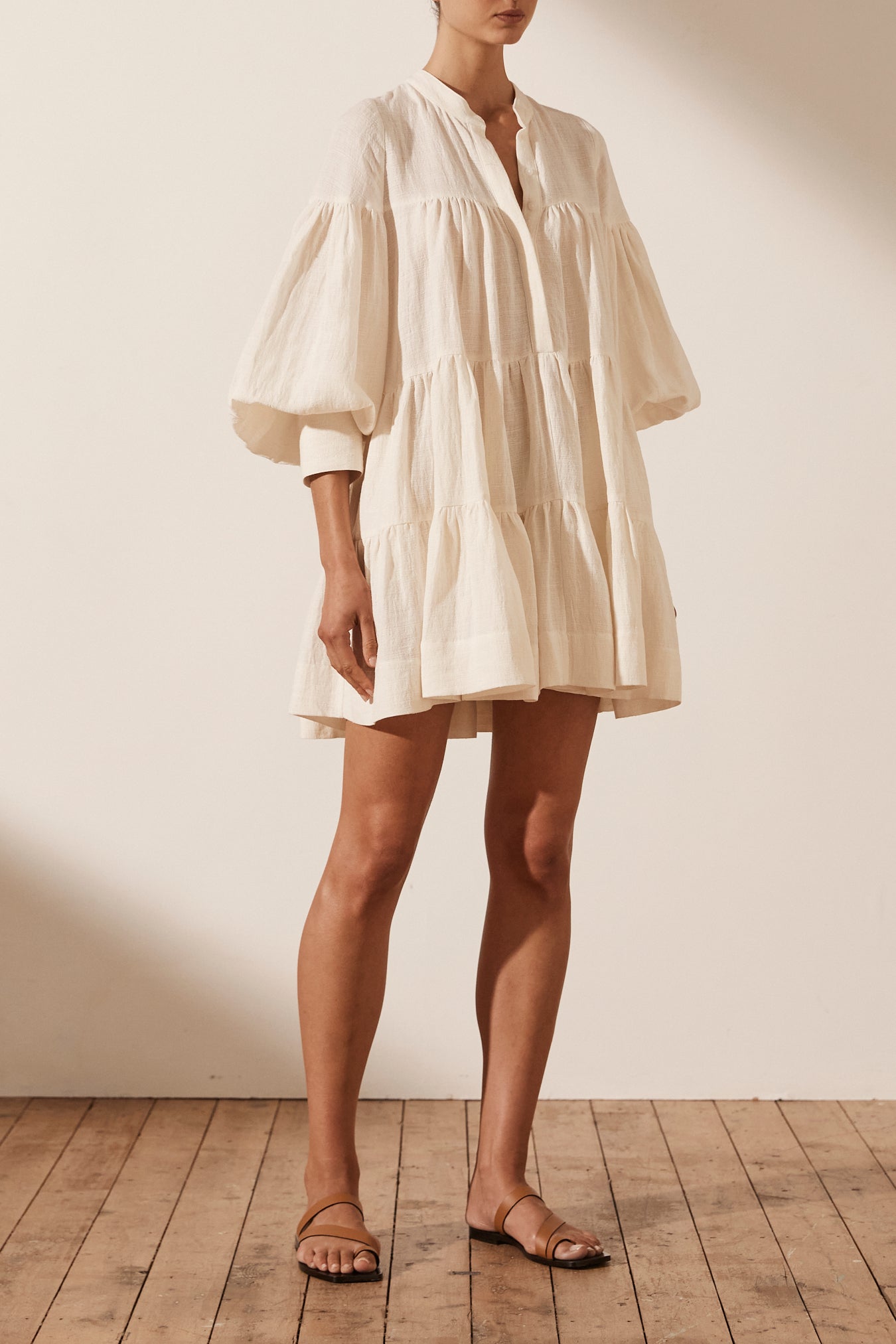 Balloon sleeve tiered mini dress in a textured linen blend.