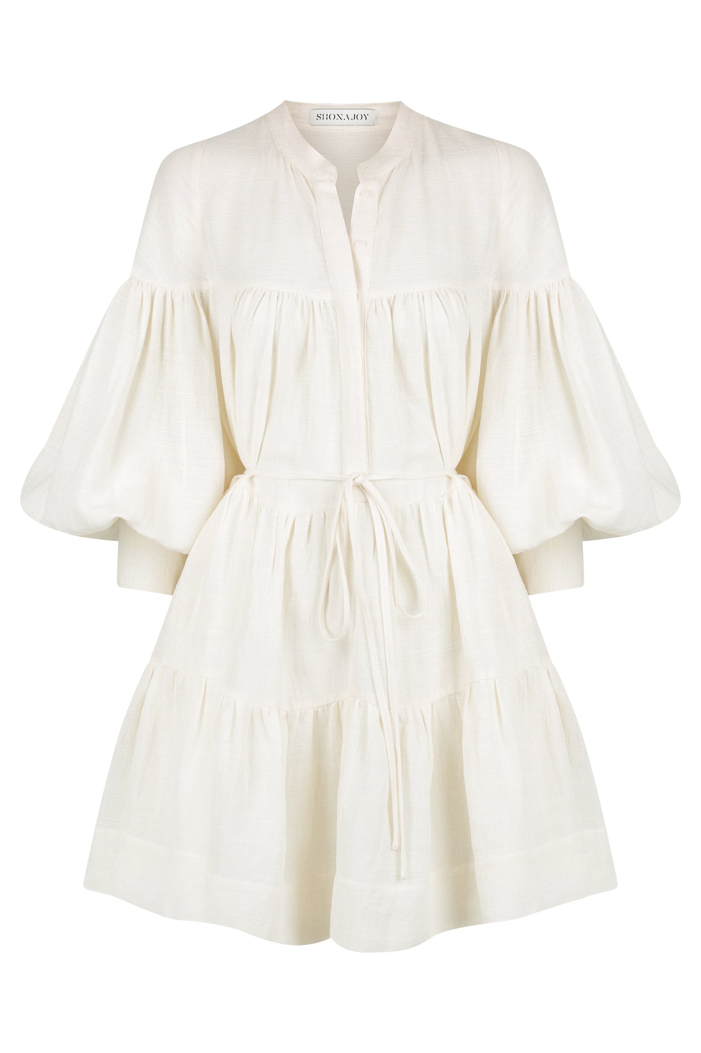 Balloon sleeve tiered mini dress in a textured linen blend. Textured linen cotton blend Stand collar Button front tab closure Removable self tie belt Balloon sleeve with buttoned cuff Side pockets Mini length tiered skirt Medium weight, non...Read more