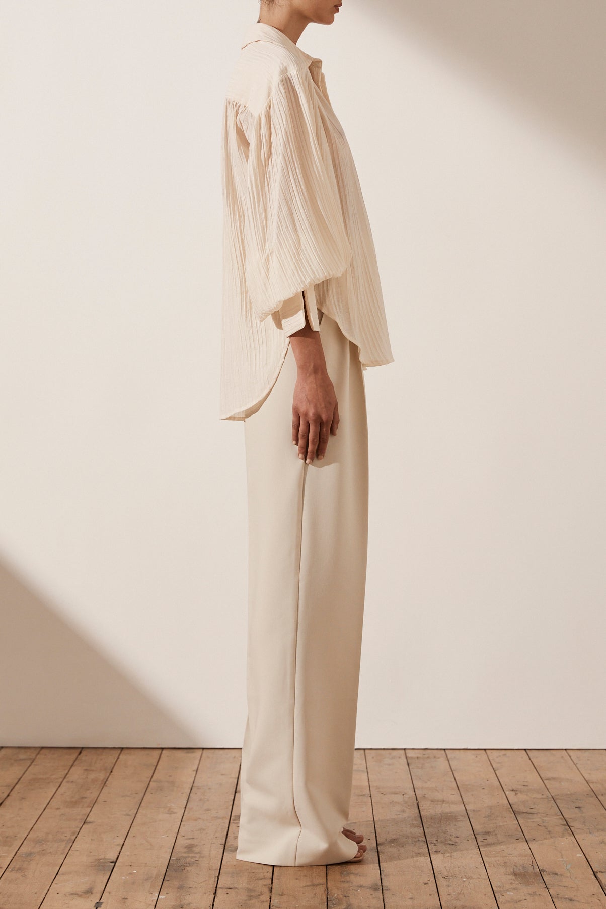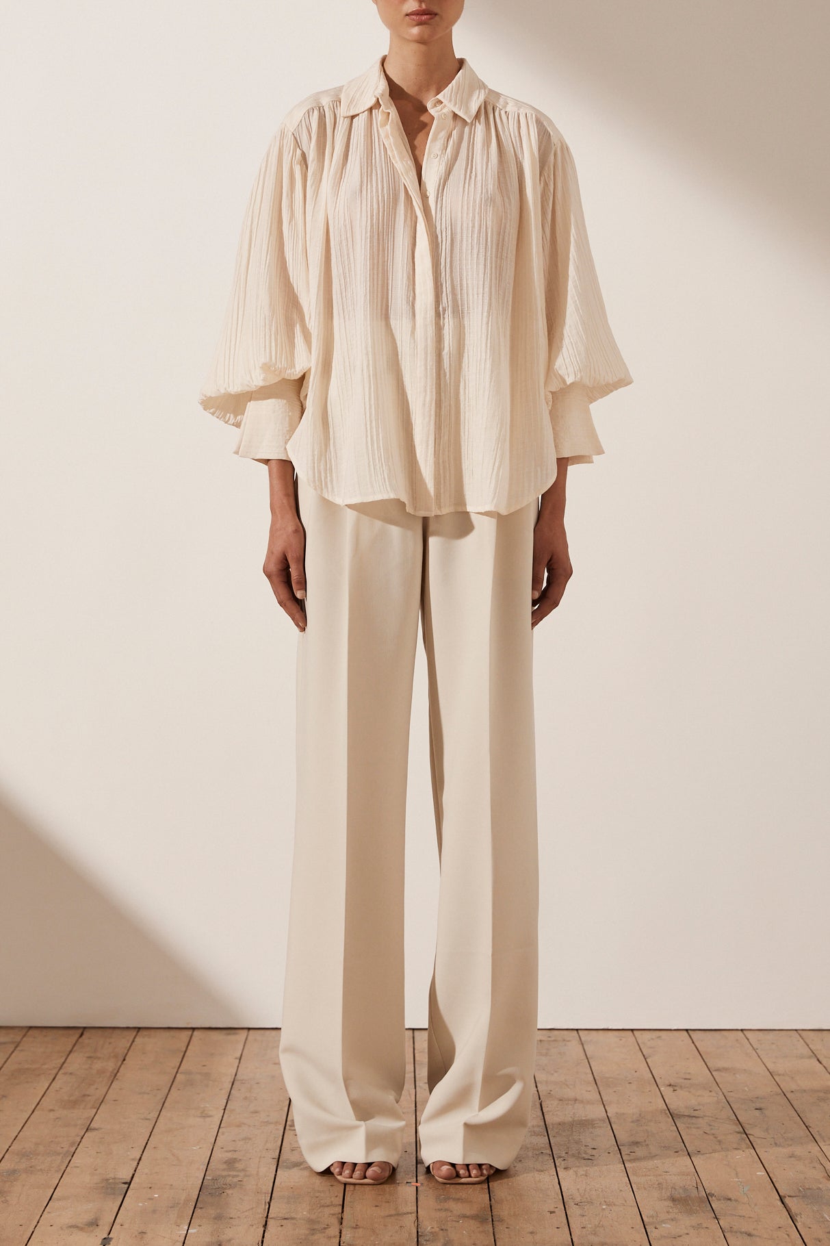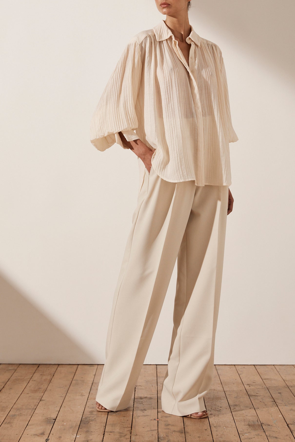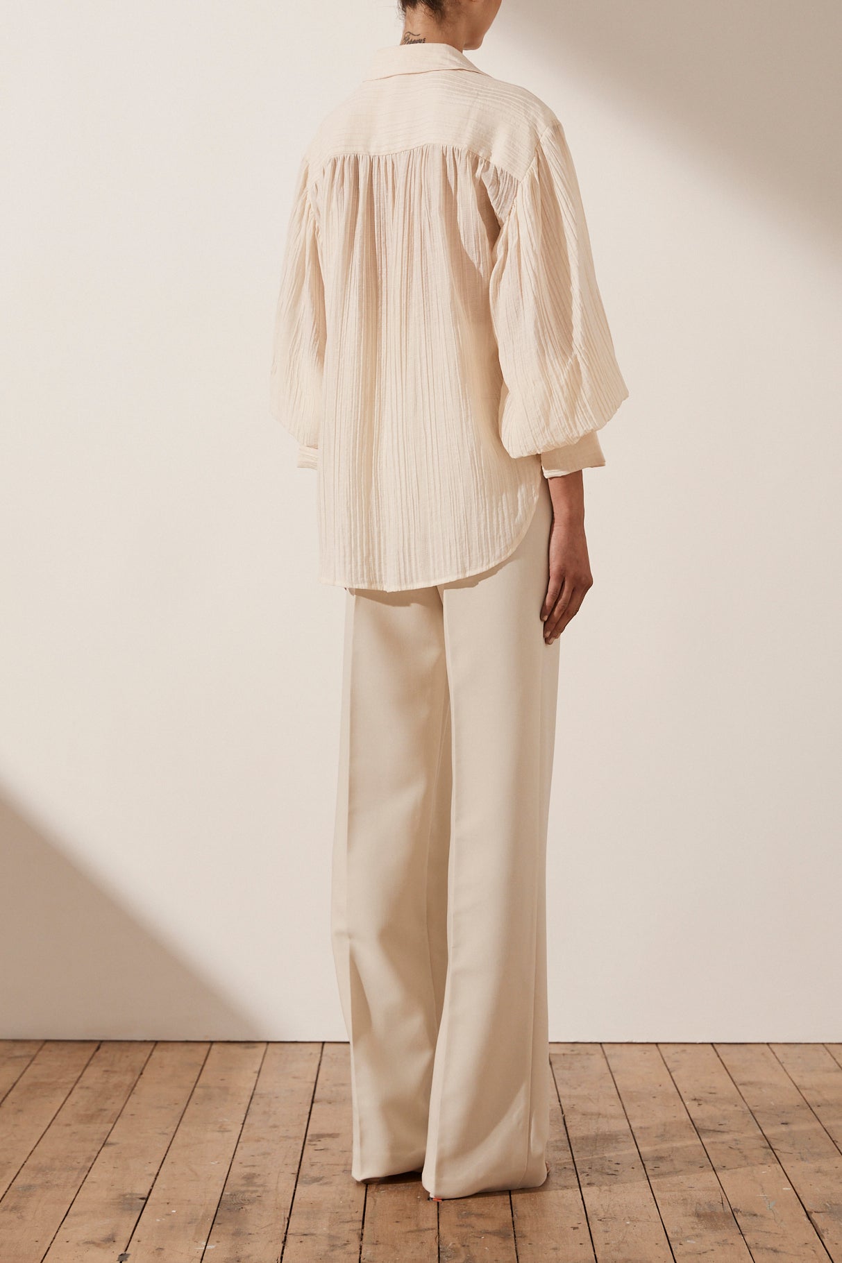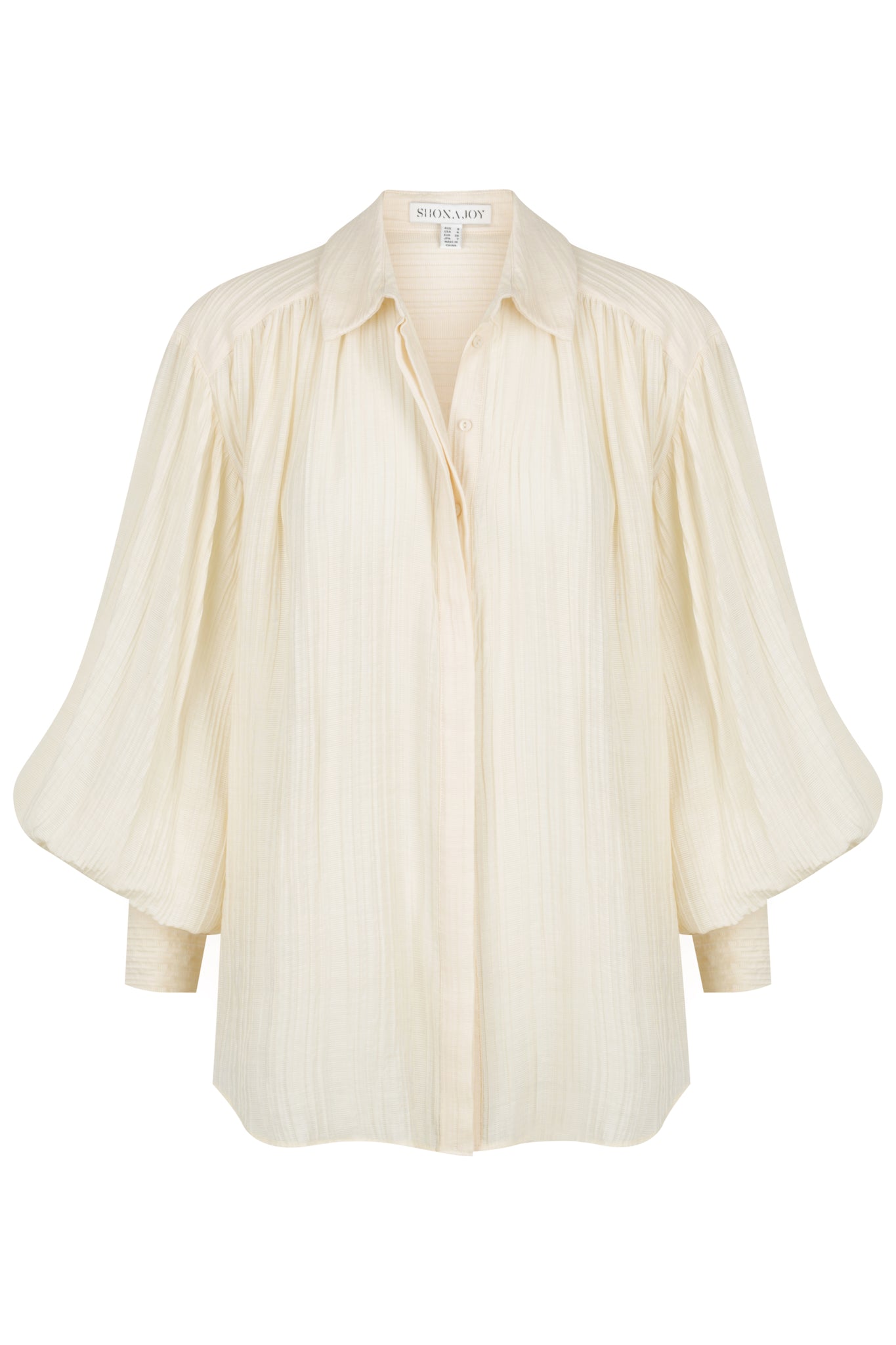 High neckline Spread collar Front button tab Balloon sleeves with button cuffs Curved hem Self stripe fabrication Light weight, non-stretchy woven 100% Cotton Lined Designed in Australia Made in China Our model wears a AU6/US2 Model’s height:...Read more