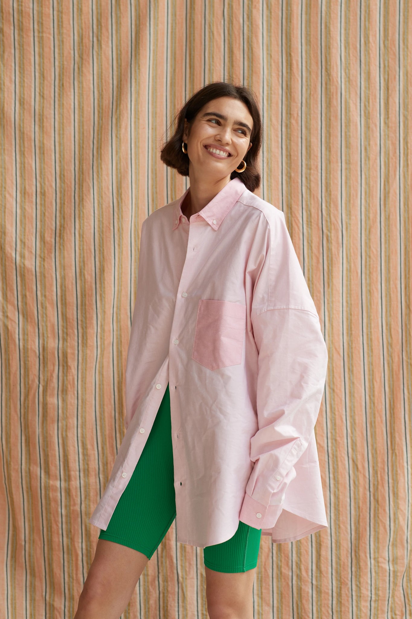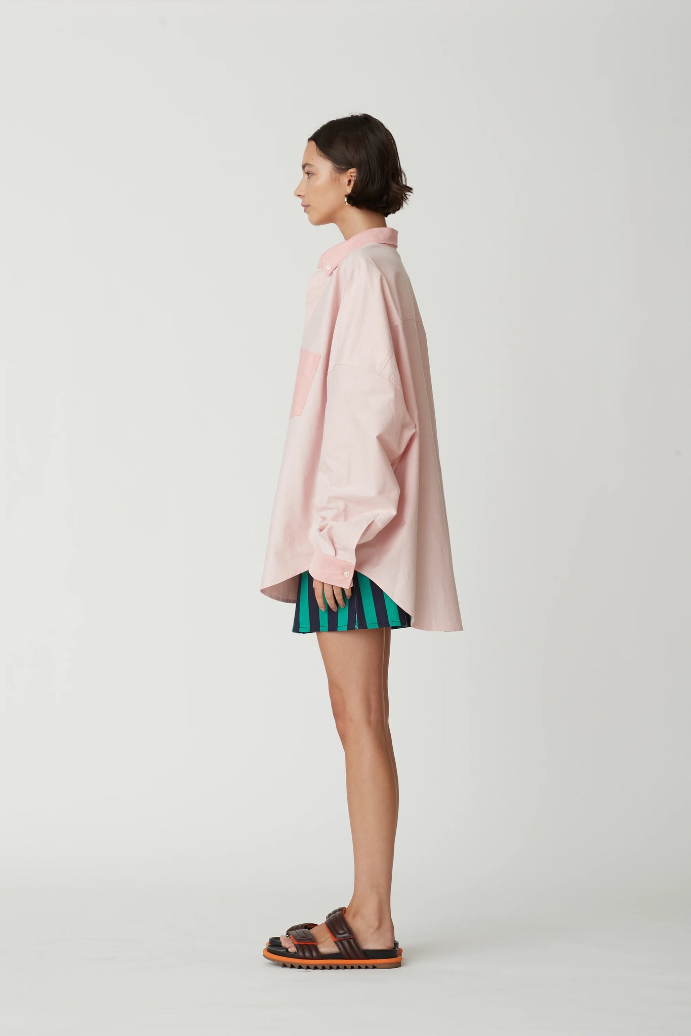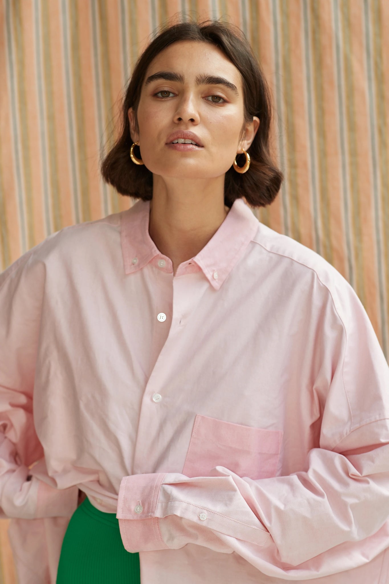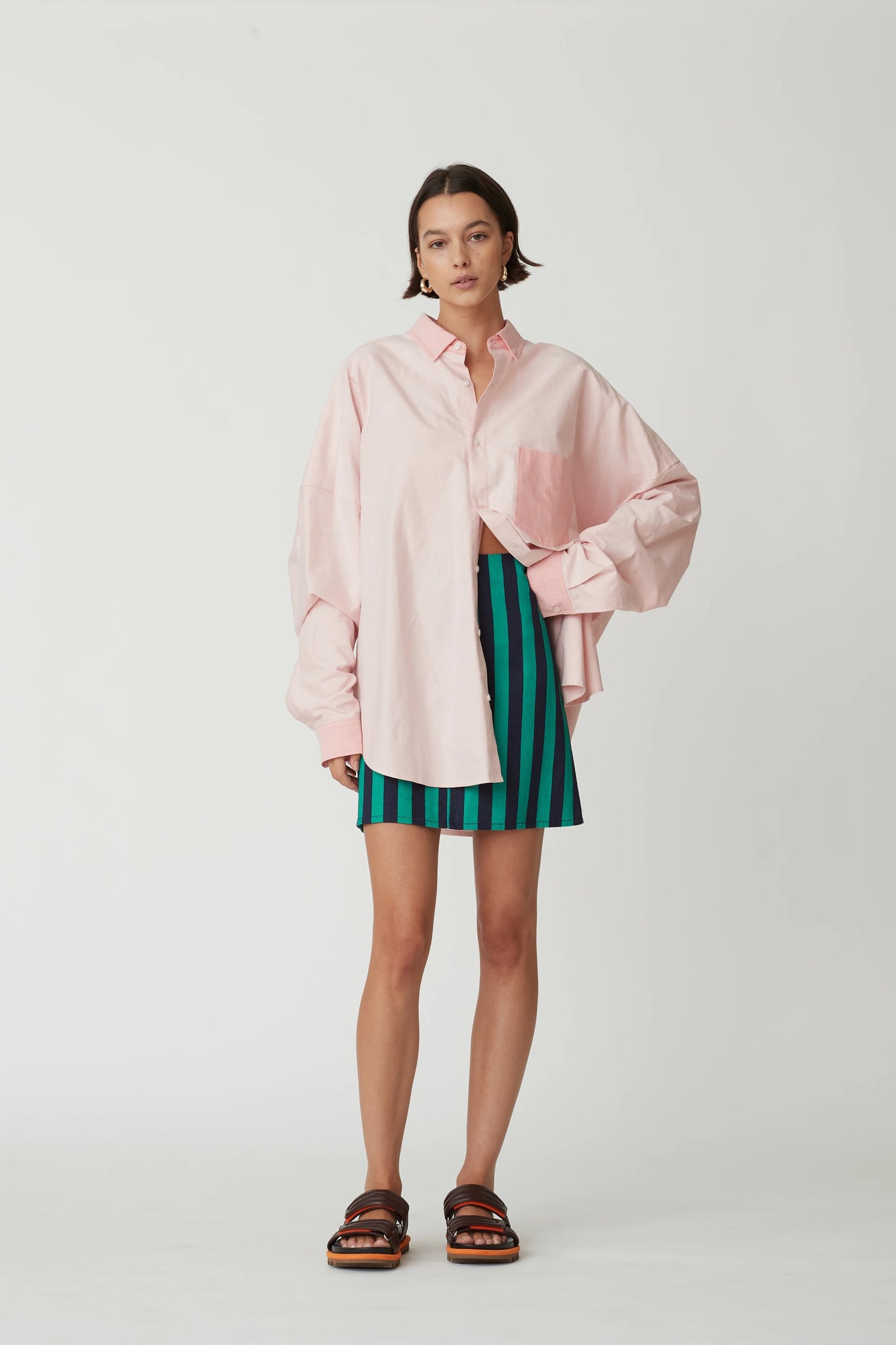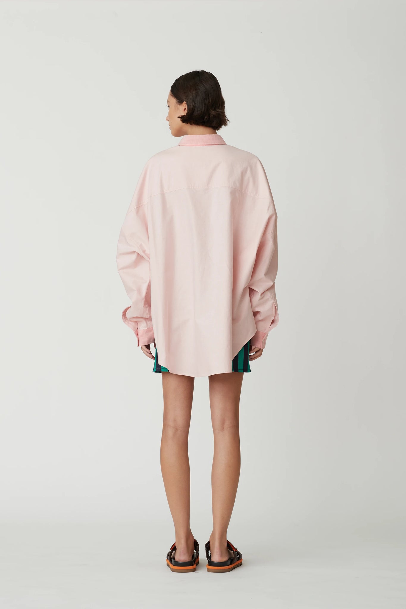 In a heavier weight cotton, the Dora Shirt features an oversized boyfriend fit with a curved hemline in a soft green.