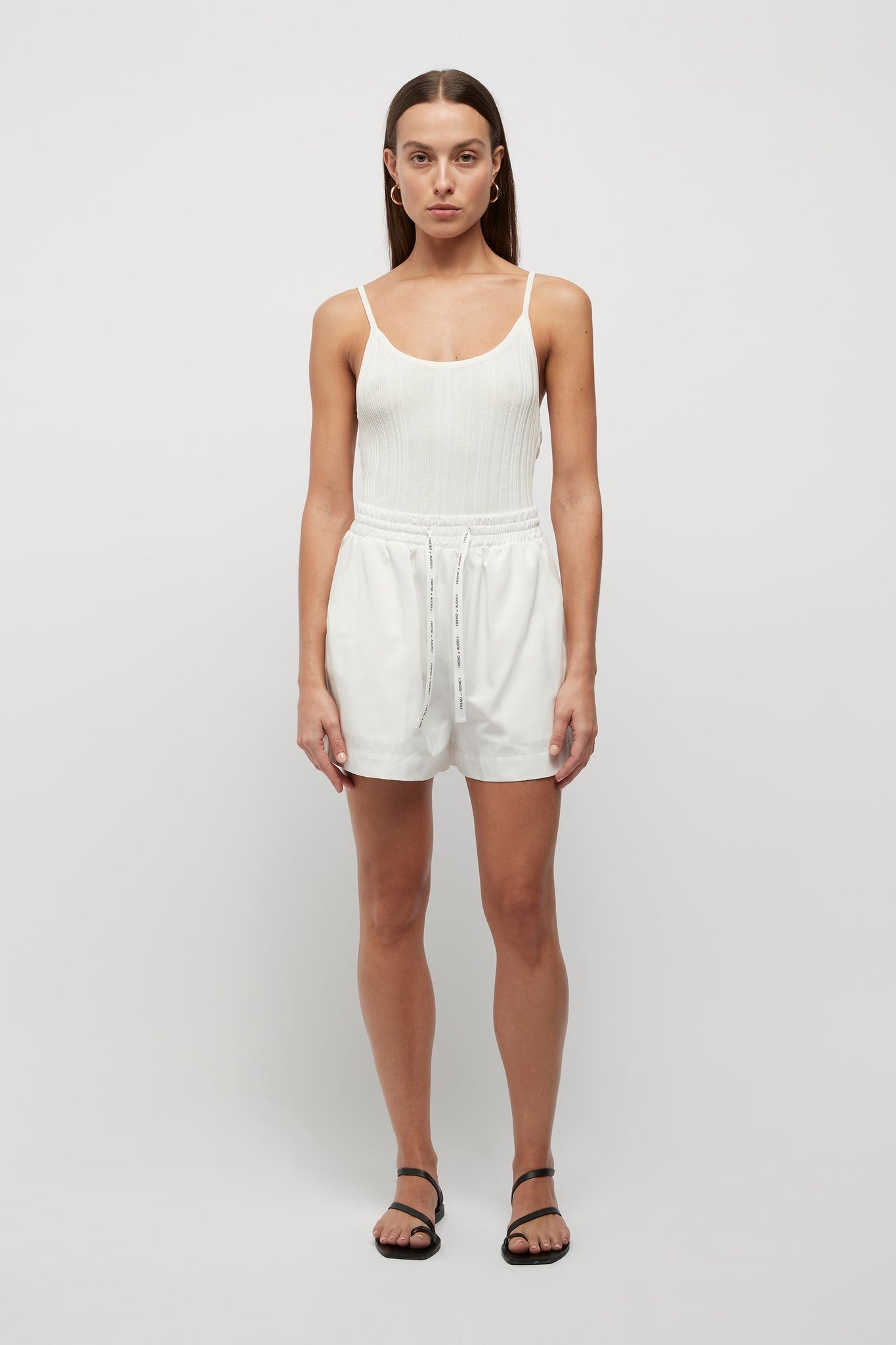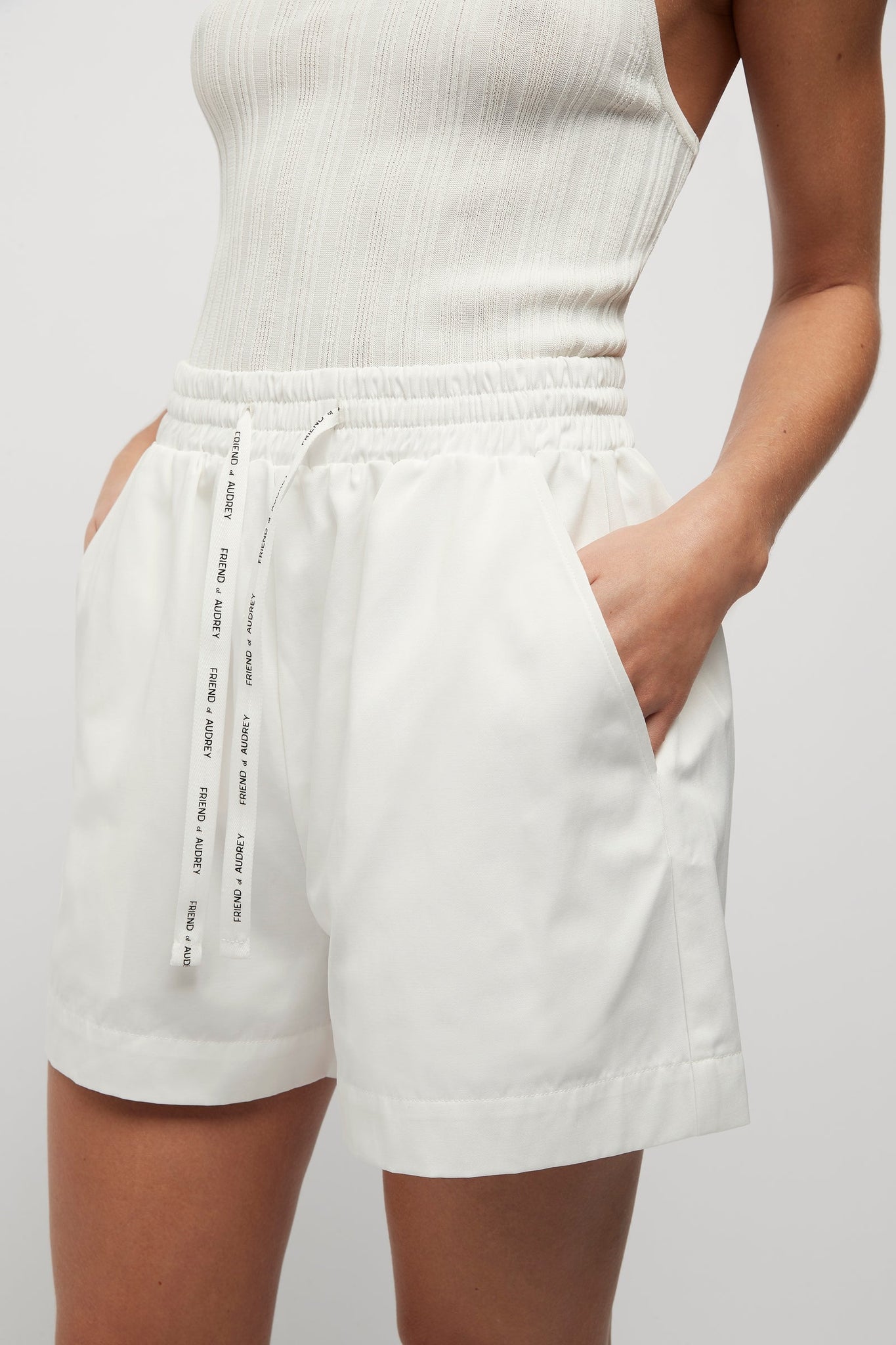 A relaxed white short, cut from crisp 100% cotton poplin fabrication. Features our signature Friend of Audrey printed drawstring and an elastic waist.