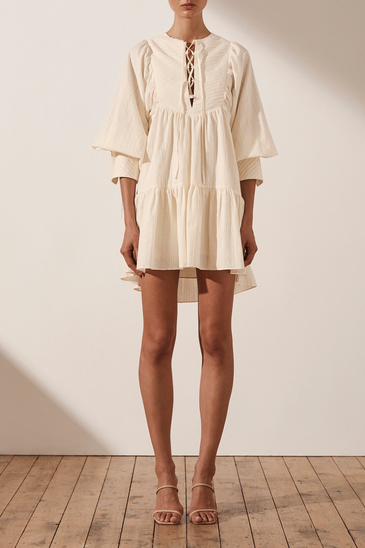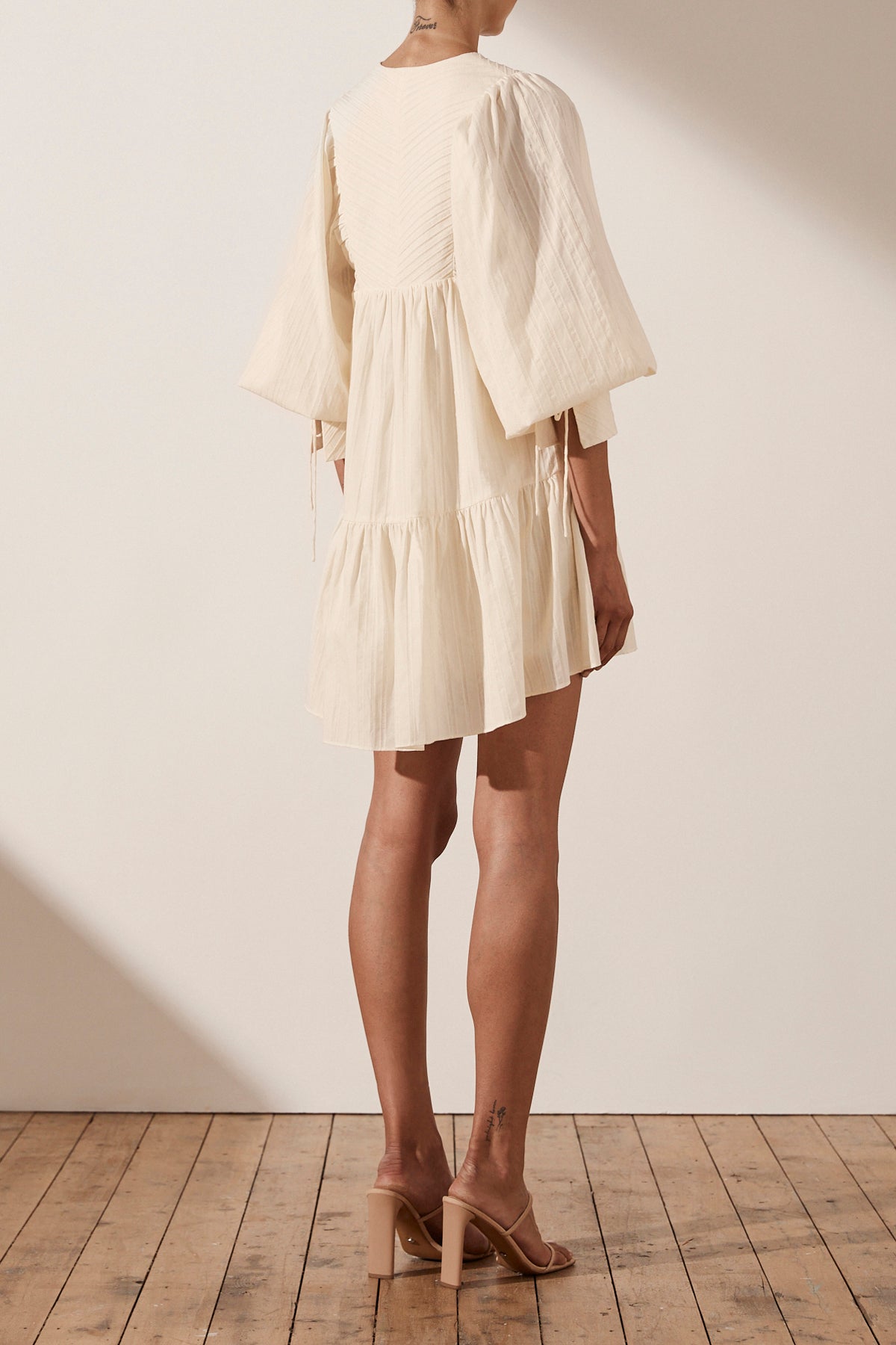 High neckline Pin tuck detail on yoke Drawstring at front Balloon sleeve with rouleau ties Mini length style Light weight, non-stretchy woven Lined 100% Cotton Designed in Australia Made in China Our model wears a AU6/US2 Model’s height:...Read more