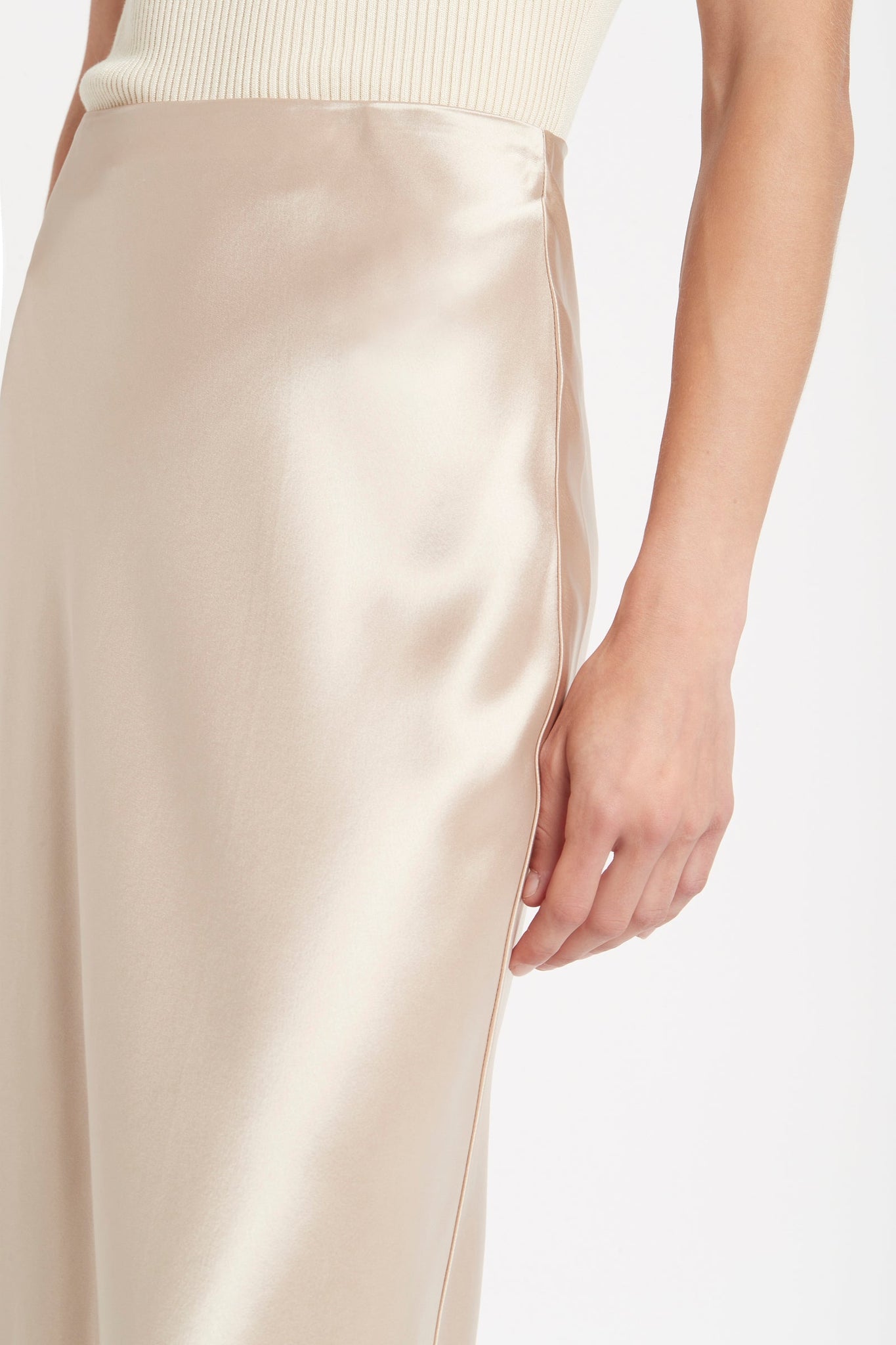 Friend Of Audrey chic bias cut midi skirt designed in a silky fabrication with an elastic waist. A core wardrobe item.Midi lengthInternal elastic waistSilky fabricationUnlined This garment runs true to size.Garment length: 81.5cm (size AU 8) 77% Acetate, 23%...Read more