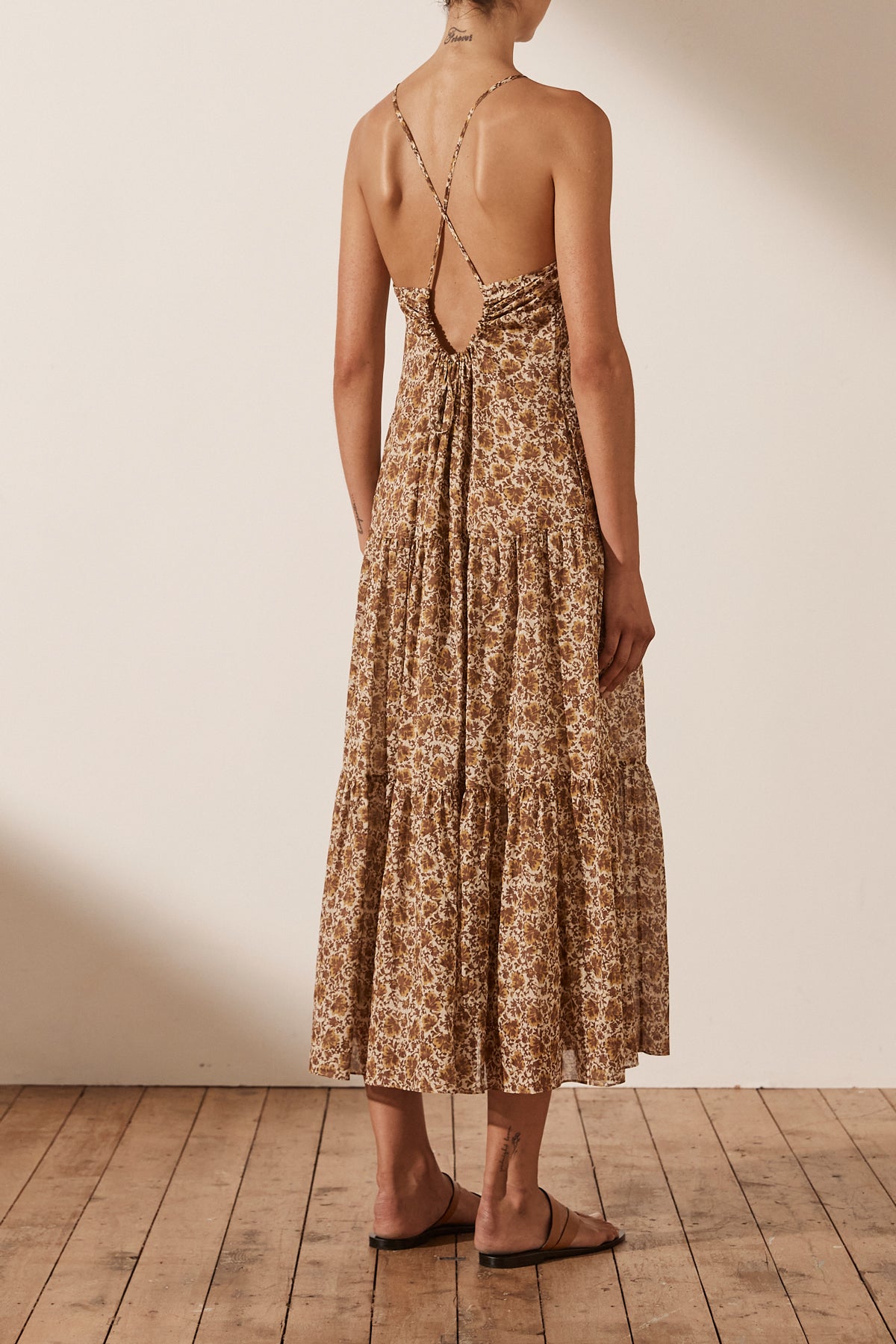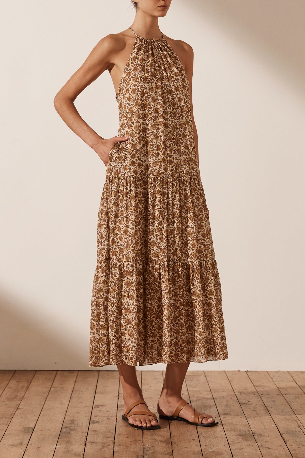 Halter midi dress in the exclusive Fauna print. Soft and breathable cotton voile Exclusive Fauna print Halter neckline Tie back cross over straps with drawstring tie Side pockets Tiered midi length skirt Light weight, non-stretchy woven 100% Cotton...Read more