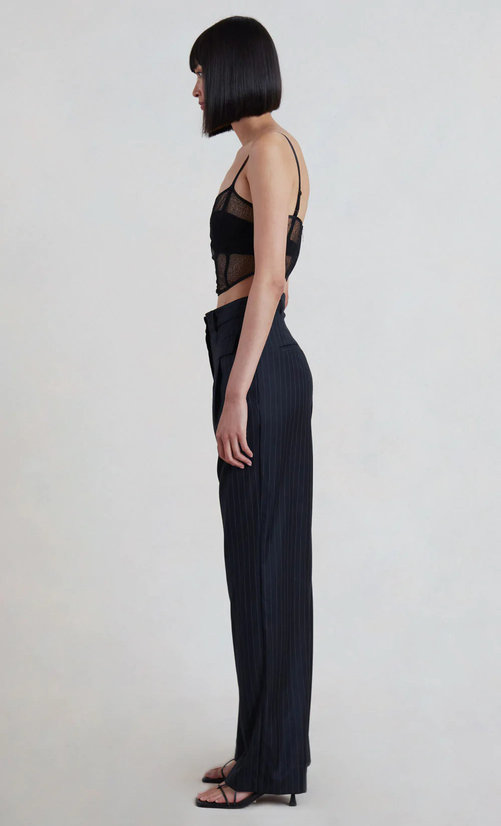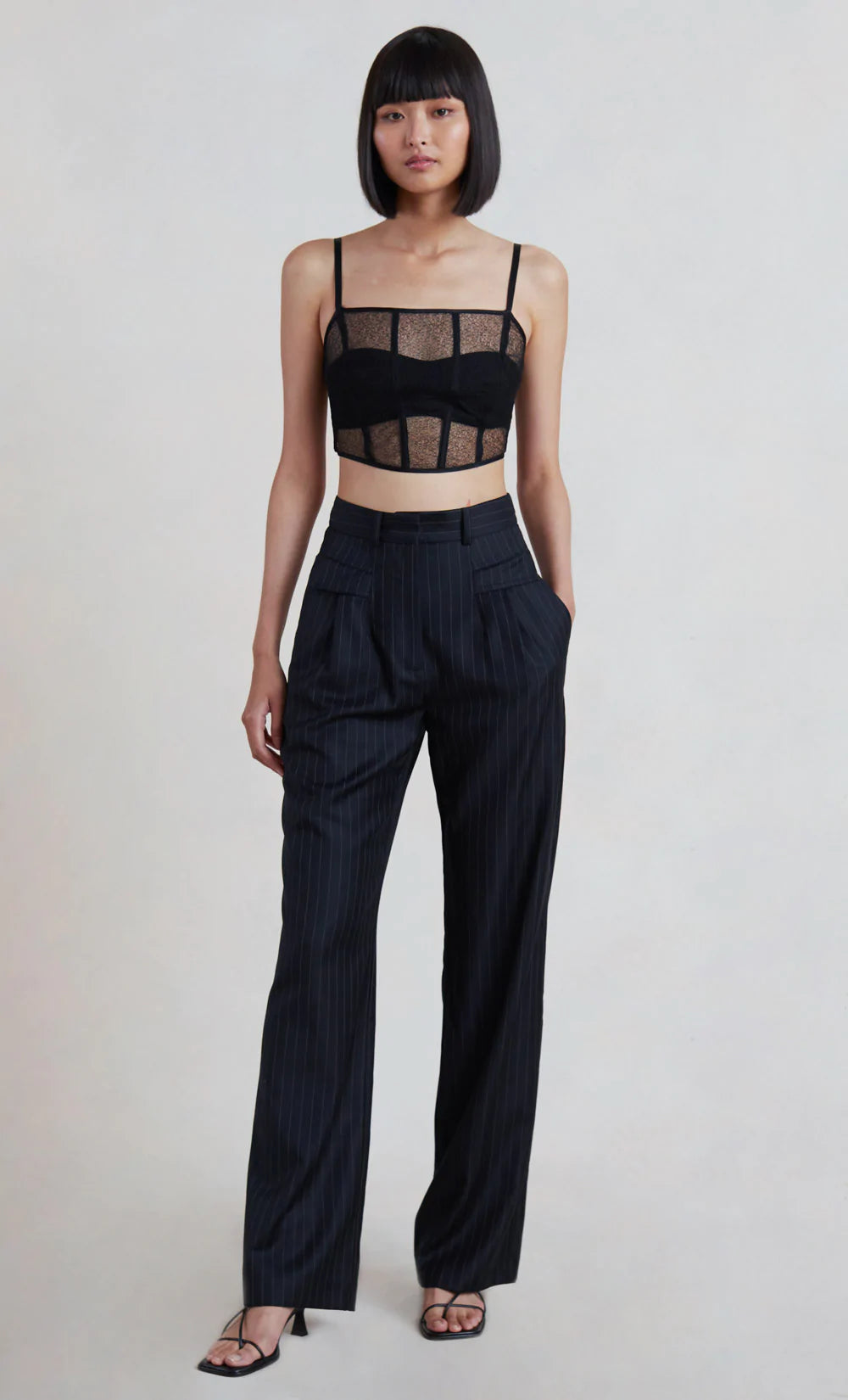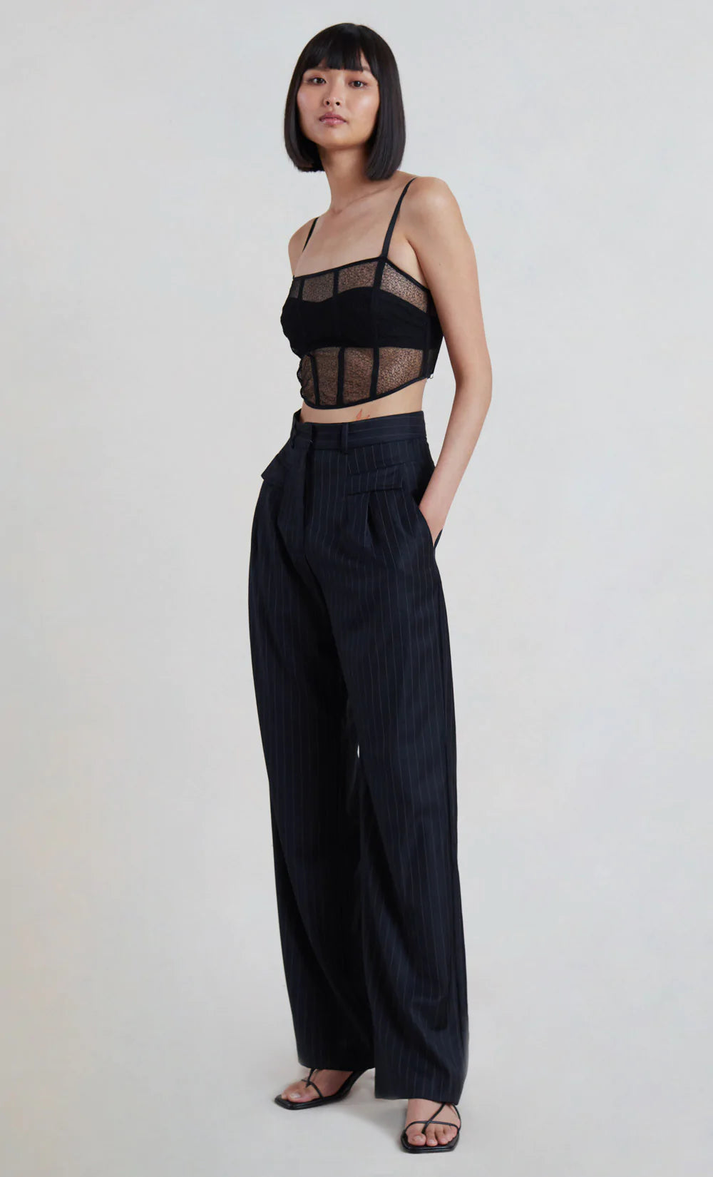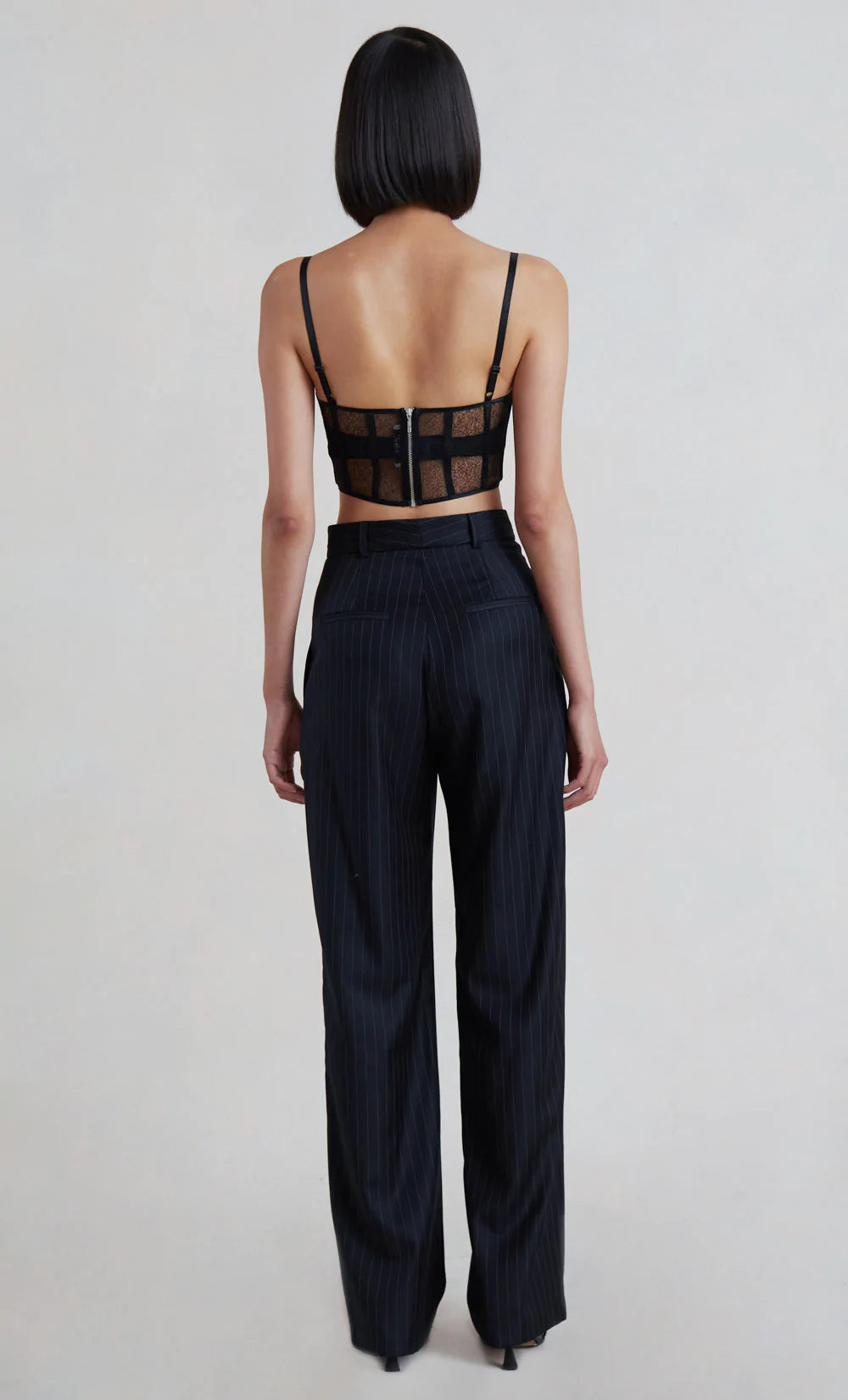 A feminine cropped style, the Gabriella Corset features a built-in bra with adjustable straps, boning and a flattering square neckline. The lace corset is finished with an exposed metal zipper at back. Styled with our Alicia Pant.