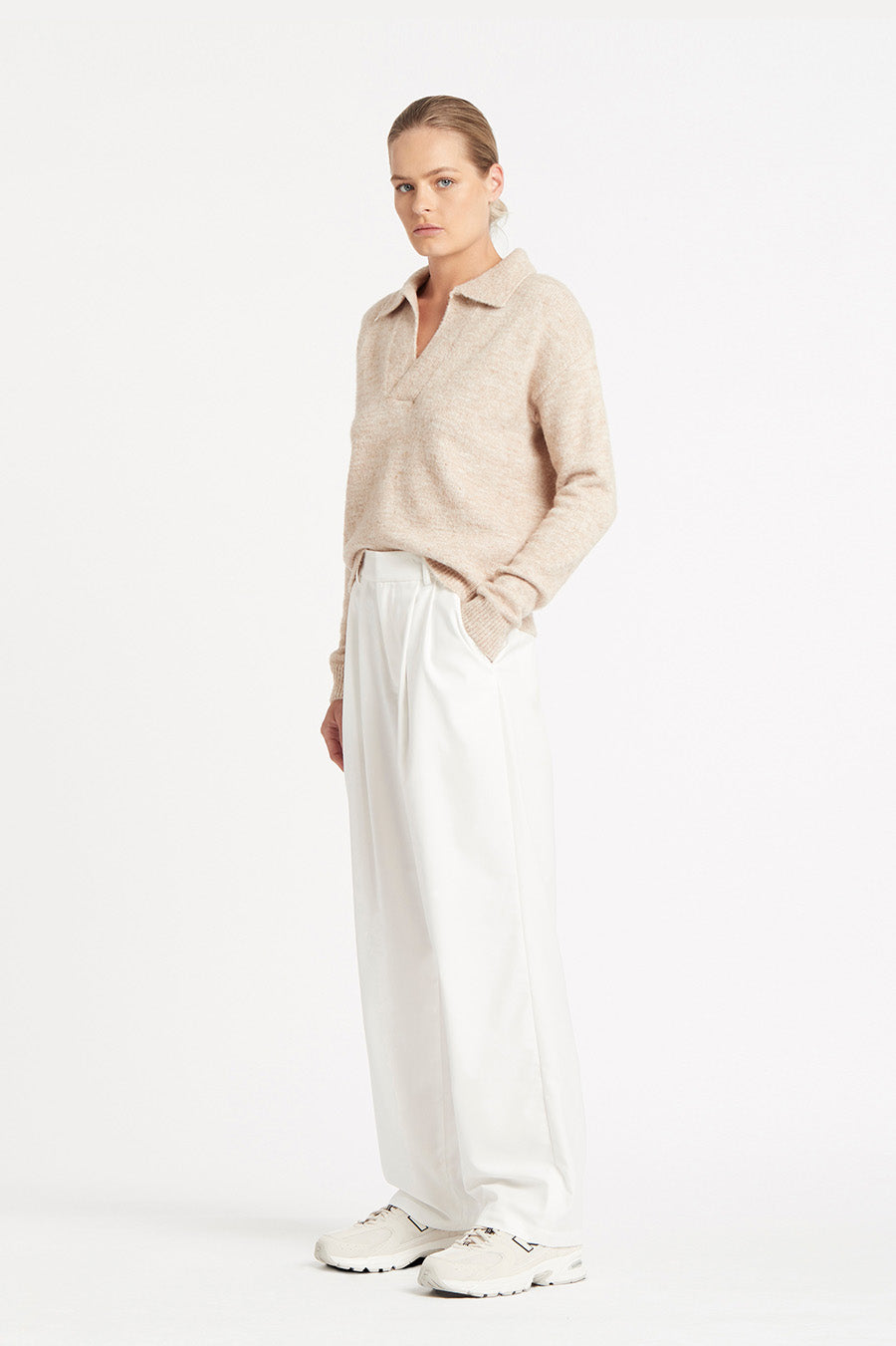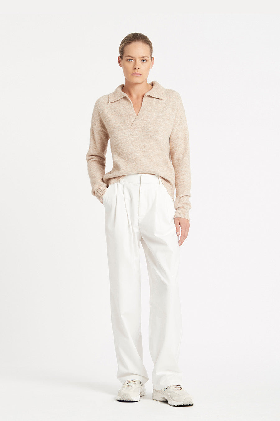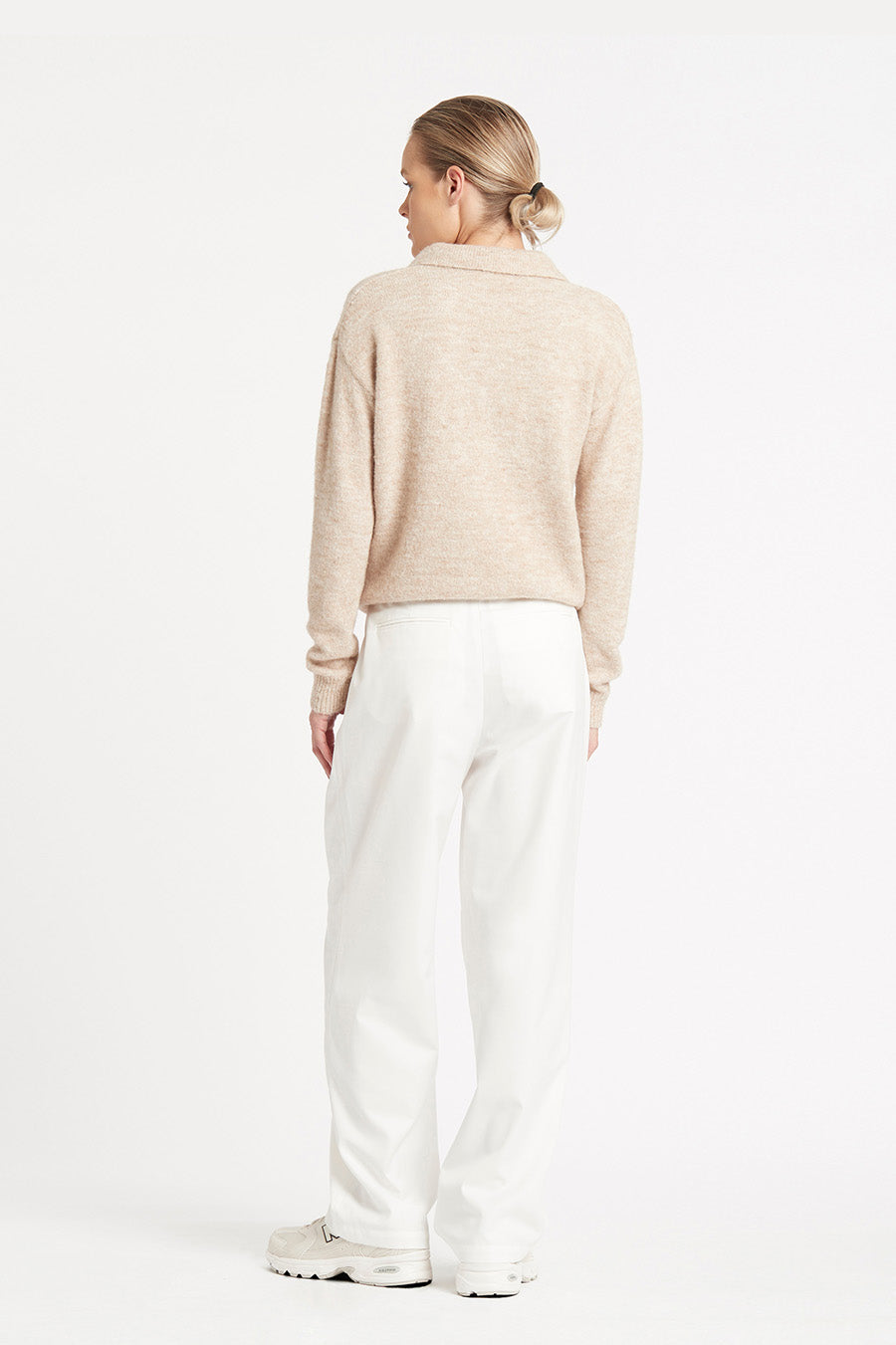 A soft knit top designed in a relaxed polo style. Features a collar and long sleeves.