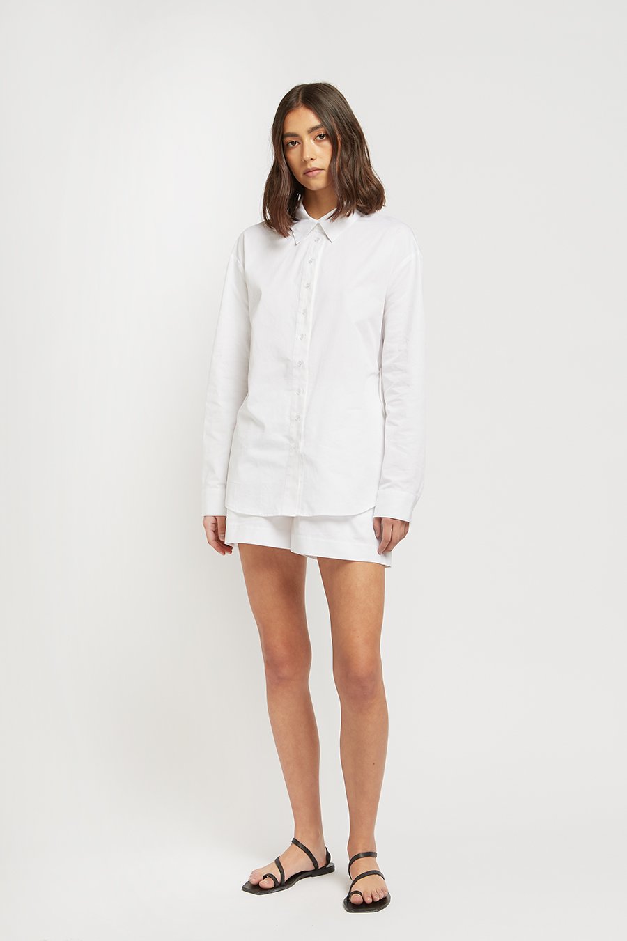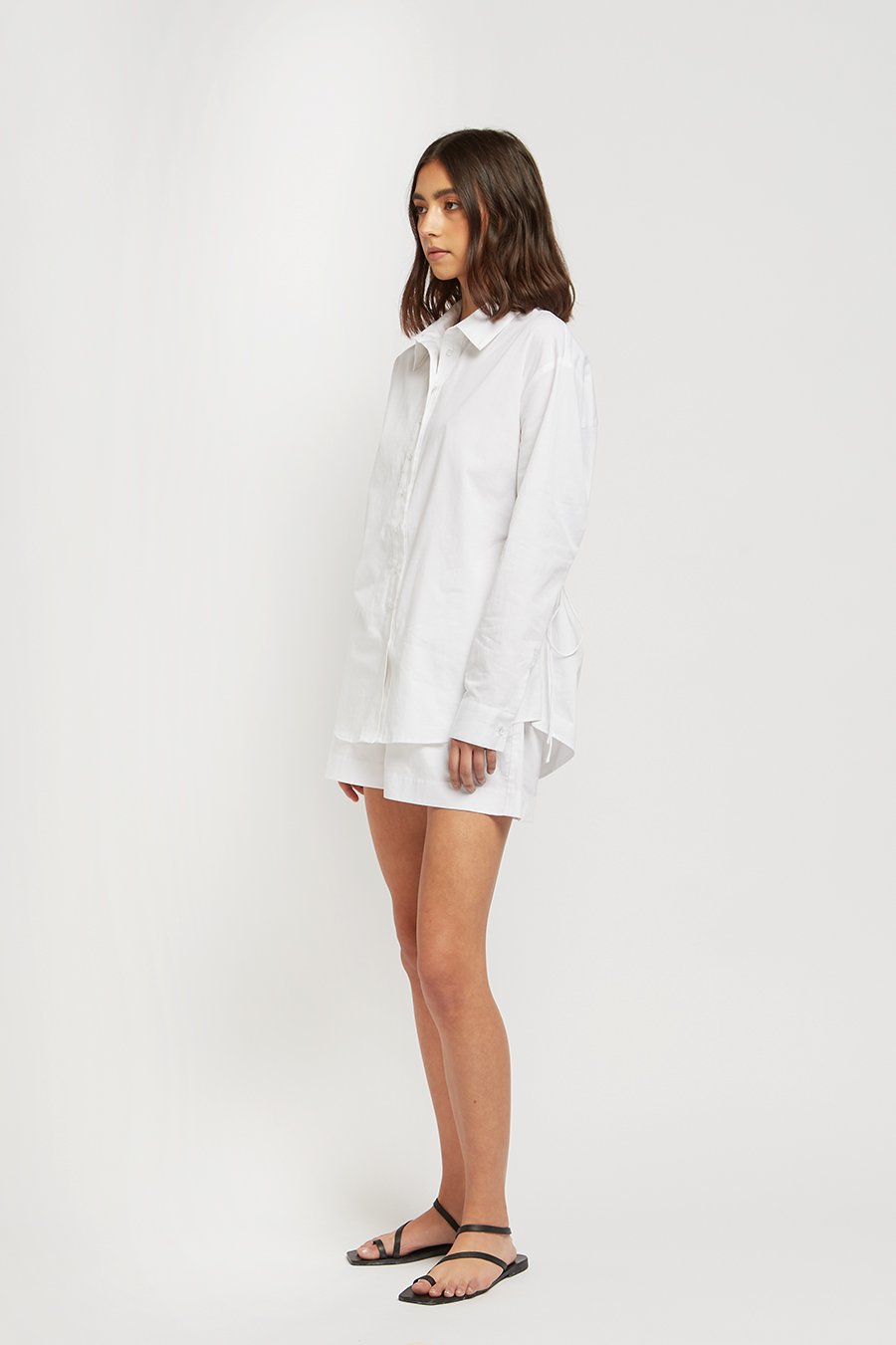A white shirt featured in 100% cotton. Rolled straps threaded through channels, gather the back cut out. Standard length Collar and stand Back cut out Gathered channels with rolled straps Unlined This garment runs true to size.Garment length:...Read more