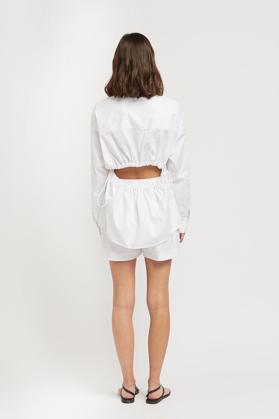 A white shirt featured in 100% cotton. Rolled straps threaded through channels, gather the back cut out.