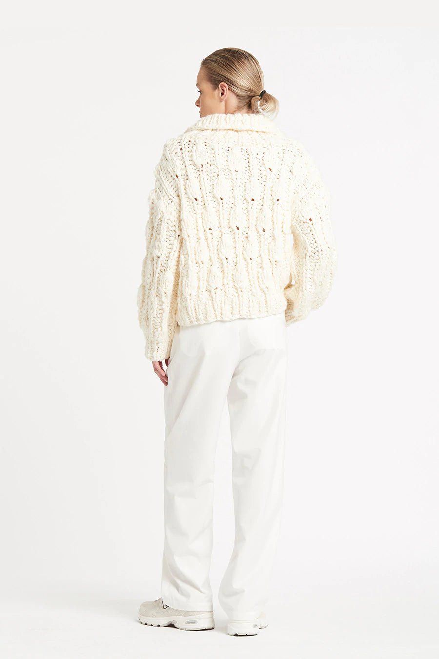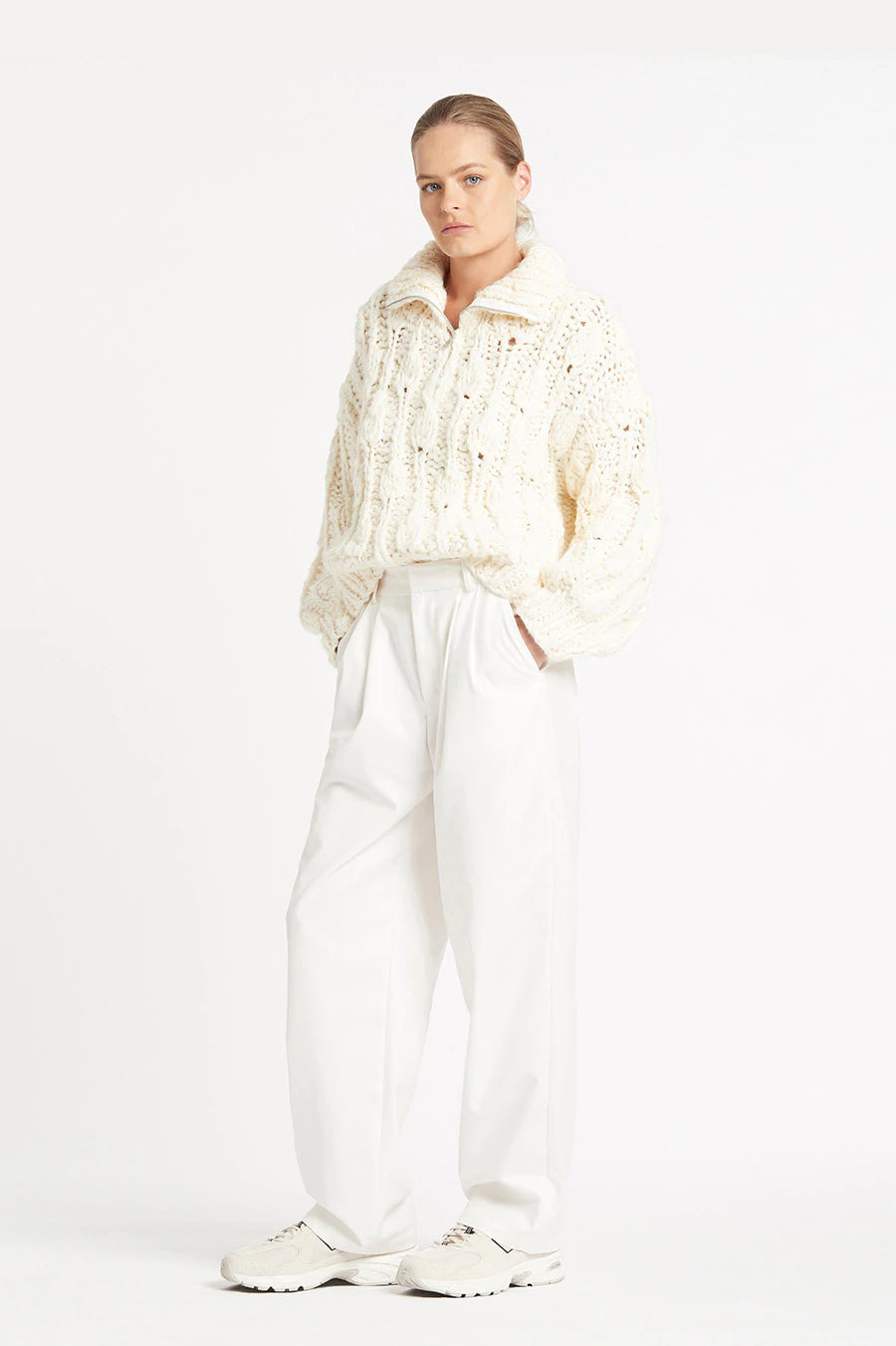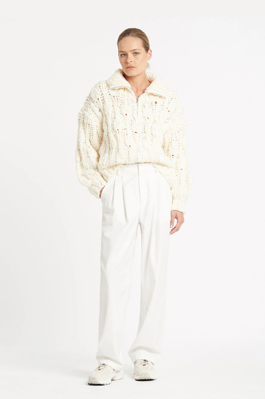 A luxurious wool-blend pullover, slowly knitted by hand, by local artisans. Featuring half zipper and large collar.Relaxed fitLarge collarHalf zipRelaxed sleevesWool-blend100% Hand knitted