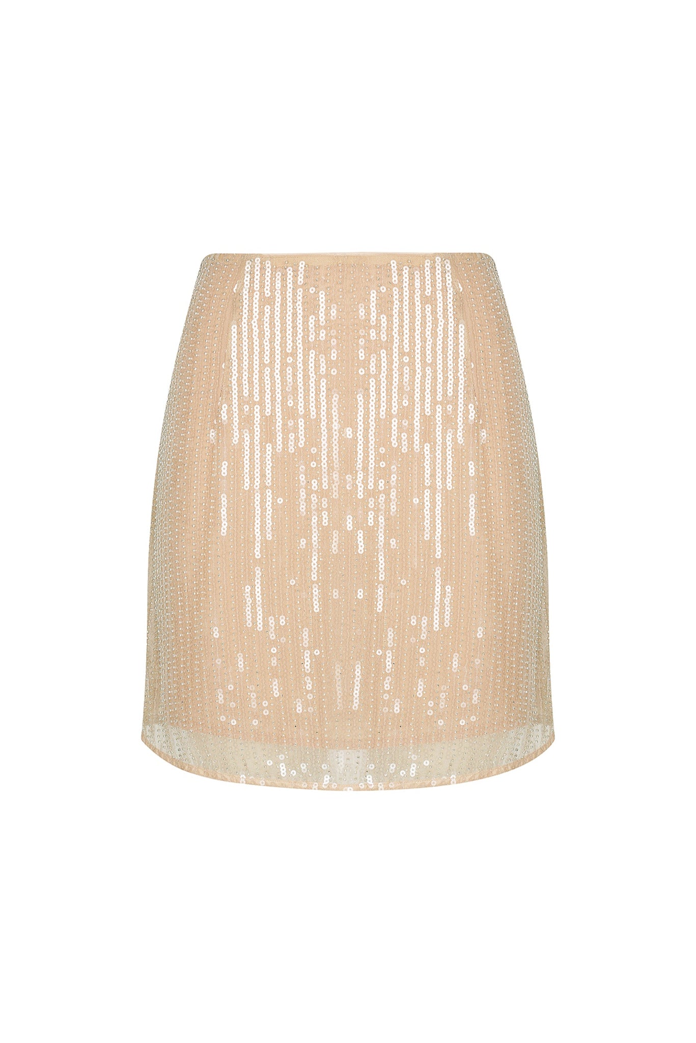 The Evie Skirt is a classic mini style skirt that is cut in our fully sequined and beaded nude fabric. The Perfect party skirt, it is lined all the way through and can be paired back with the Elsa Top for a matching look.