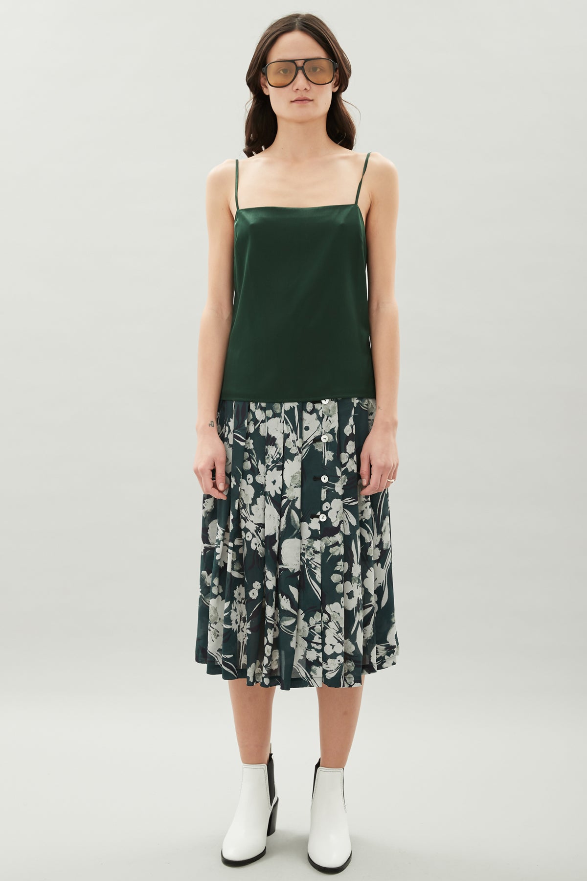 A long-line silk cami, with a square neckline and spaghetti straps, the Bambi silk top will add a touch of refinement to any outfit. In autumnal pine green and pearl, the Bambi silk top is a staple for the H&G girl. Model is wearing a size Small.
