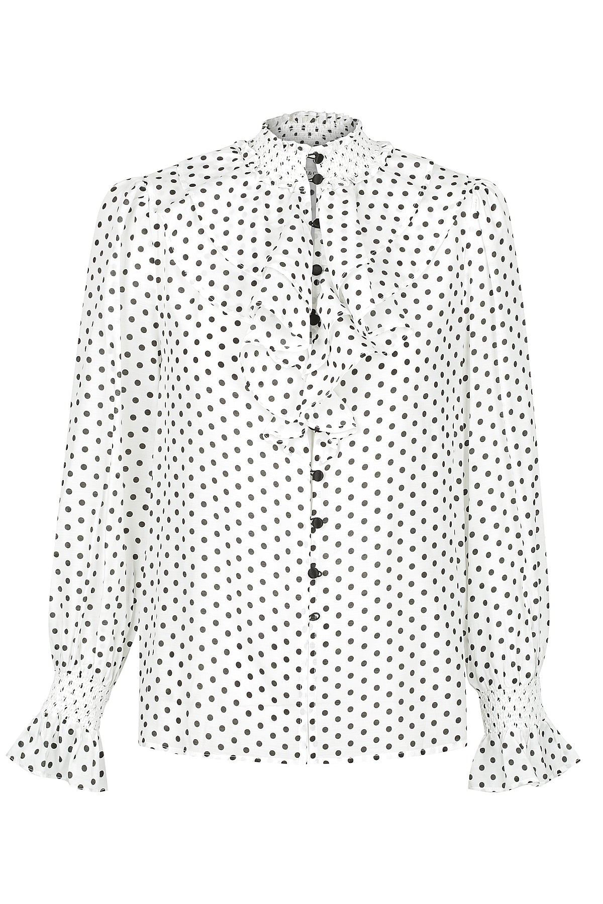 The Constance Shirt is a part of H&G’s exclusive racewear collection, cut in a black and white polka in a cotton silk blend. The shirt features a shirred collar and contrast black buttons down the front placket. With ruffles framing the front neckline this shirt can be worn with the Santos skirt for a matching look