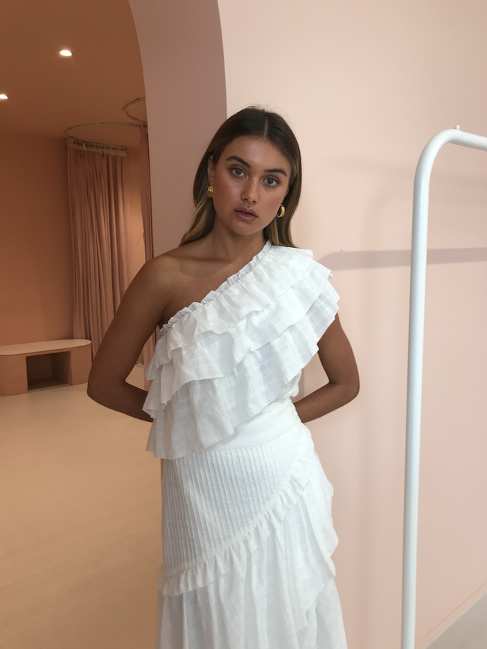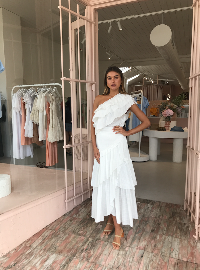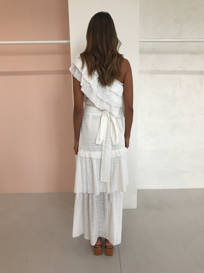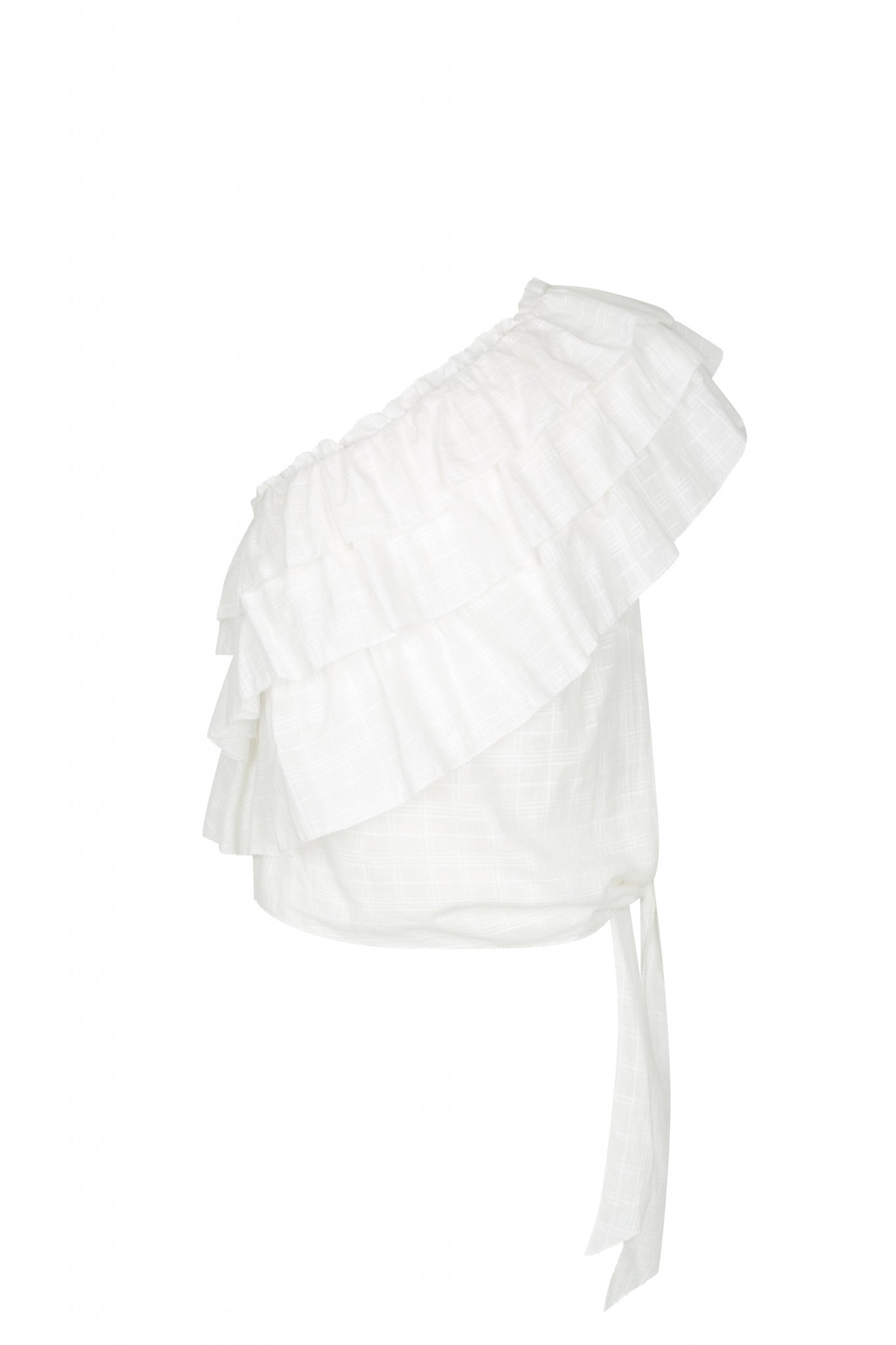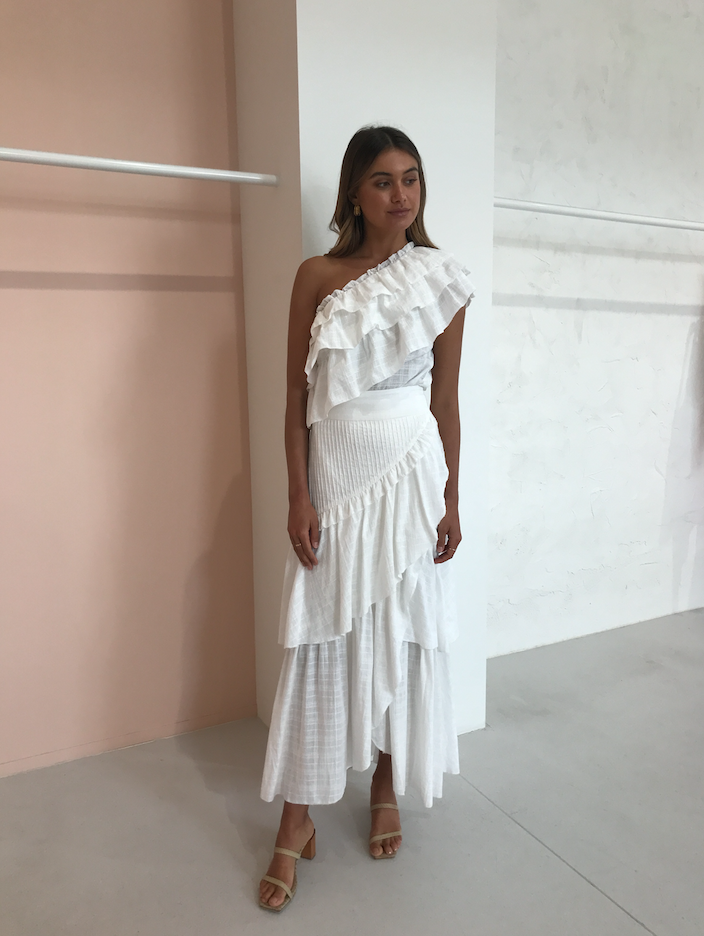 The Hansen and Gretel Cynthia Top is a one shoulder style cut in a white cotton check. With tiered ruffle detail across the body of the top and ties at the waist.