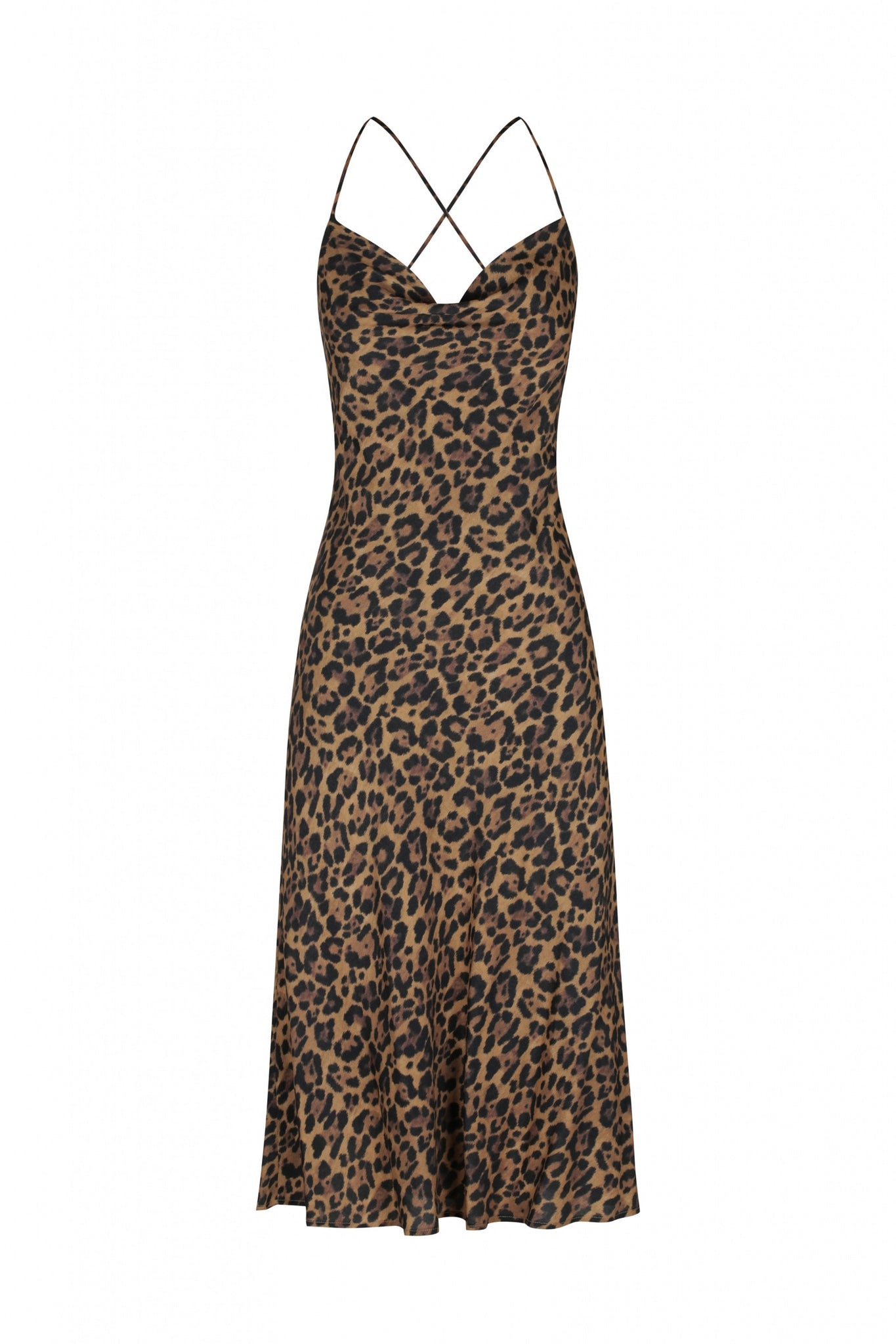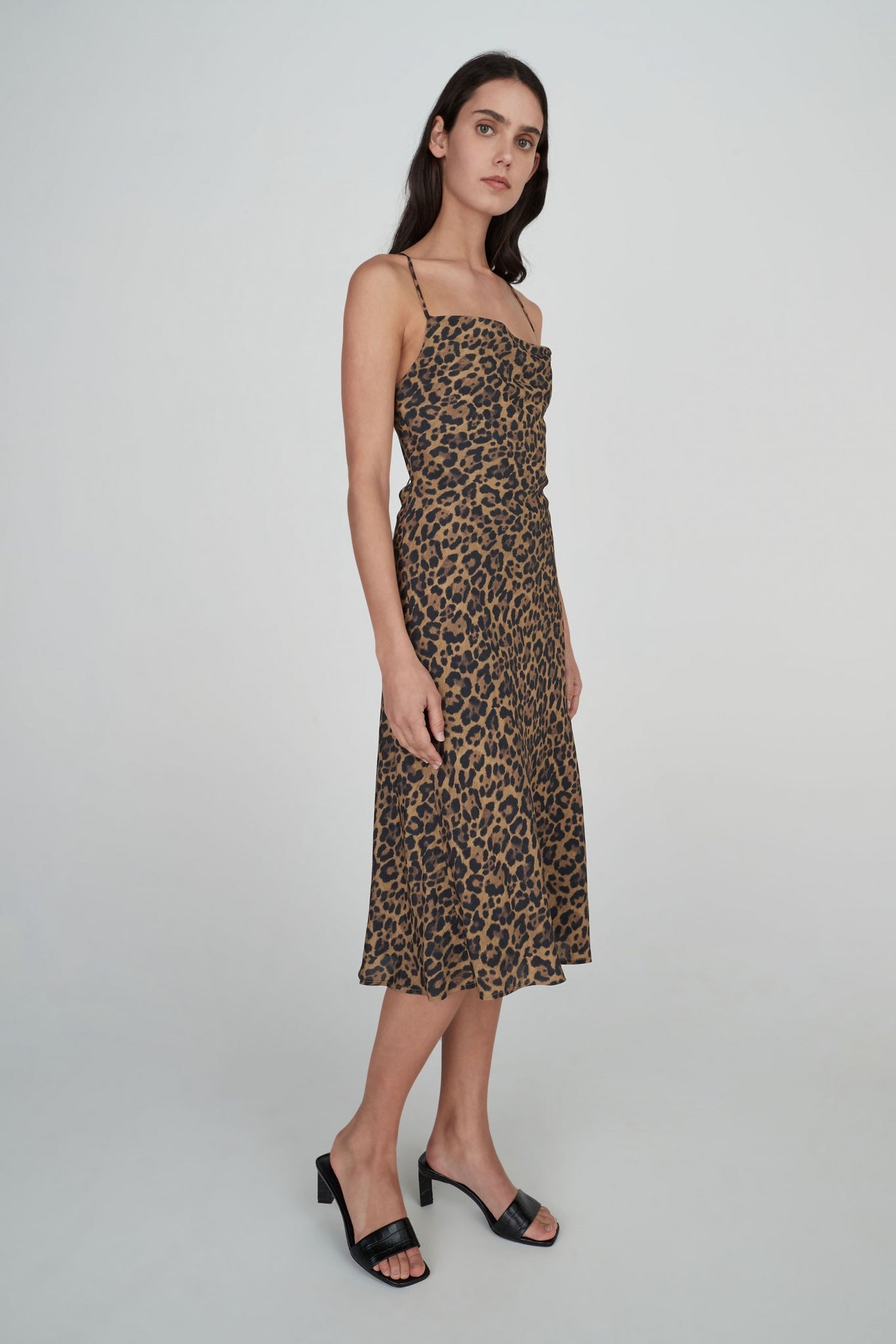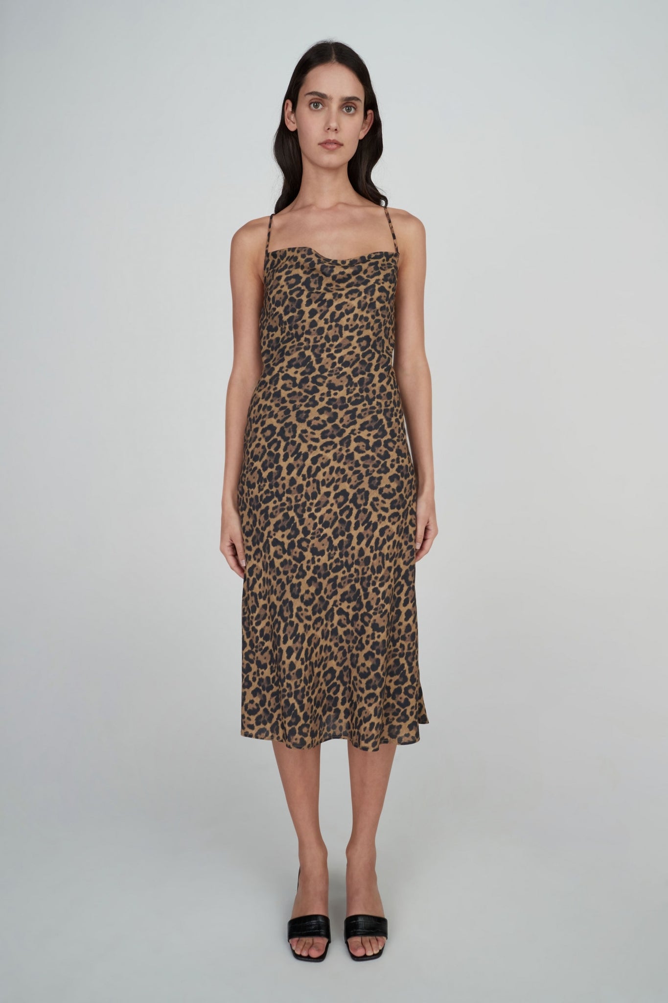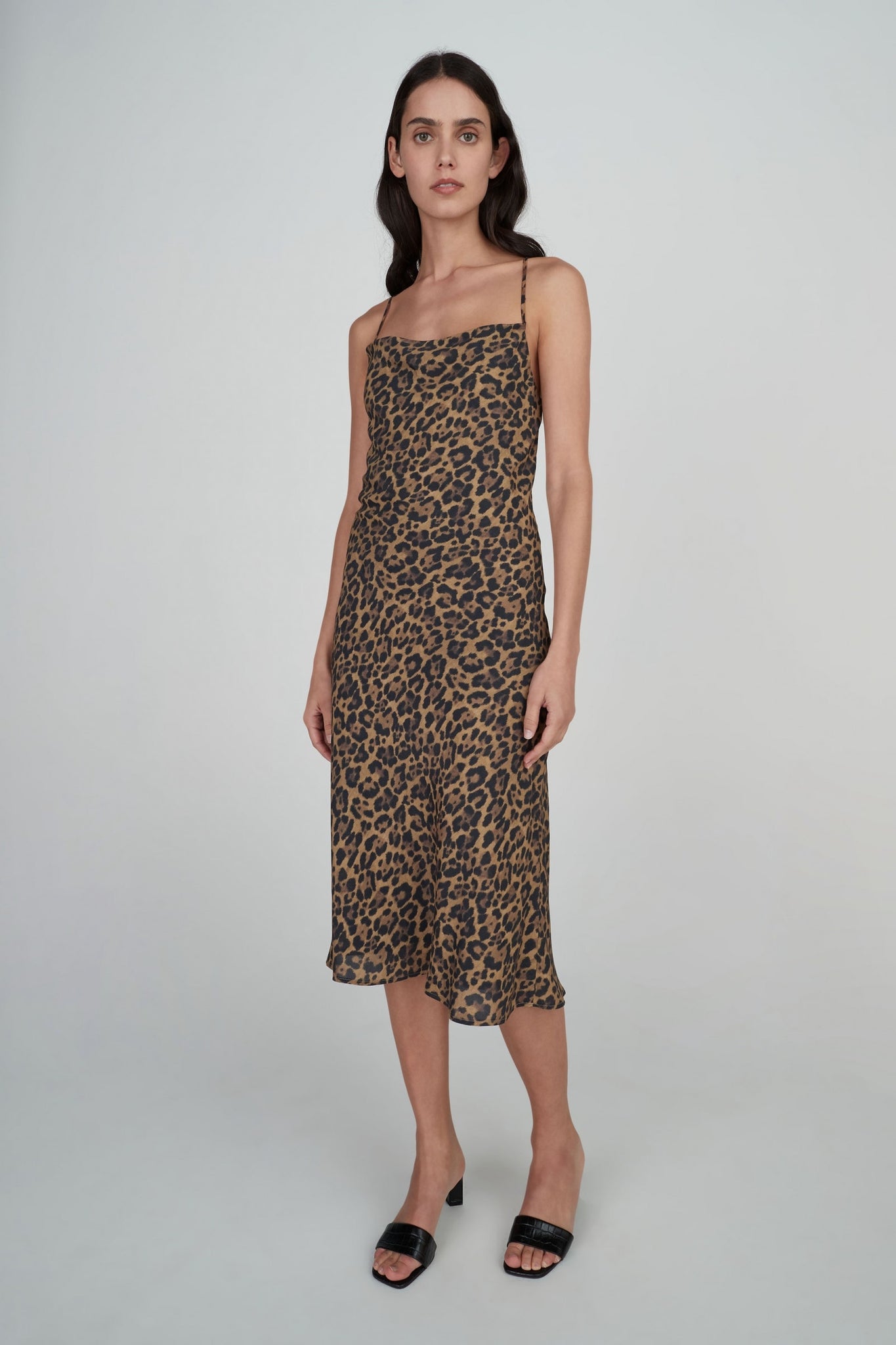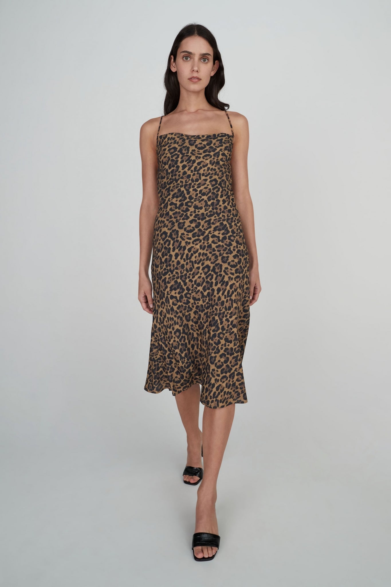 The Dion Dress in leopard is cut on the bias for a figure flattering fitted look. It features a cowl neck, spaghetti straps, a cut out and tie fastening of the straps at the back. Model wears an XS.