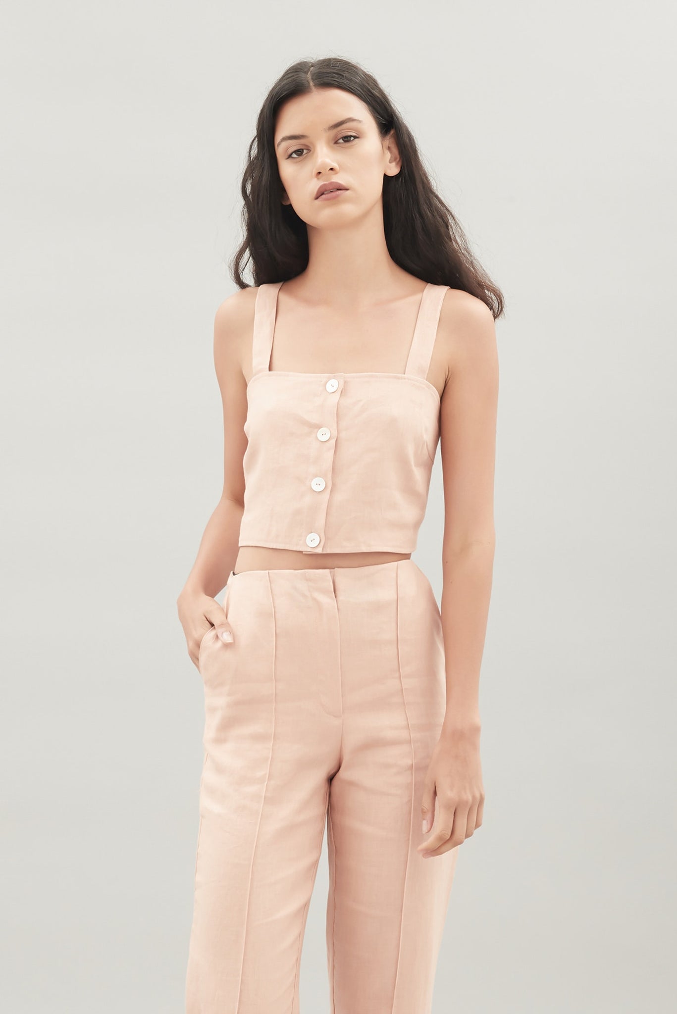 The Erin Linen Top cut in 100% linen is a cropped style top. With a button down center front it features MOP buttons and is fitted to the bust. With wide straps this top can be paired back with the Luella Skirt or the Tegan Linen Pant.