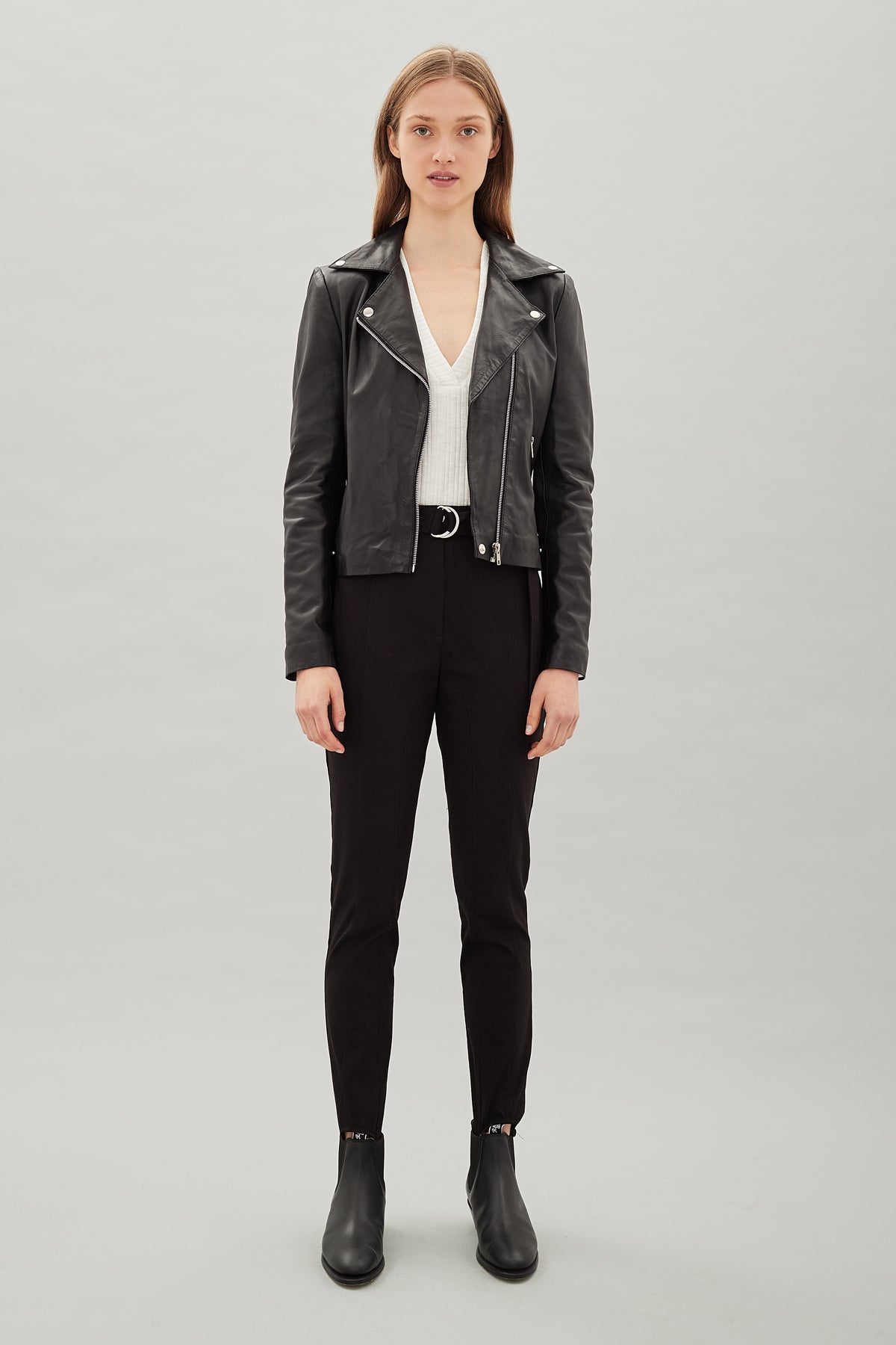 The Frankie Jacket is a classic Hansen & Gretel staple, a shaped biker jacket made of supple black leather. With zips at the cuff of the sleeve and zipper pocket details. Finished off with silver hardware, Frankie is a versatile jacket. Model is wearing a size Small.