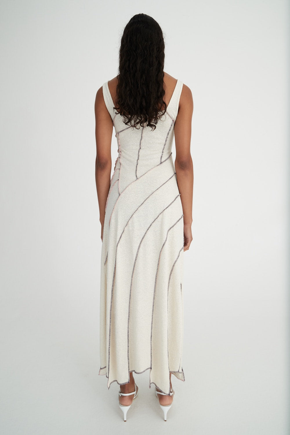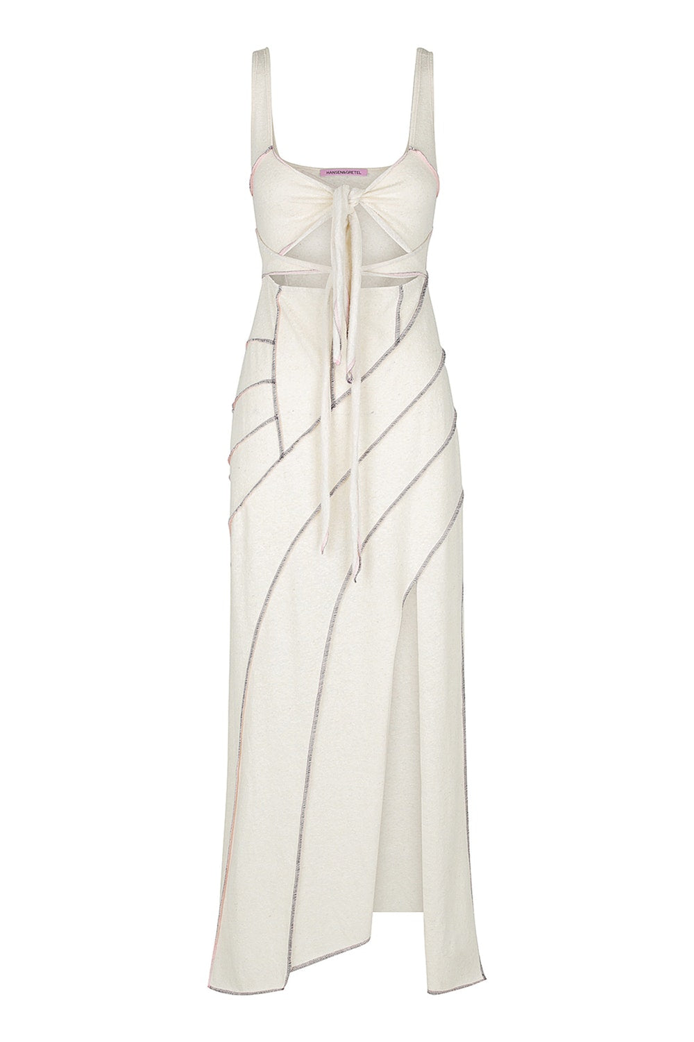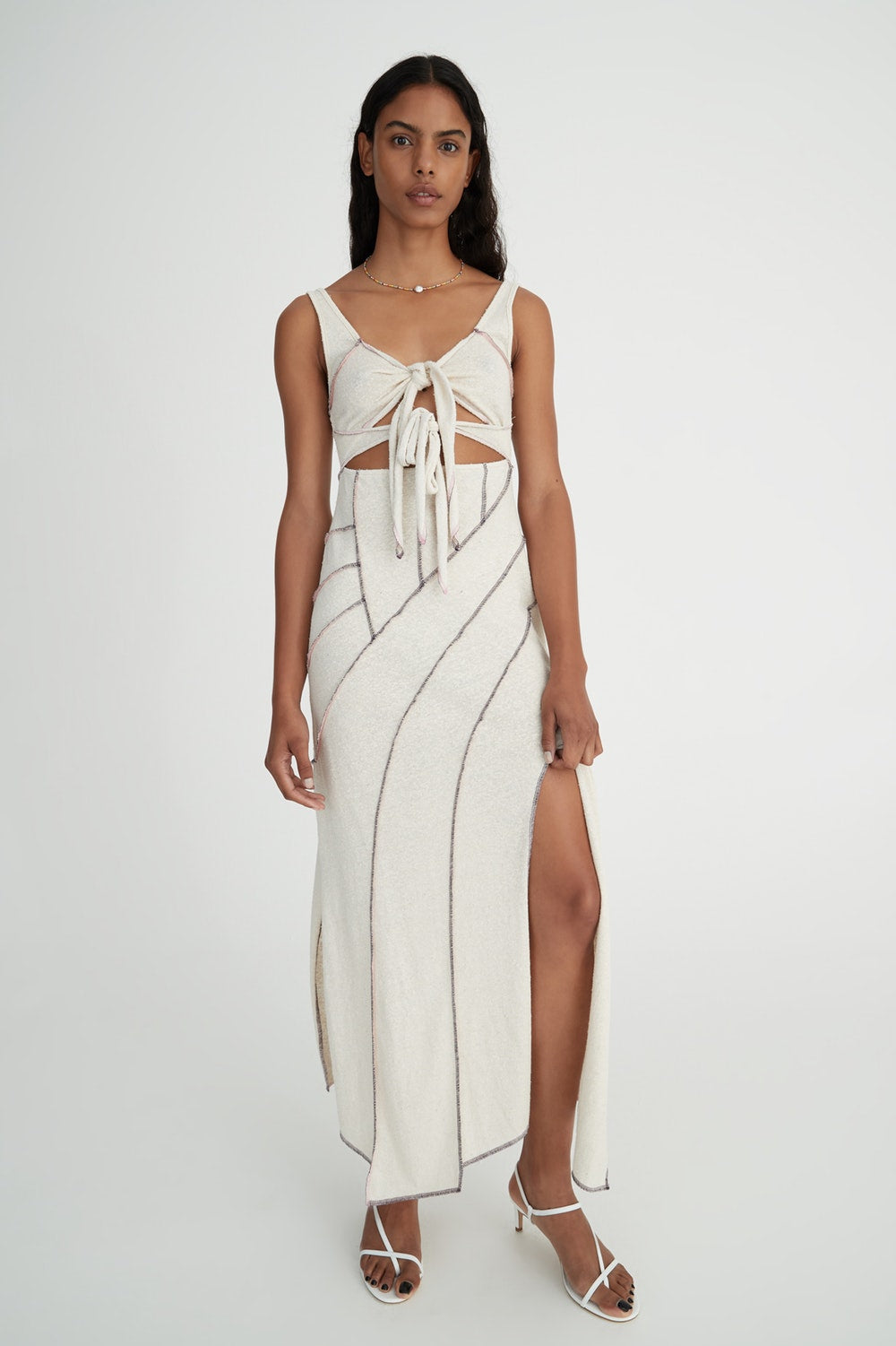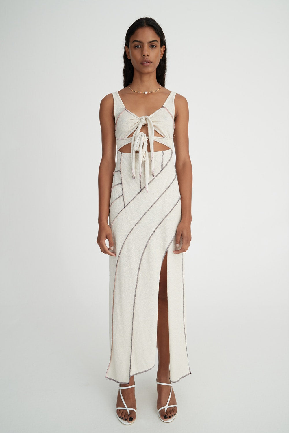 The Kehlani Dress in a linen/cotton/poly blend is the ultimate statement piece for your wardrobe. The dress features a double cut-out tie up feature at the front and contrast overlocked panels. Pair with a simple heel and let the dress speak for itself. Model wears a size XS.