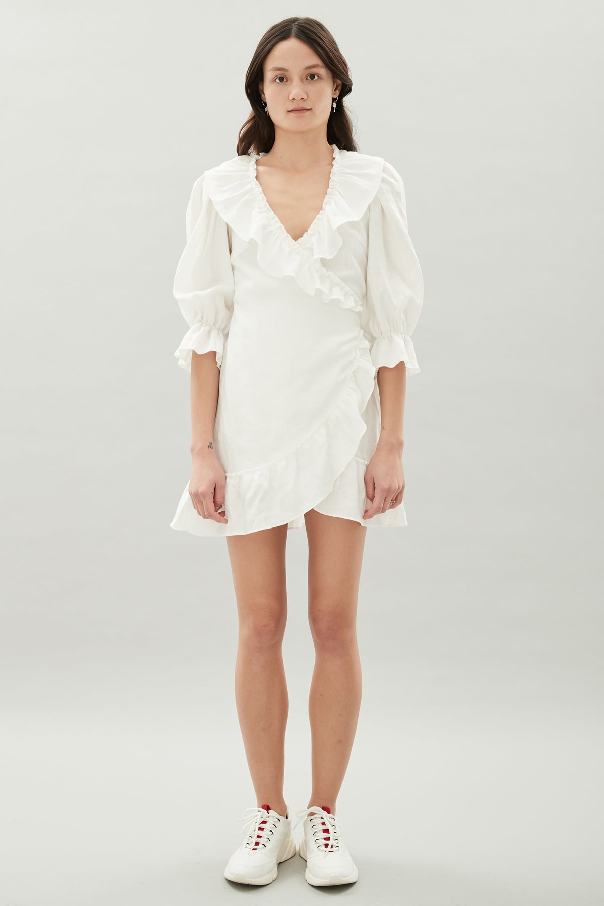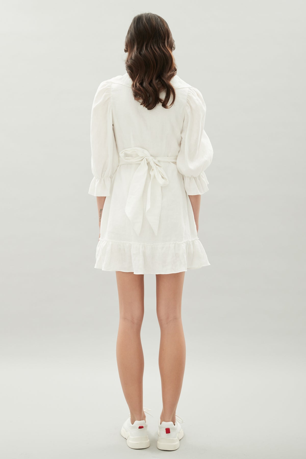 The Mandy Dress is a wrap style dress cut in White Linen. With ¾ length sleeves and ruffles framing the neckline and hem of the dress. An ultra feminine style this dress is perfect for all occasions. Model is wearing a size Small.