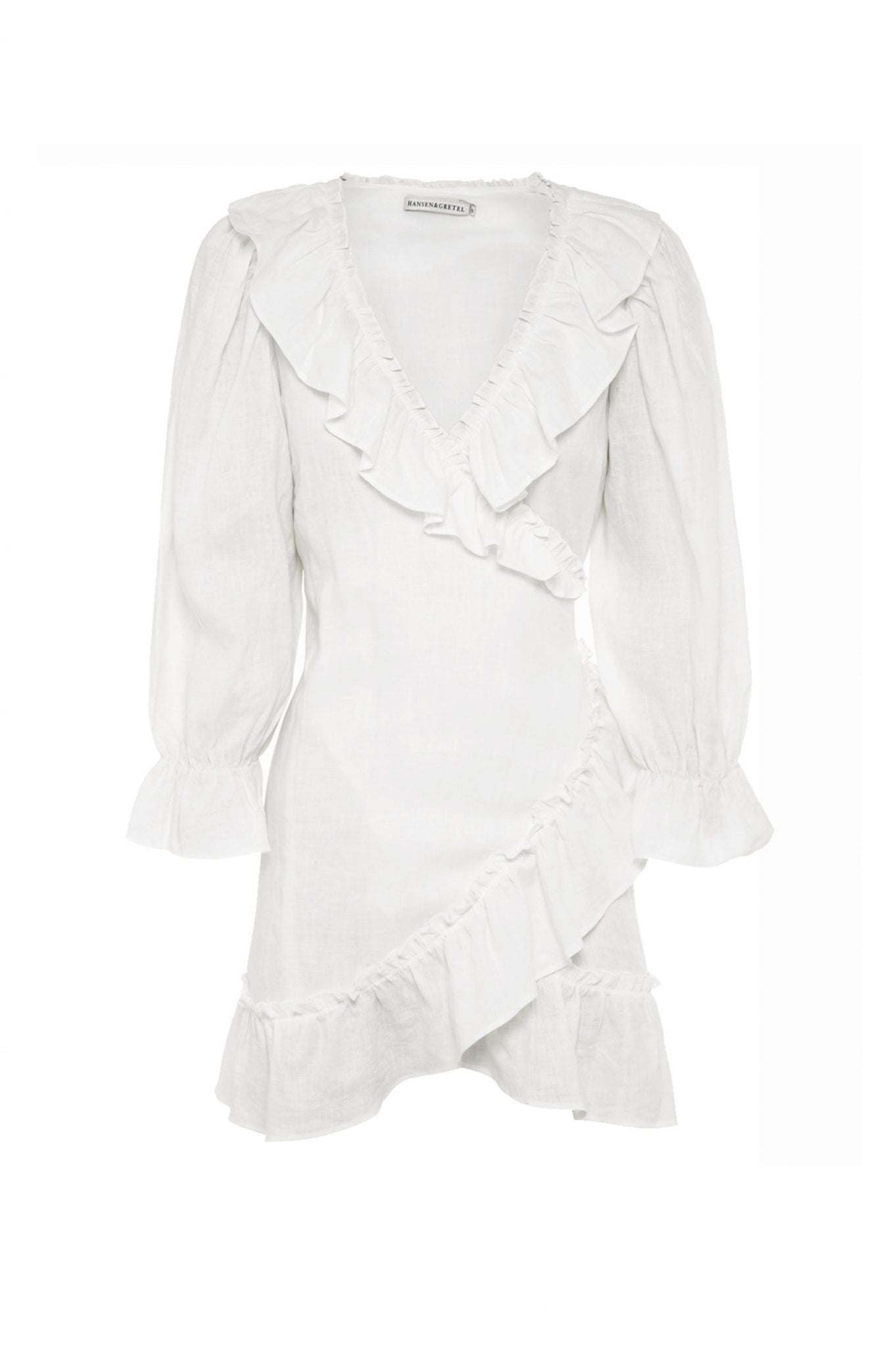 The Mandy Dress is a wrap style dress cut in White Linen. With ¾ length sleeves and ruffles framing the neckline and hem of the dress. An ultra feminine style this dress is perfect for all occasions. Model...Read more