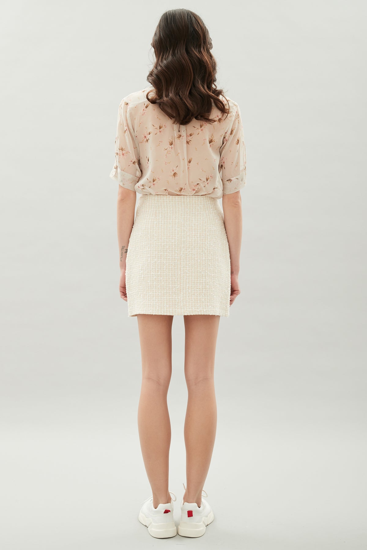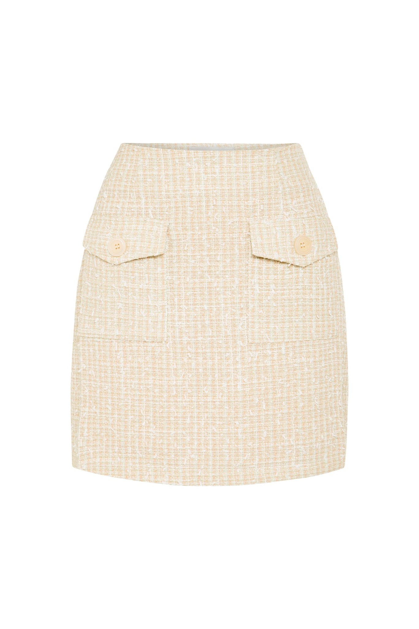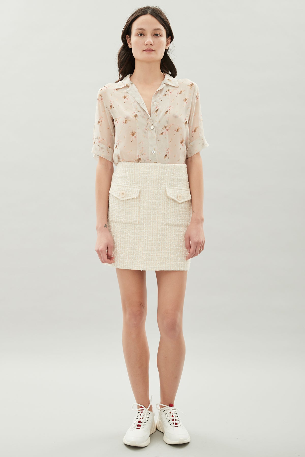 A high-waisted sophisticated mini, the Oliver Skirt is reminiscent of 1920s elegance and grace. In a cream tweed, the Oliver skirt can either be dressed down with a T-shirt and sneakers or paired with heels and the Yasmin jacket for a more refined look. Two front patch pockets create the perfect subtle detail. Model is wearing a size S.