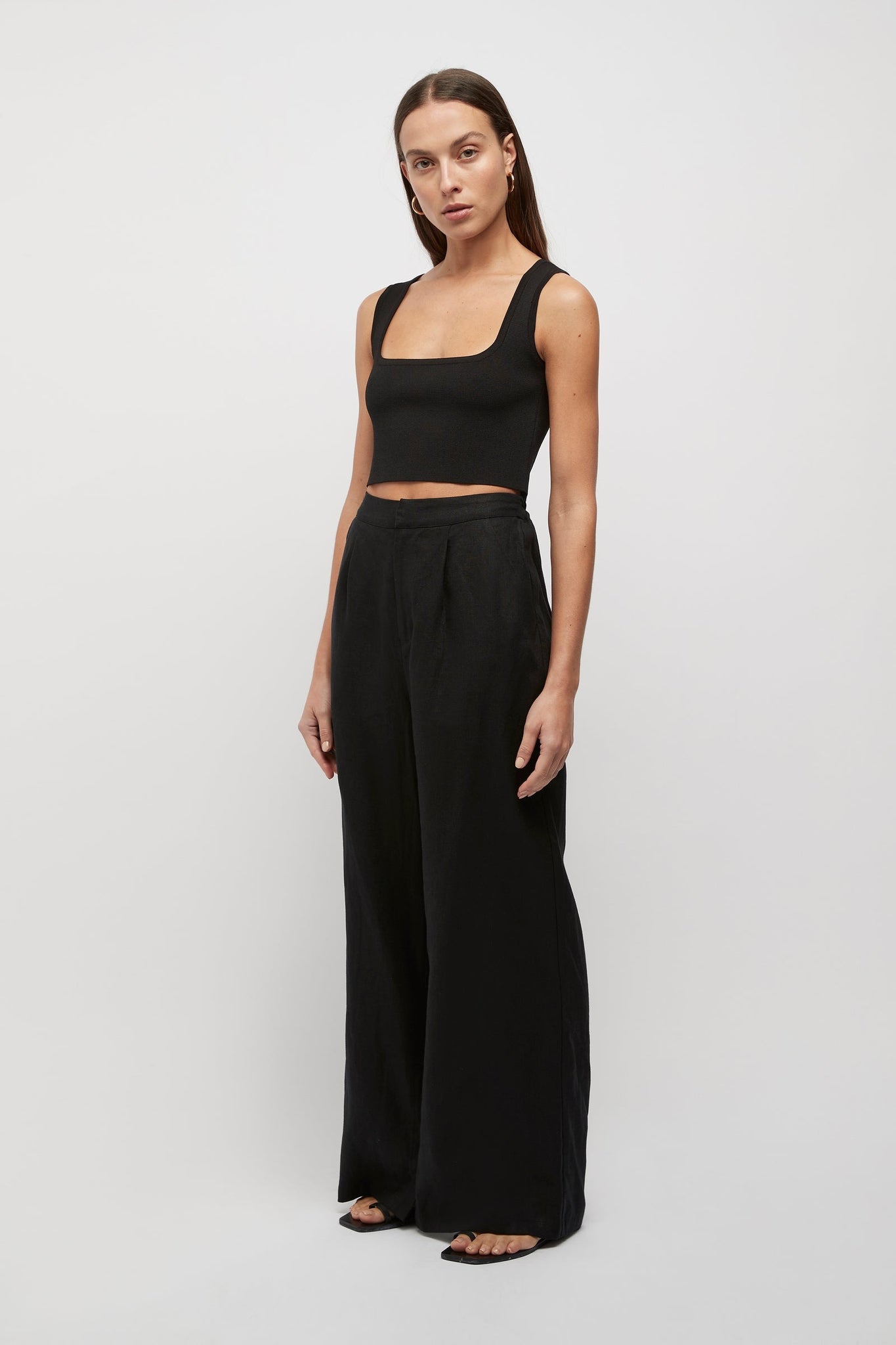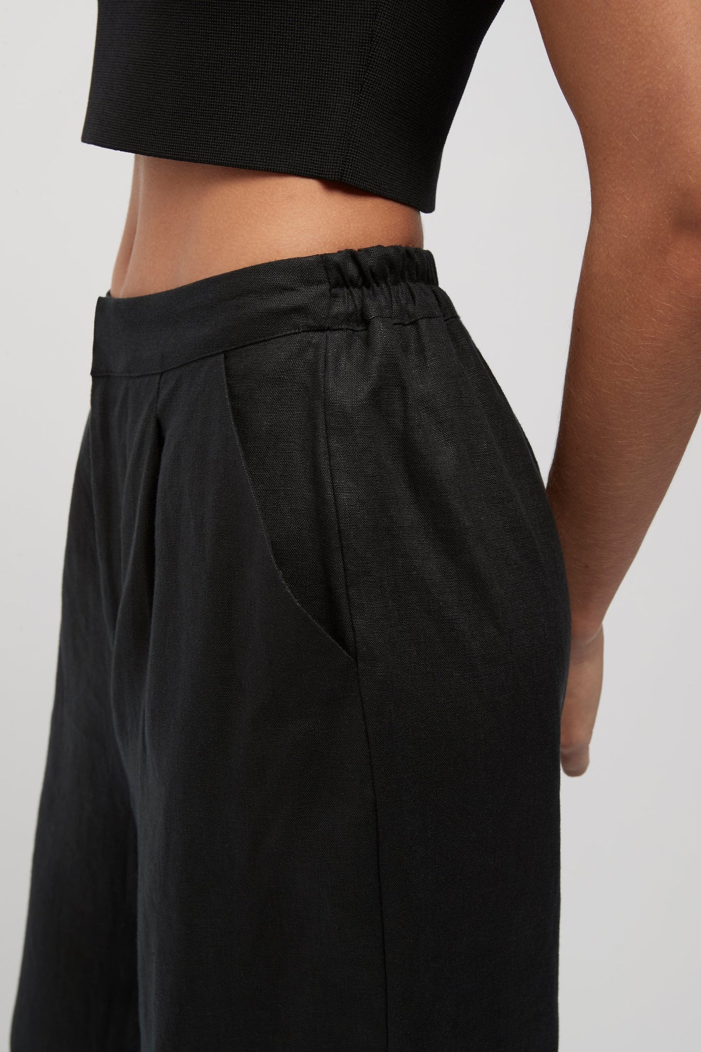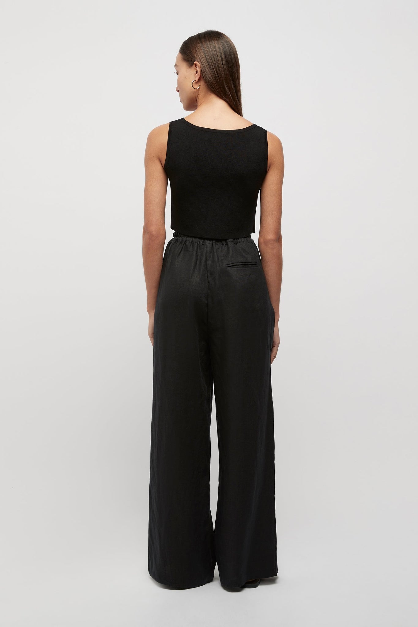 A wide leg trouser, cut from a medium weight 100% linen fabrication. Designed with side seam splits and front pleats for a sleek, tailored approach to a relaxed summer pant.