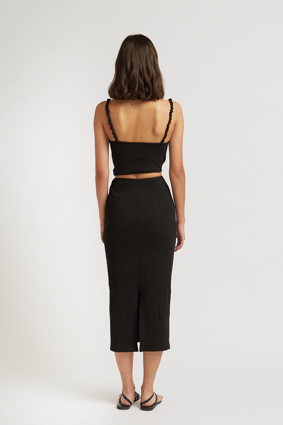 A black, slim fit midi dress constructed in a mid-weight cotton blend fabrication. Features ruched strap detailing and flattering waist cut out with knotted detail. Midi length Slim fit Ruched straps Waist cut out Knotted detail Back Split...Read more