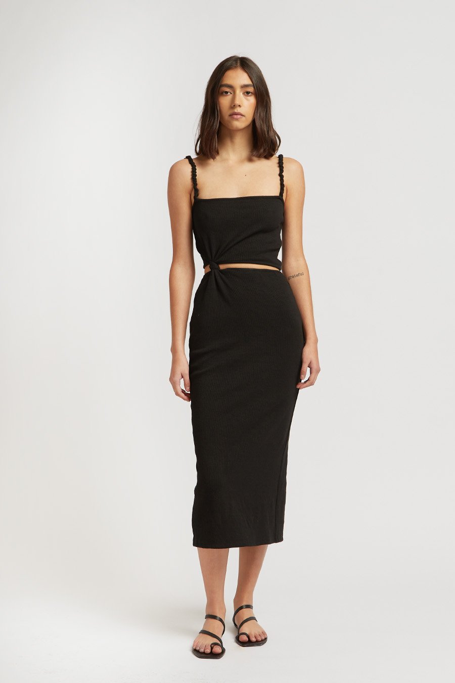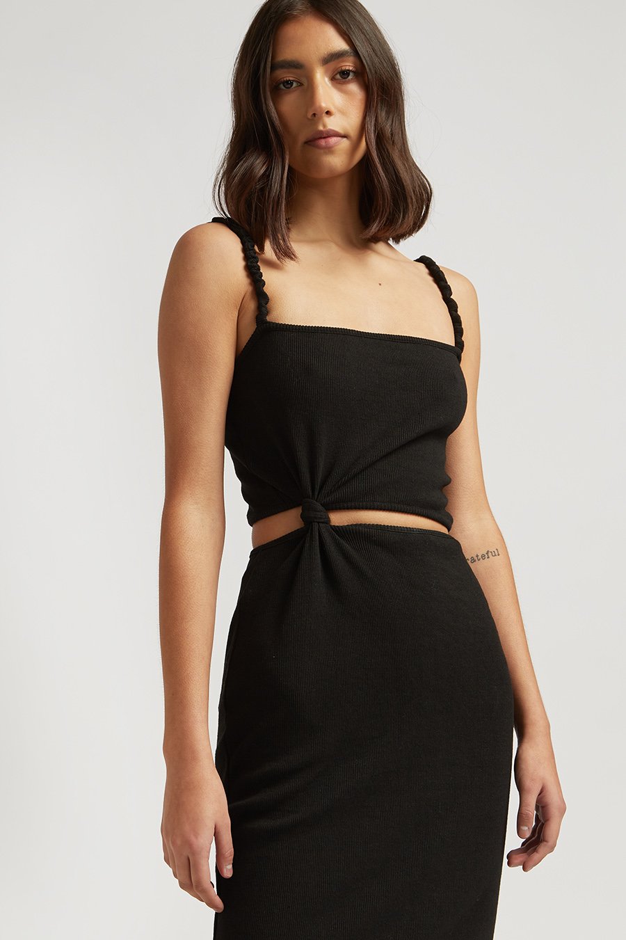 A black, slim fit midi dress constructed in a mid-weight cotton blend fabrication. Features ruched strap detailing and flattering waist cut out with knotted detail.