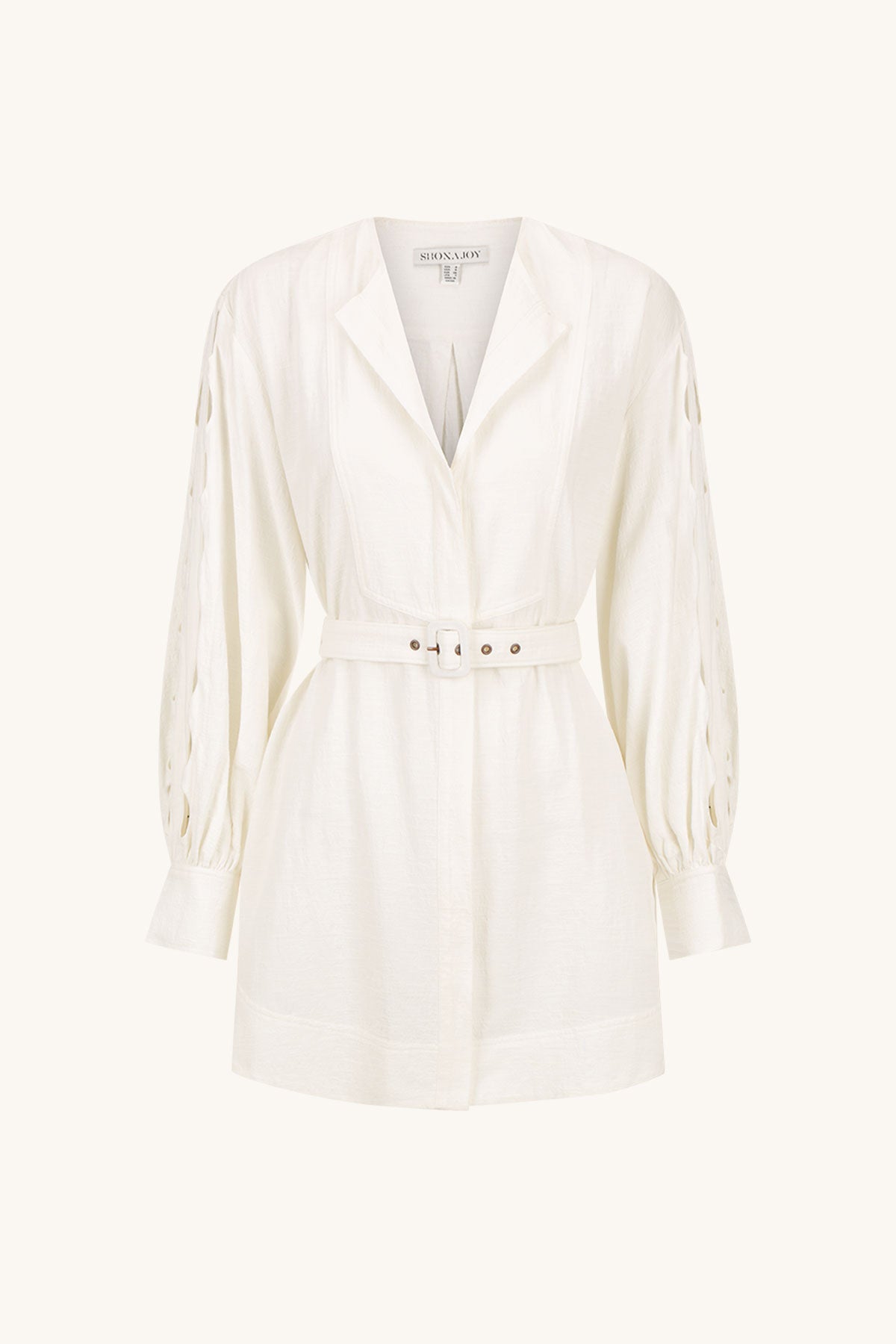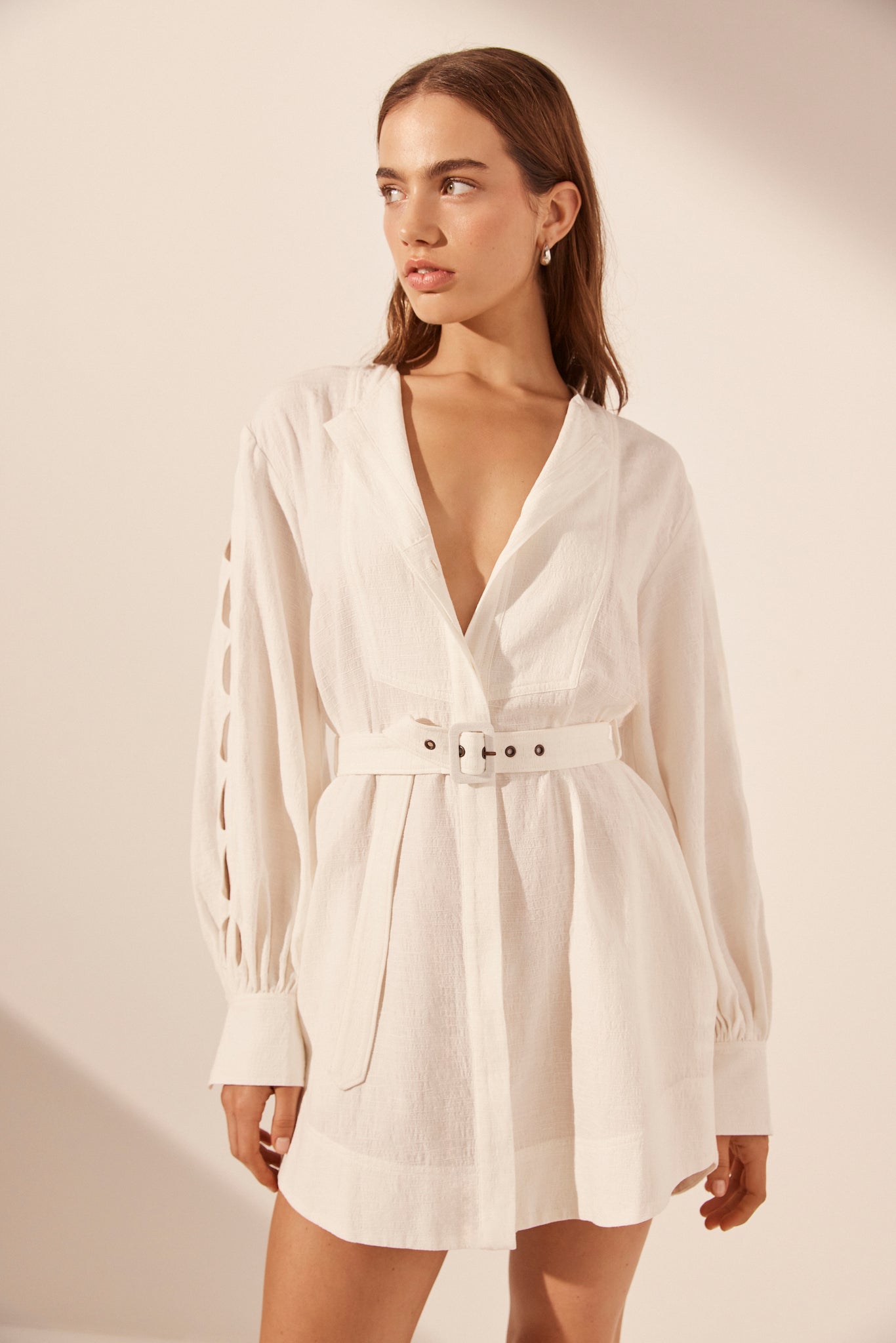 Premium linen blend fabric Round neck Concealed front button tab Balloon sleeves with shirt cuff Scallop cut out detail on sleeve Self covered removable belt Mini length skirt Curved hem Medium weight, non-stretchy woven 65% Cotton 35% Linen...Read more
