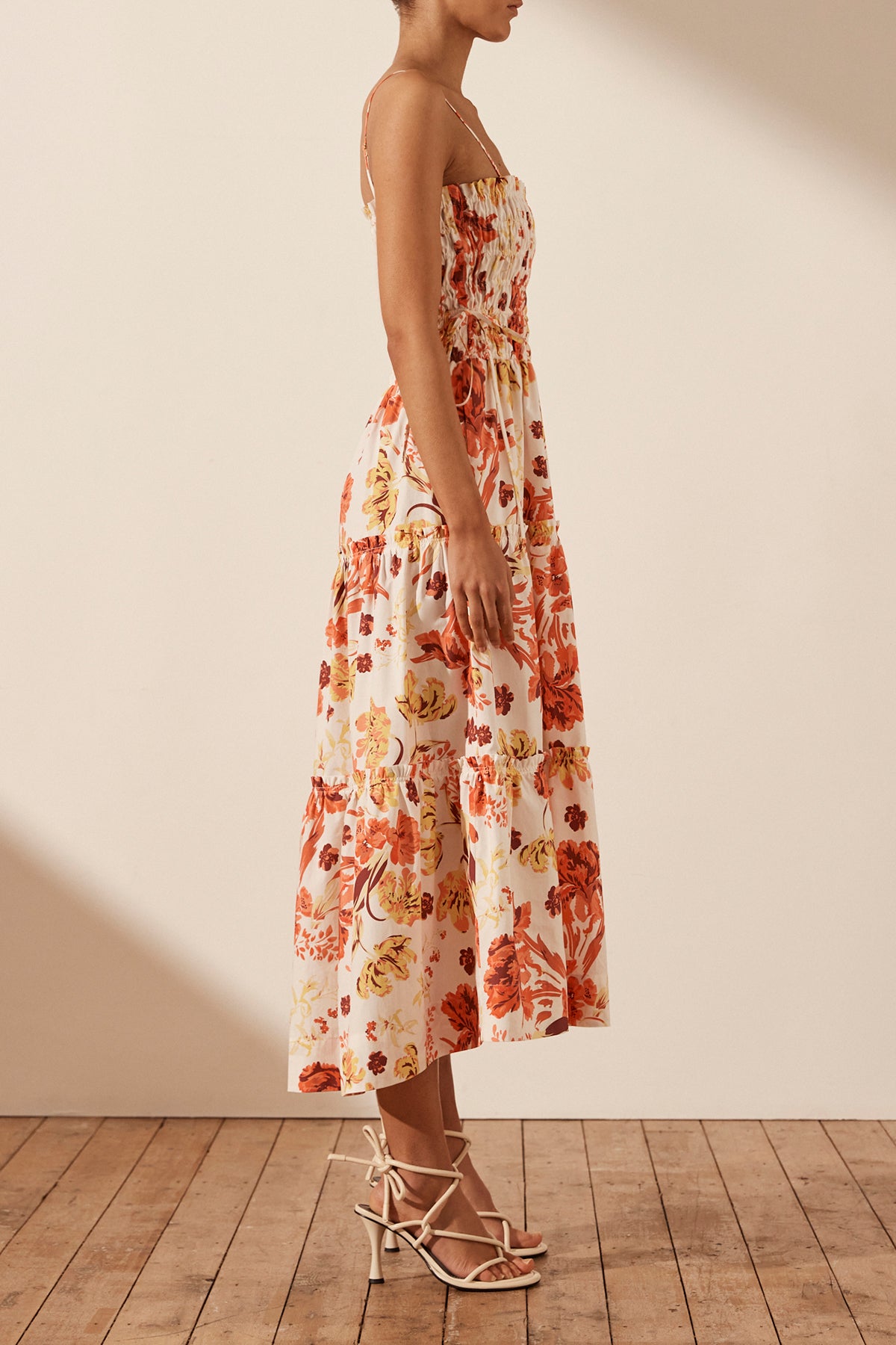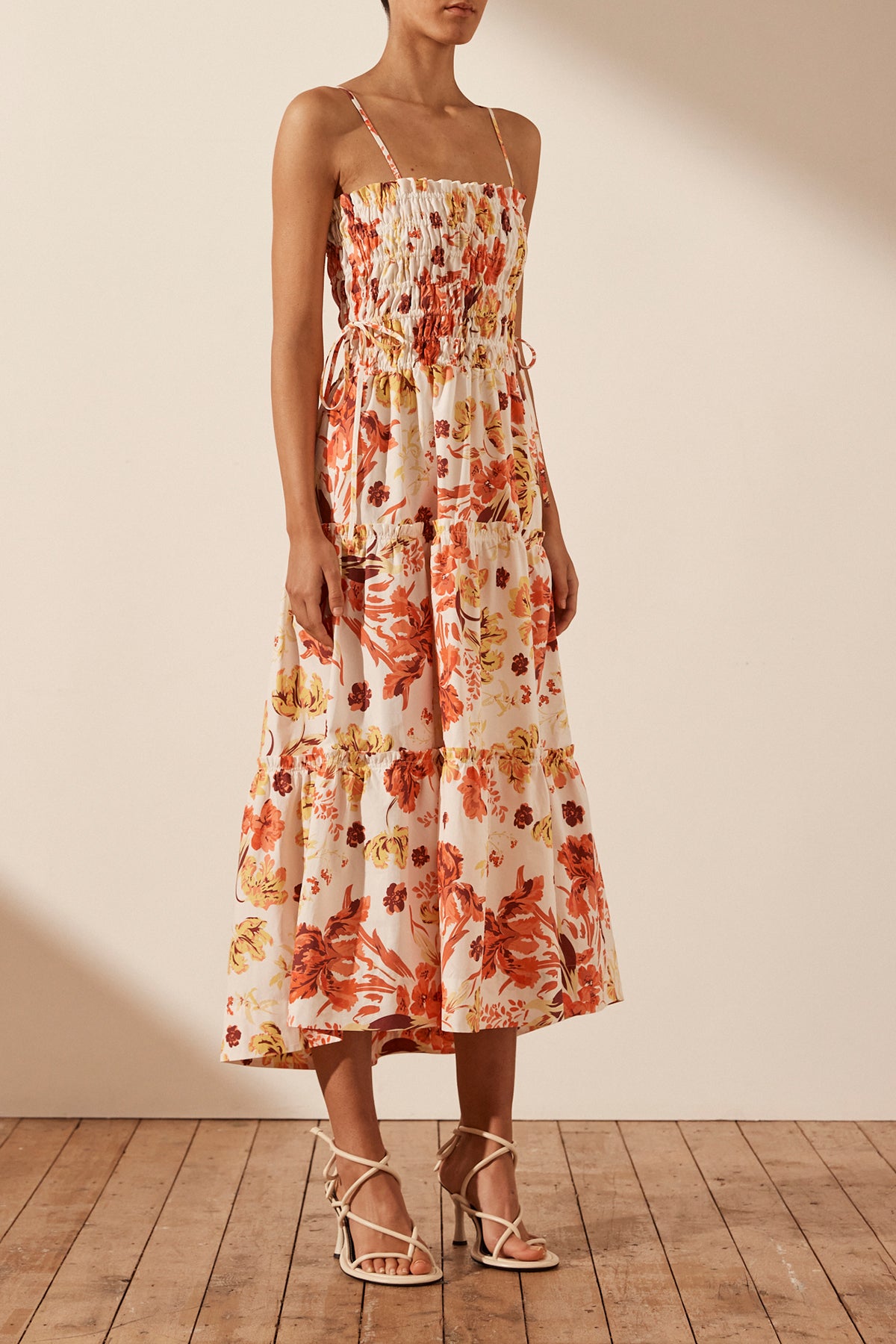 Shirred midi dress in the exclusive Kalani print in a GOTS certified organic cotton.