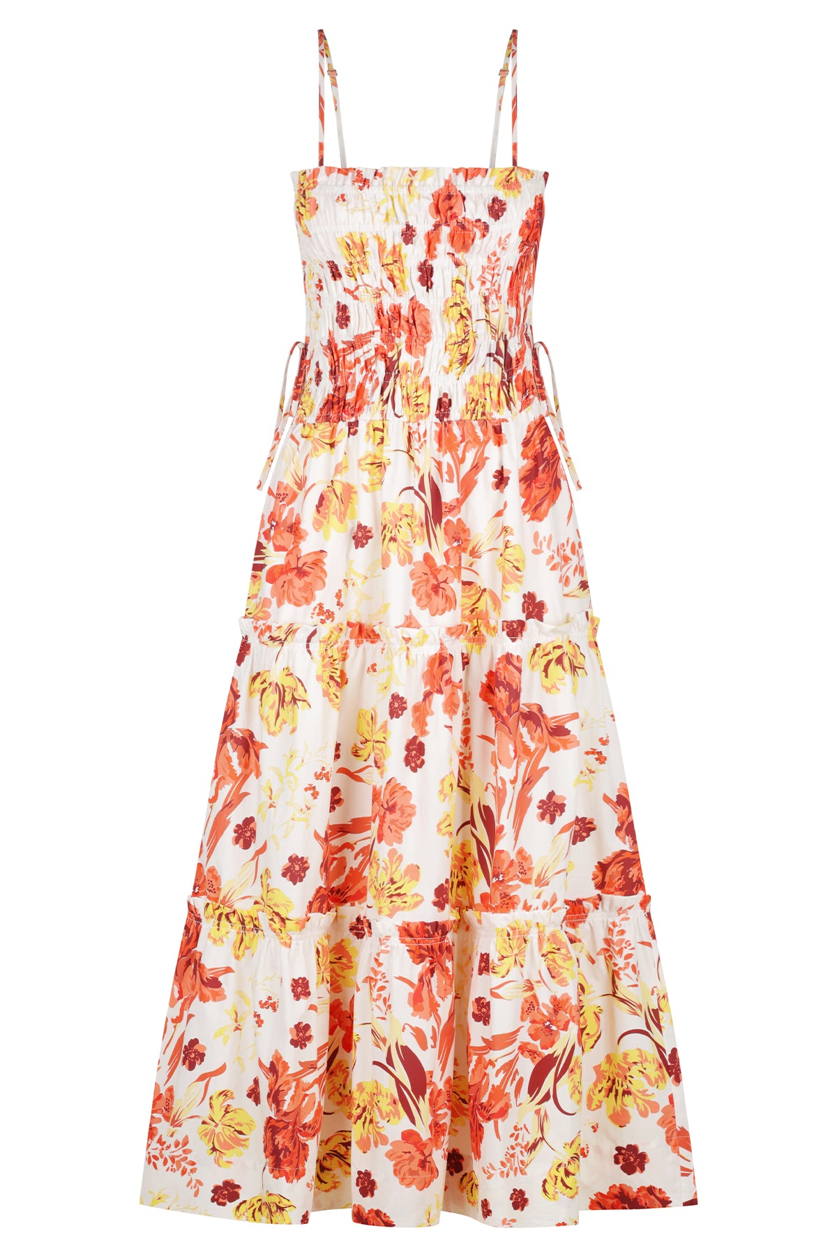 Shirred midi dress in the exclusive Kalani print in a GOTS certified organic cotton. Exclusive Kalani print Adjustable rouleau straps Shirred bodice Drawstring ties at waist Side pockets Tiered midi skirt with frill detail Hi-low hemline Medium weight,...Read more