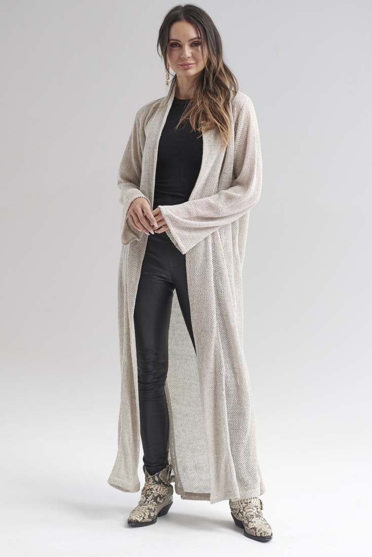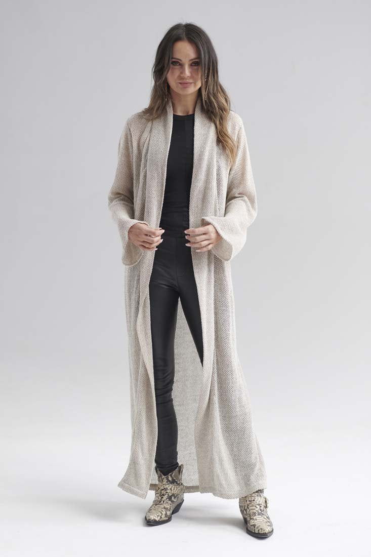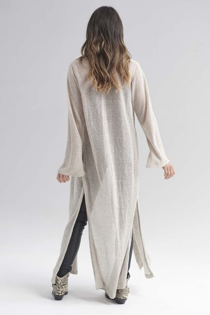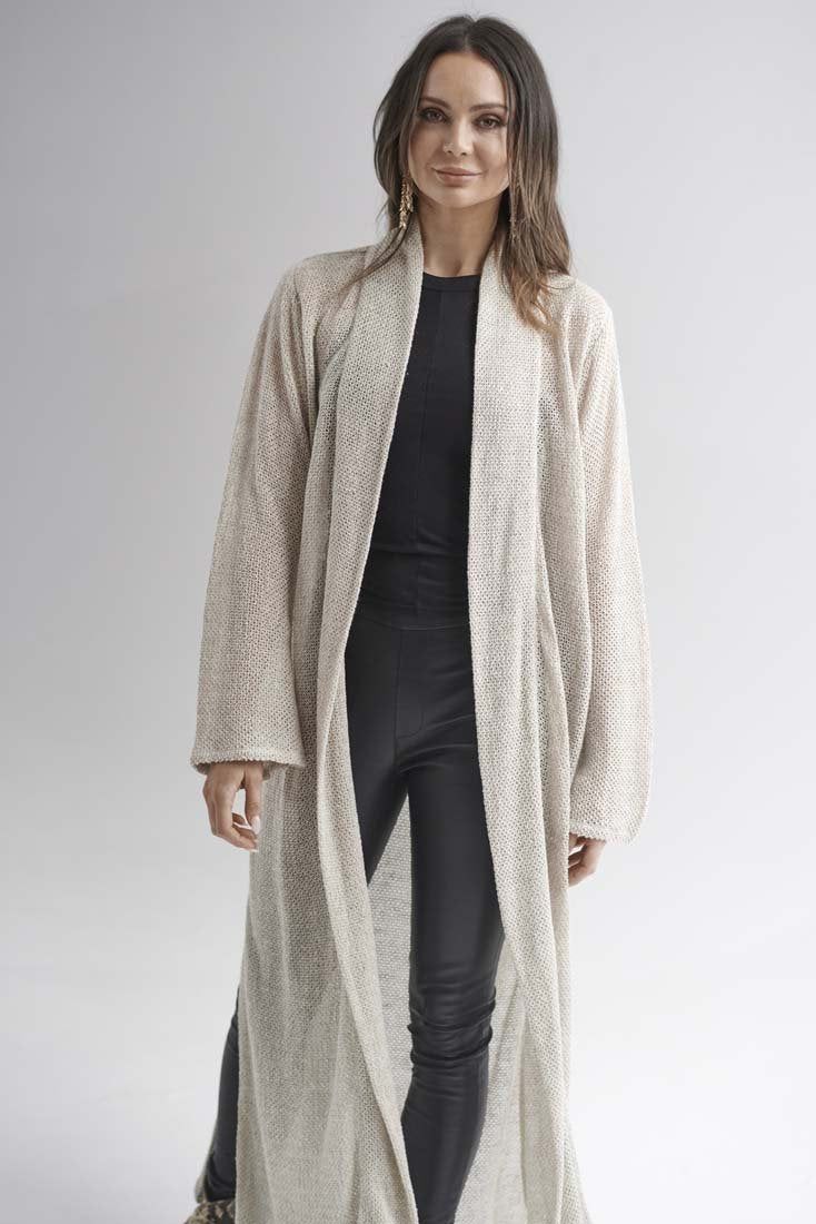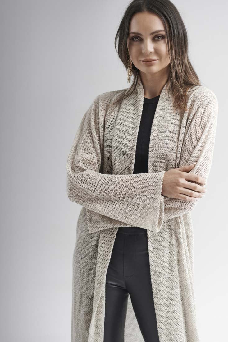 Our Knitted Linen Duster is a contemporary version of a timeless style. Exquisite, full length knitted linen, that drapes like a dream. Details such as a double layered flanged lapel, elegant bell sleeves and side splits, this piece will become your Autumn/Winter essential.