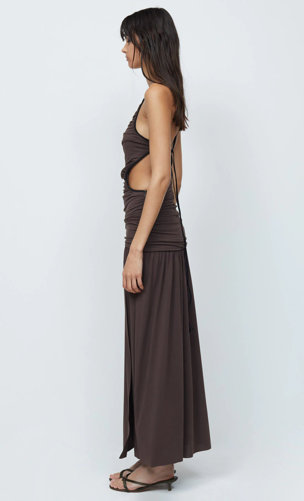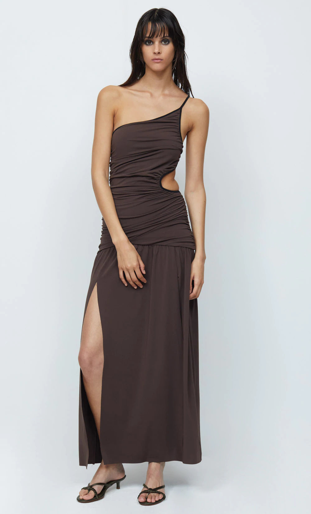 Effortless and edgy, the Lena Maxi Dress is a beautiful asymmetrical style with gathered detailing through the bodice. The one-shoulder dress features side cut-outs, an alluring side leg split and thin rouleau straps that cross the back, with the flowy maxi-length skirt falling from a dropped waist.
