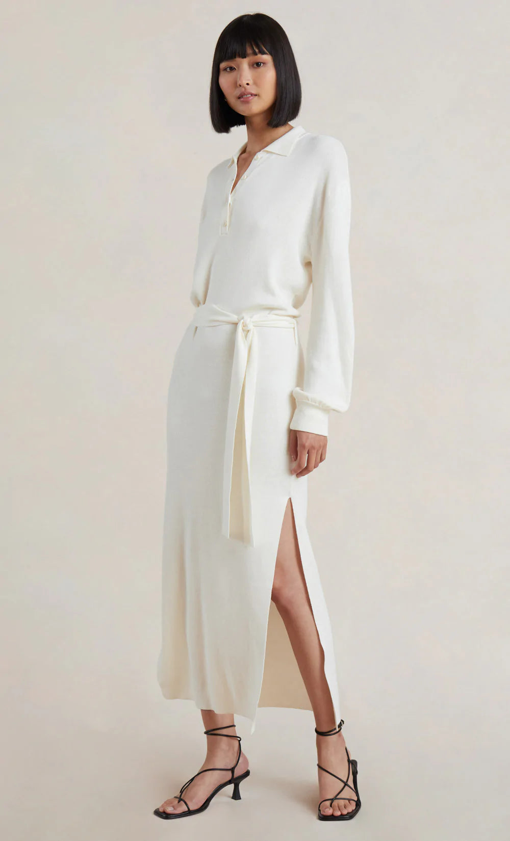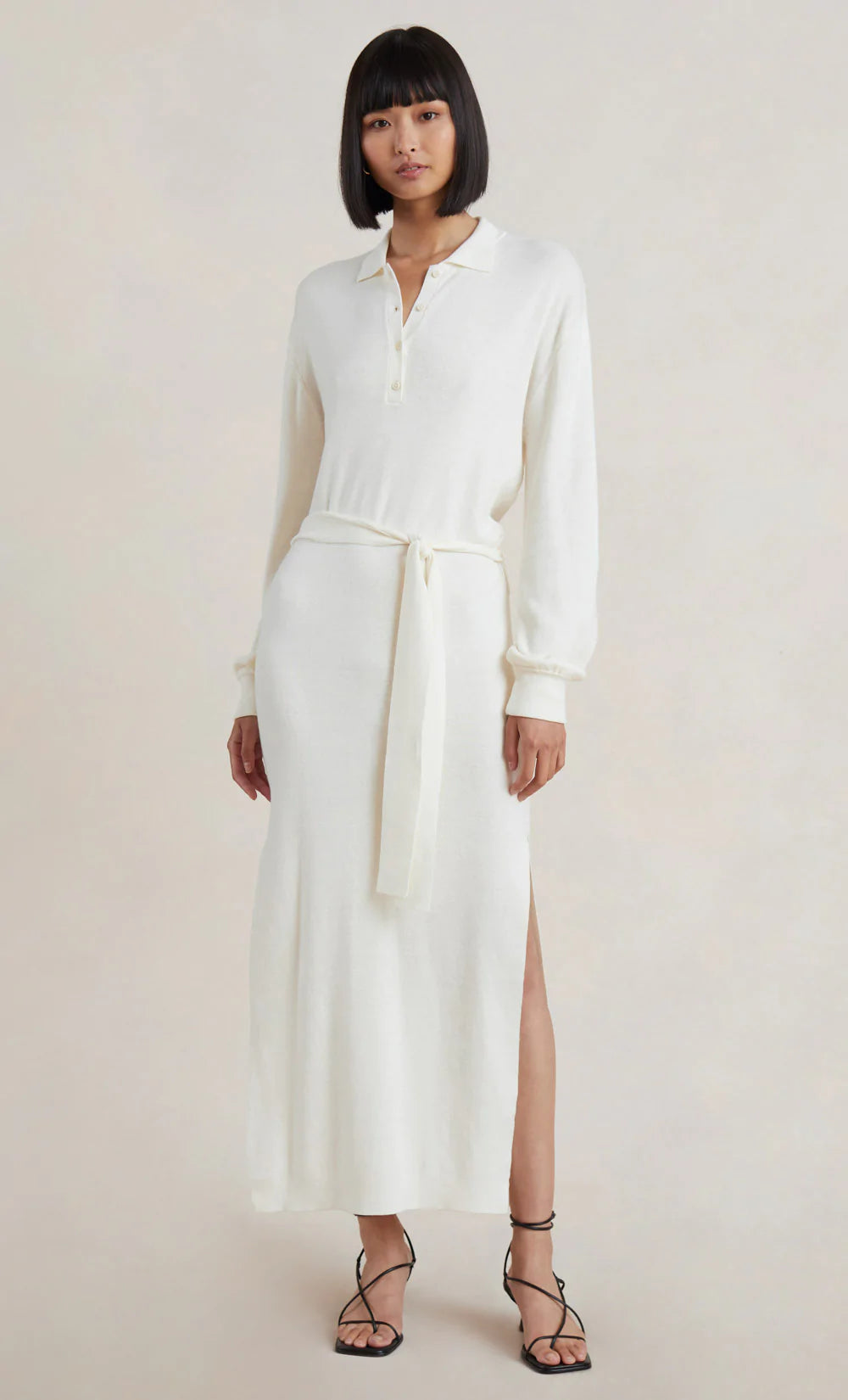 Crafted from a beautiful cotton-cashmere blend, the Liam Knit Polo Midi Dress features an adjustable tie waistband, an alluring side split, ribbed cuffs and a polo placket.