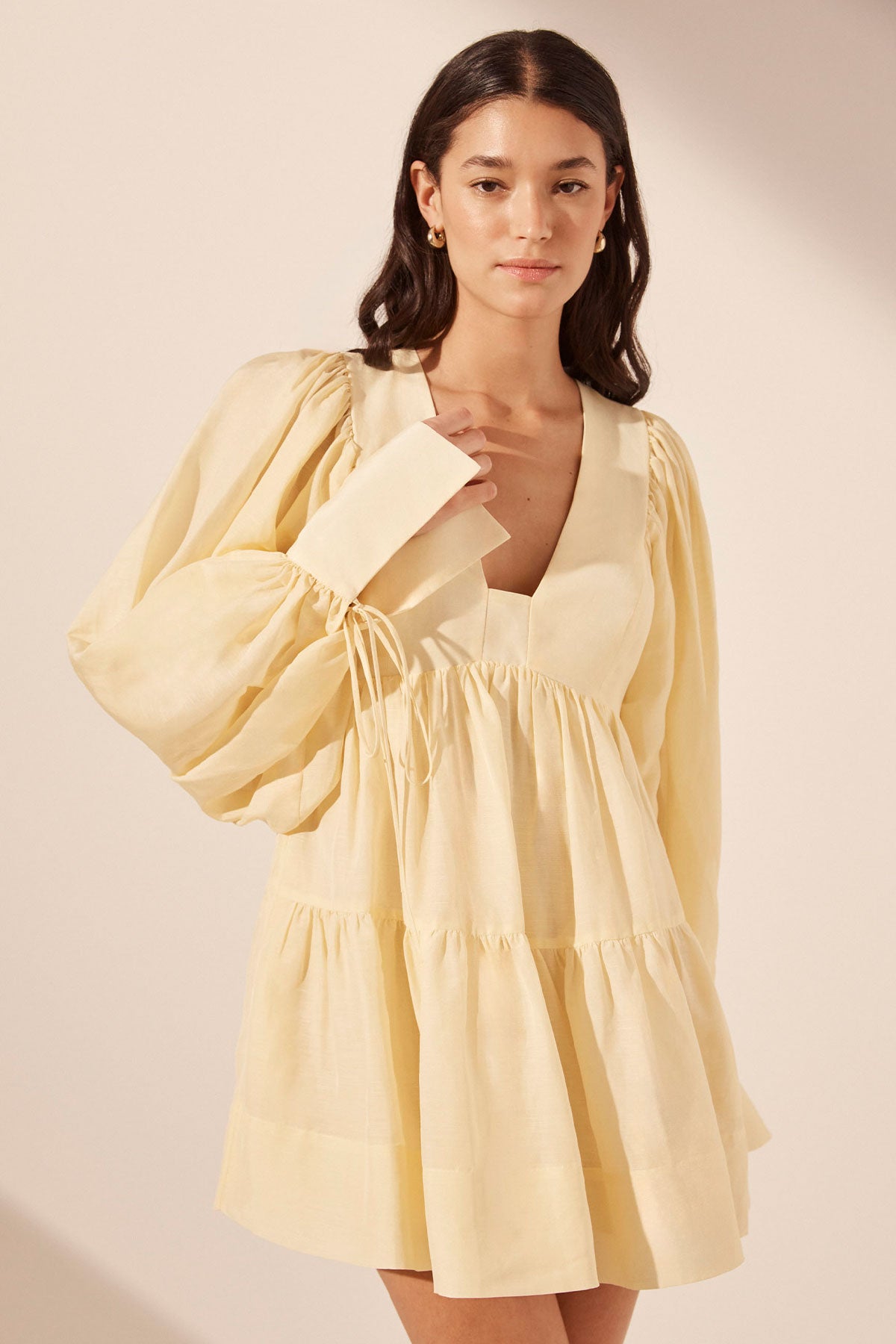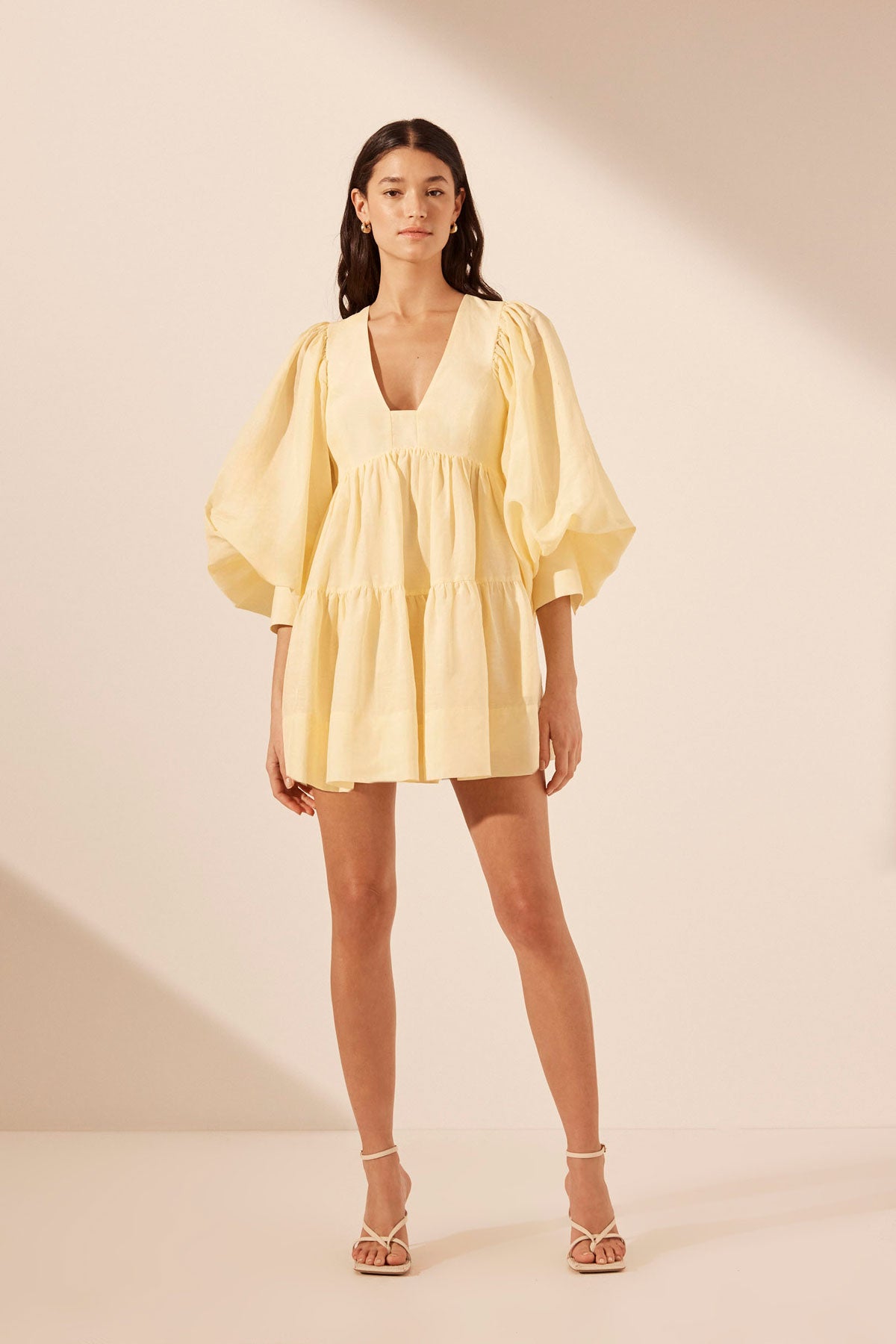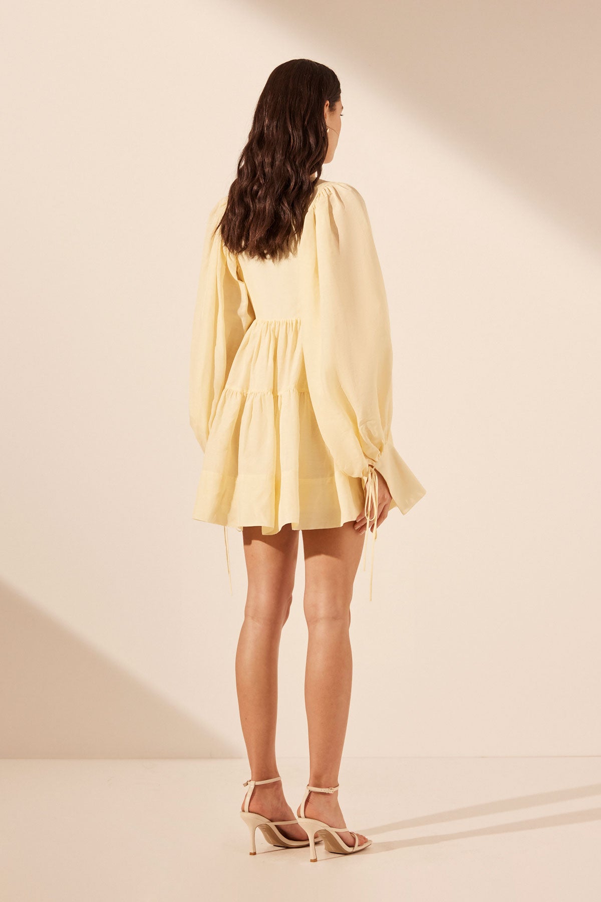 Premium sheer Linen TENCEL™ blend Plunged neckline Balloon sleeve with rouleau ties Invisible side zip Side pockets Tiered mini length skirt Light weight, non-stretchy woven 23% LENZING™ ECOVERO™ 33% Linen 44% Viscose Lined Designed in Australia Made in...Read more