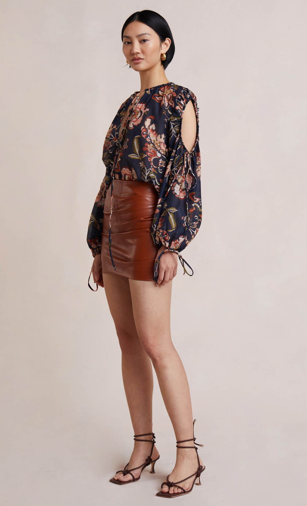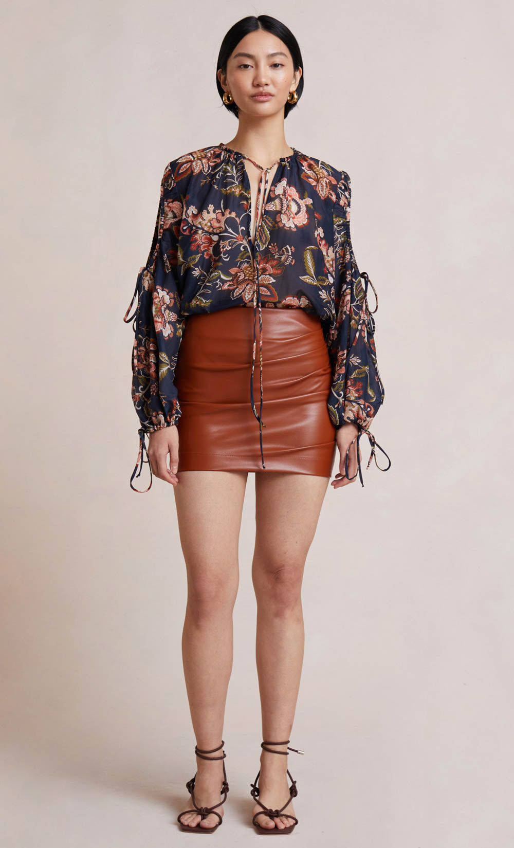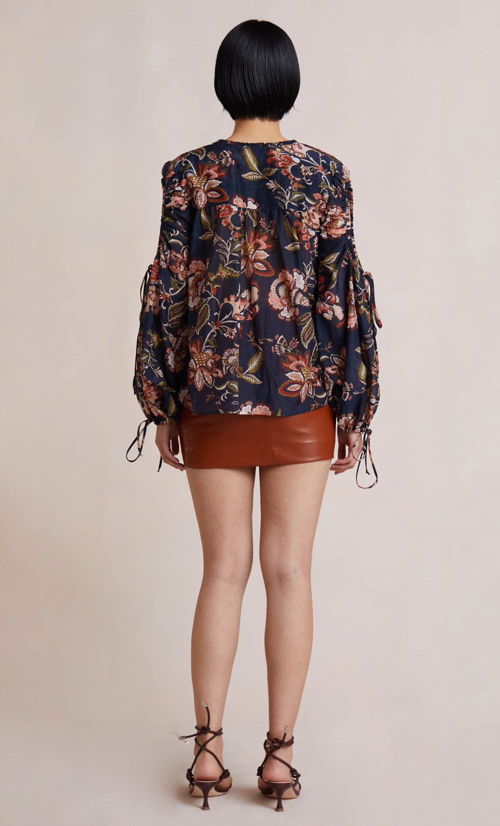 Cut from a breezy signature floral print fabric, the Lori Blouse is an easy-to-wear style with a plunge neckline finished with an adjustable tie across the neckline. The blouse features billowy puff sleeves complete with cutout details and self-ties along the sleeves and cuffs.