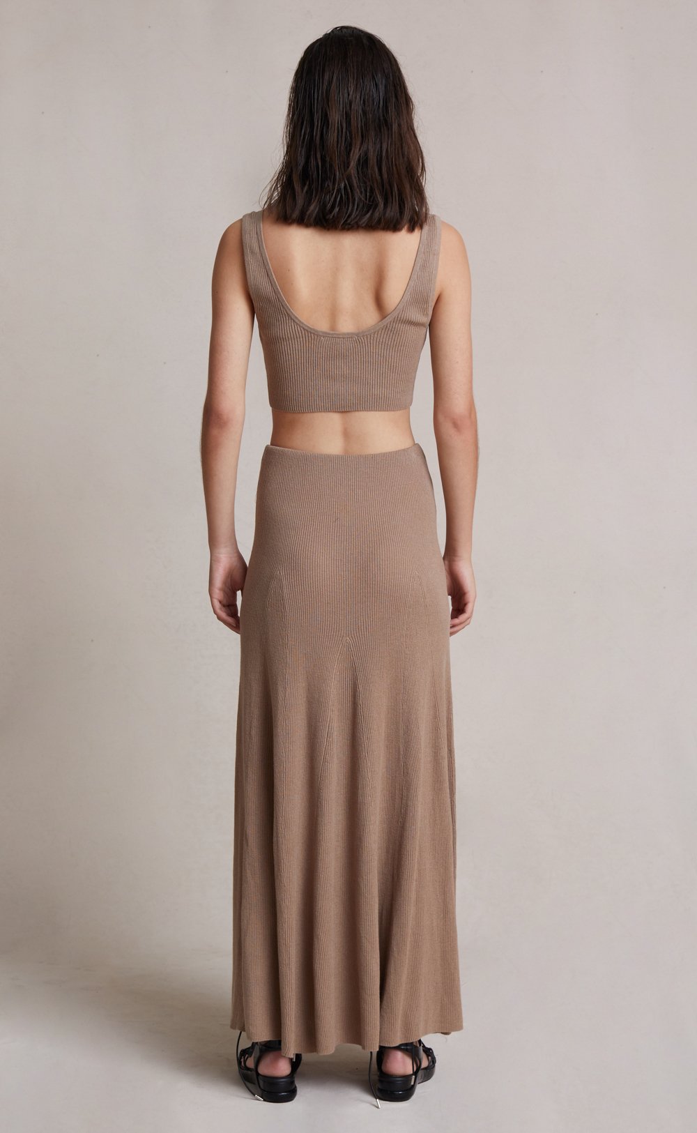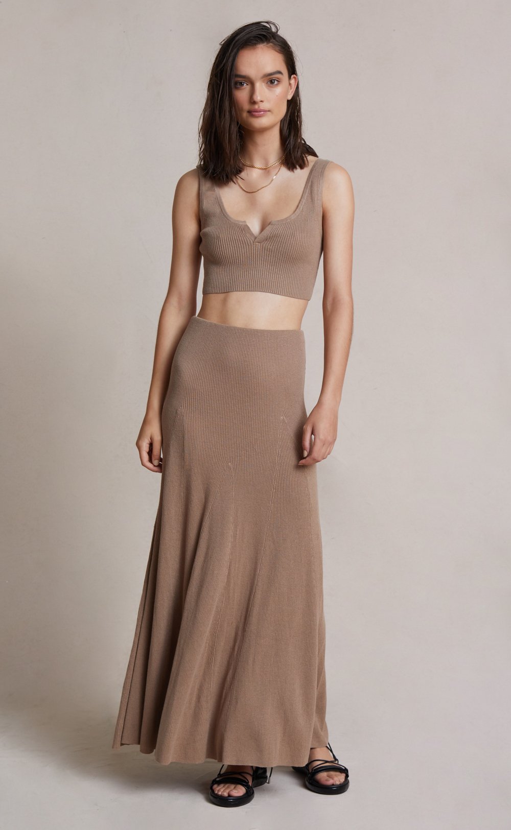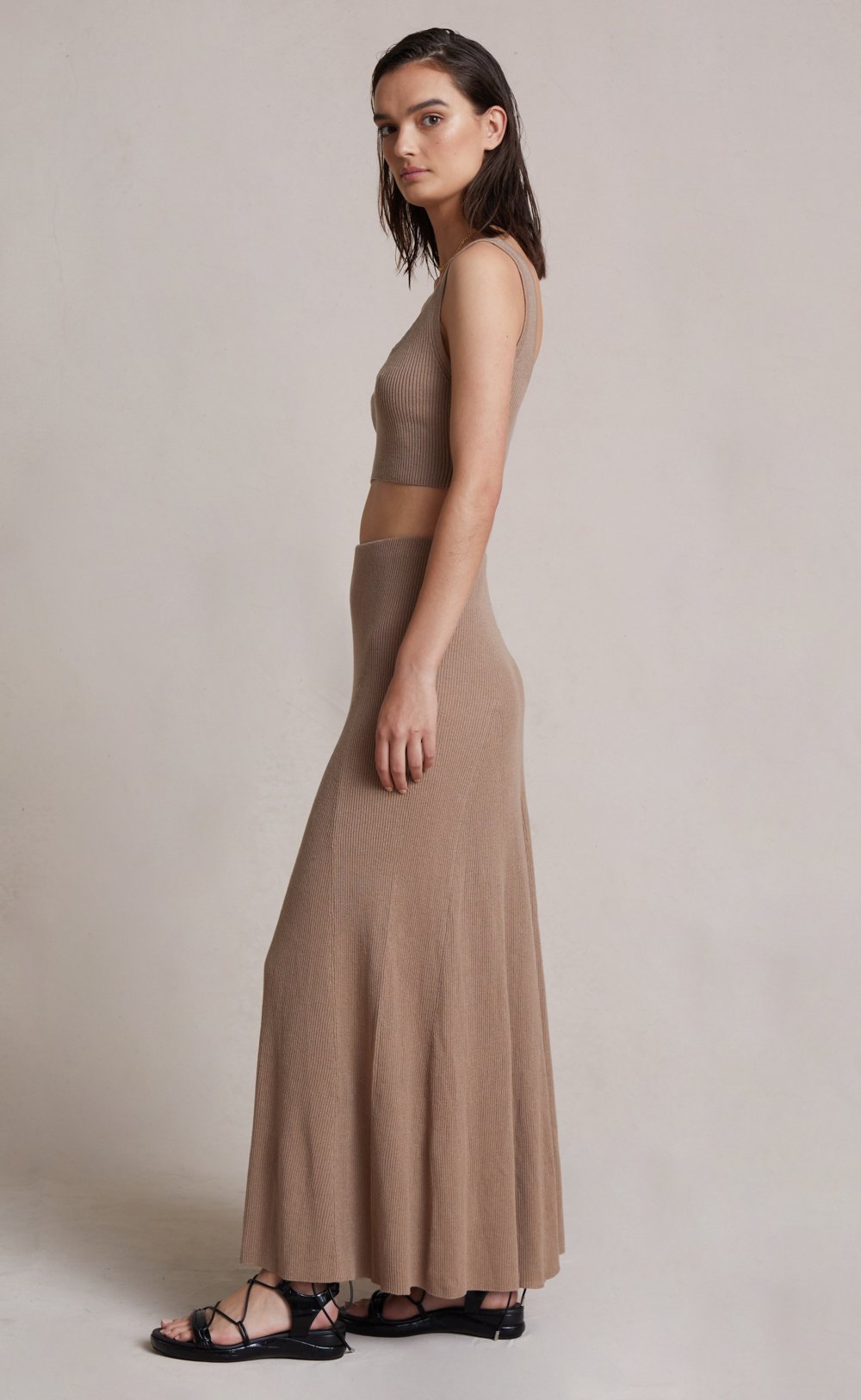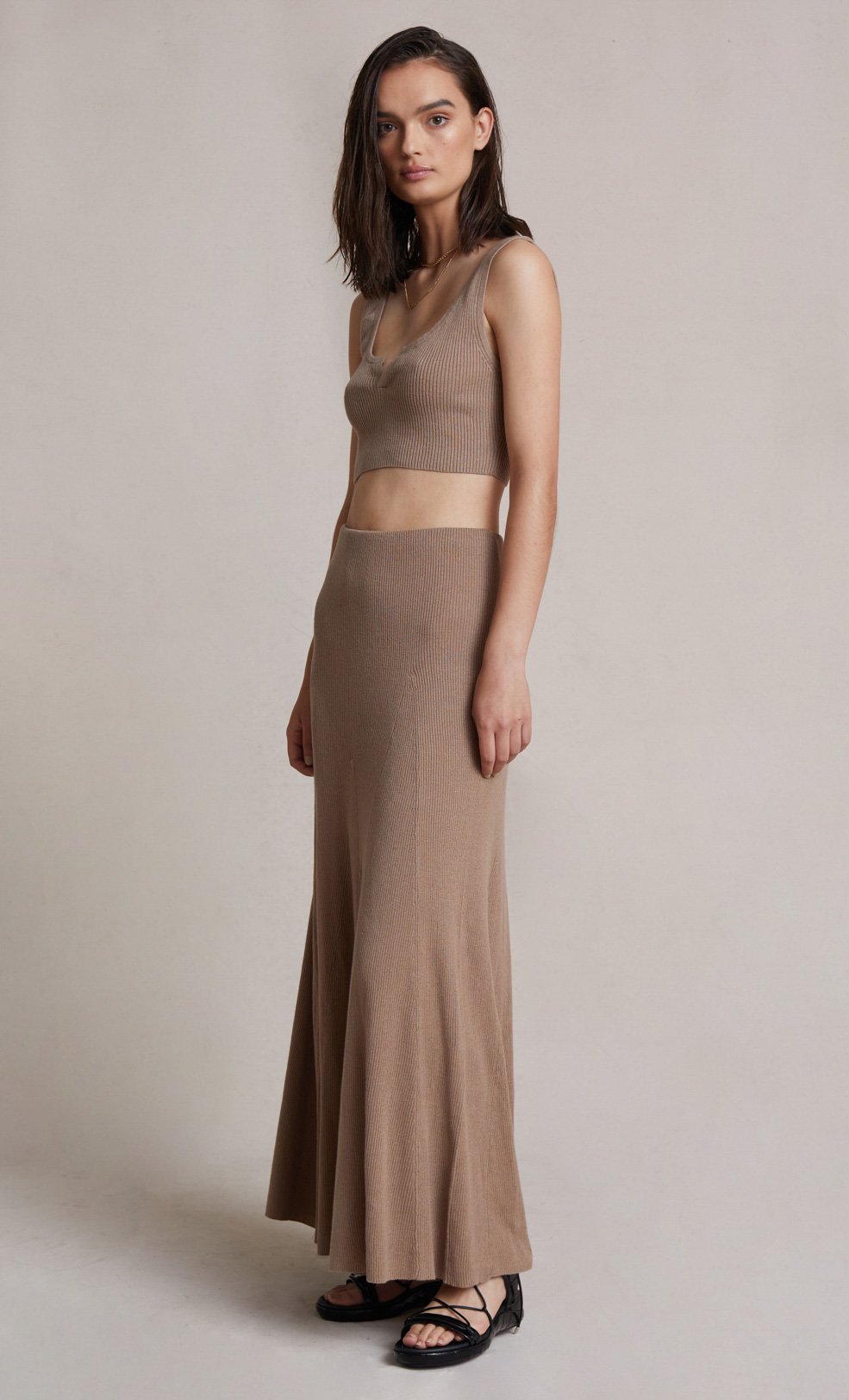 The Luka Knit Maxi Skirt is a chic and comfortable ankle length style spun from a figure-hugging ribbed knit fabric that skims the hips before falling into a flowy, relaxed skirt. The maxi skirt is an easy to wear piece with an elasticated waist for a flexible fit. Styled with our Luka Knit Top.