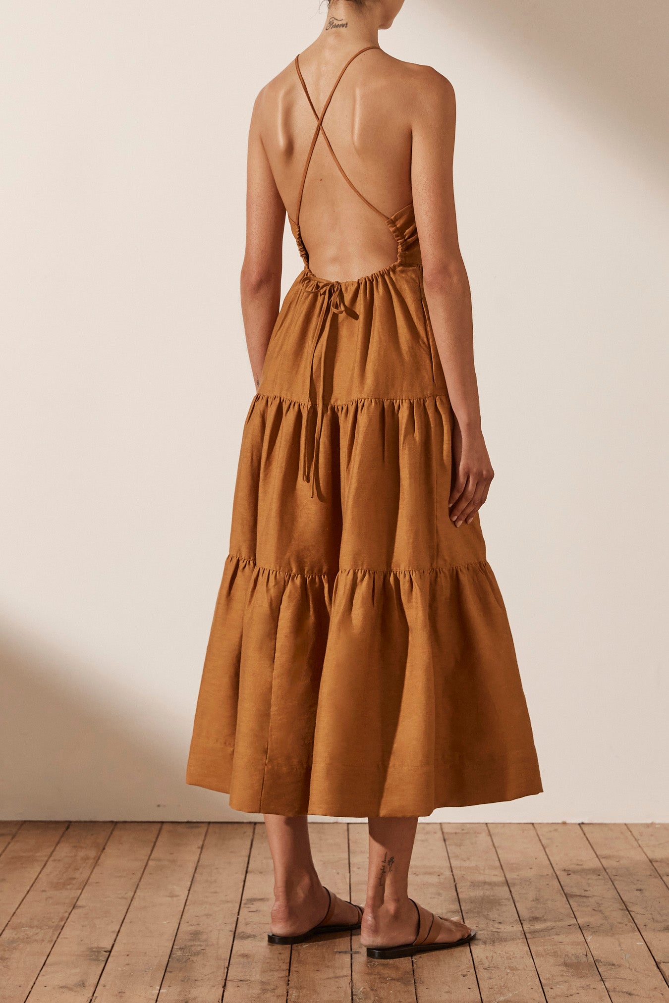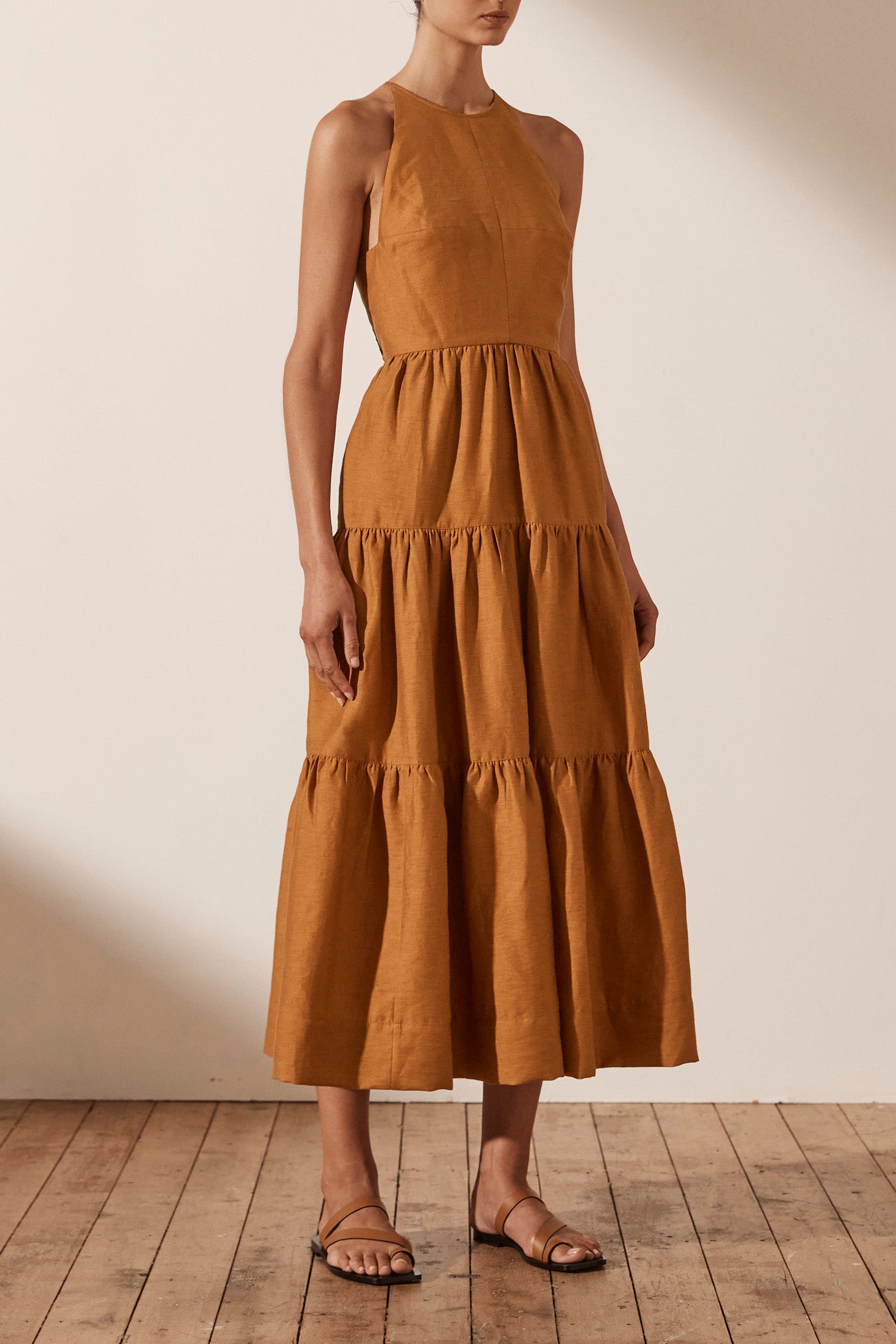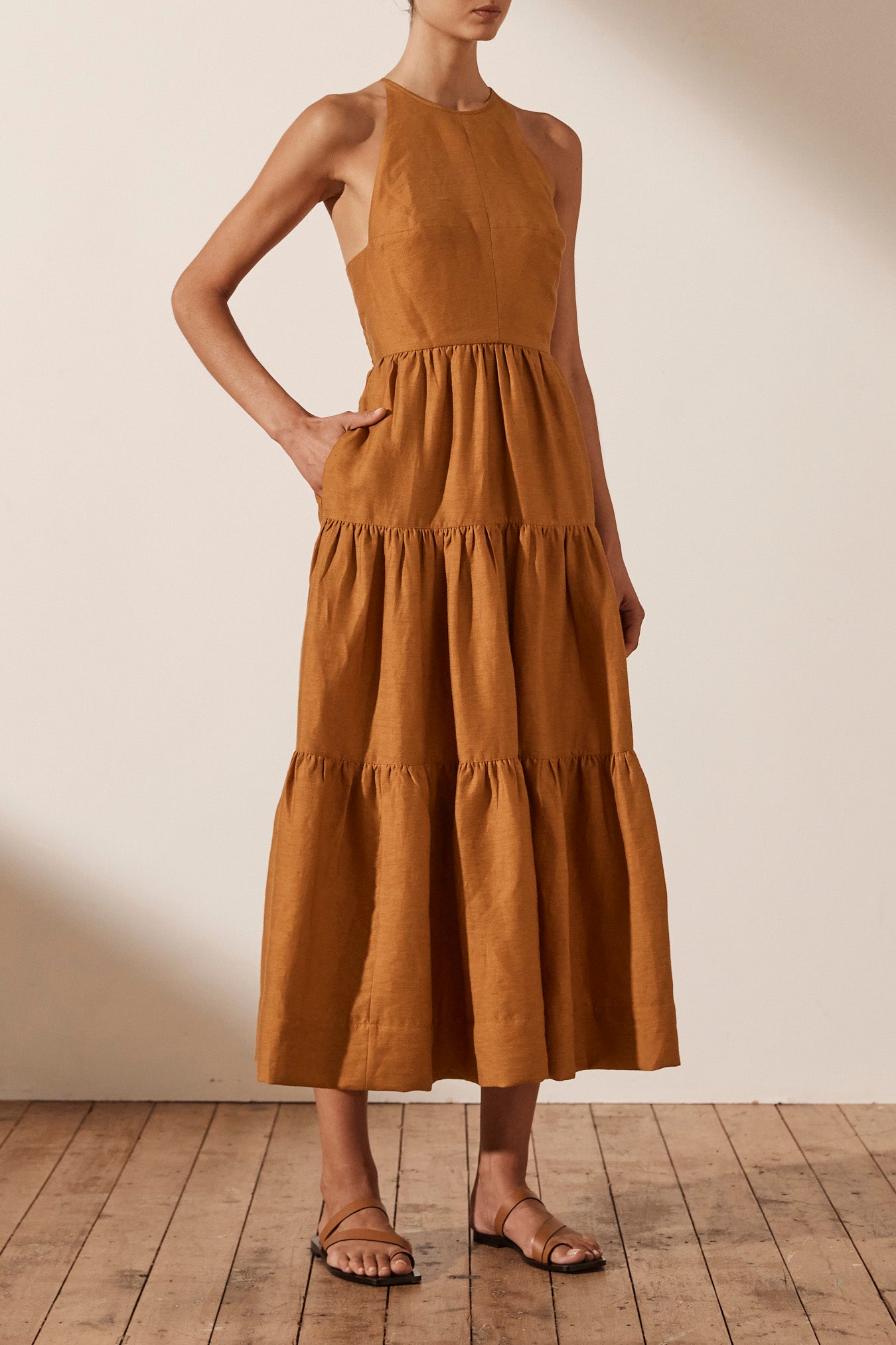 Premium linen blend fabric High neckline Fitted bodice Open back with low drawstring tie Side pockets Midi length tiered skirt Medium weight, non-stretchy woven 88% Linen 12% Nylon Lined Designed in Australia Made in China Our studio model...Read more