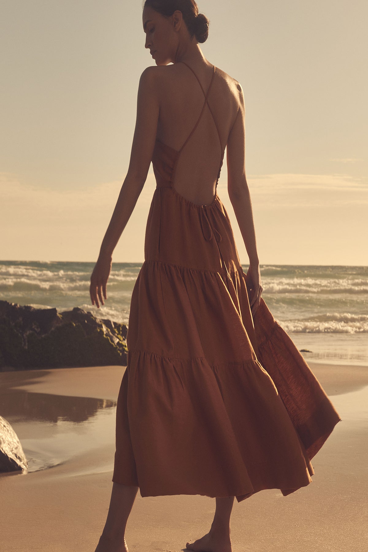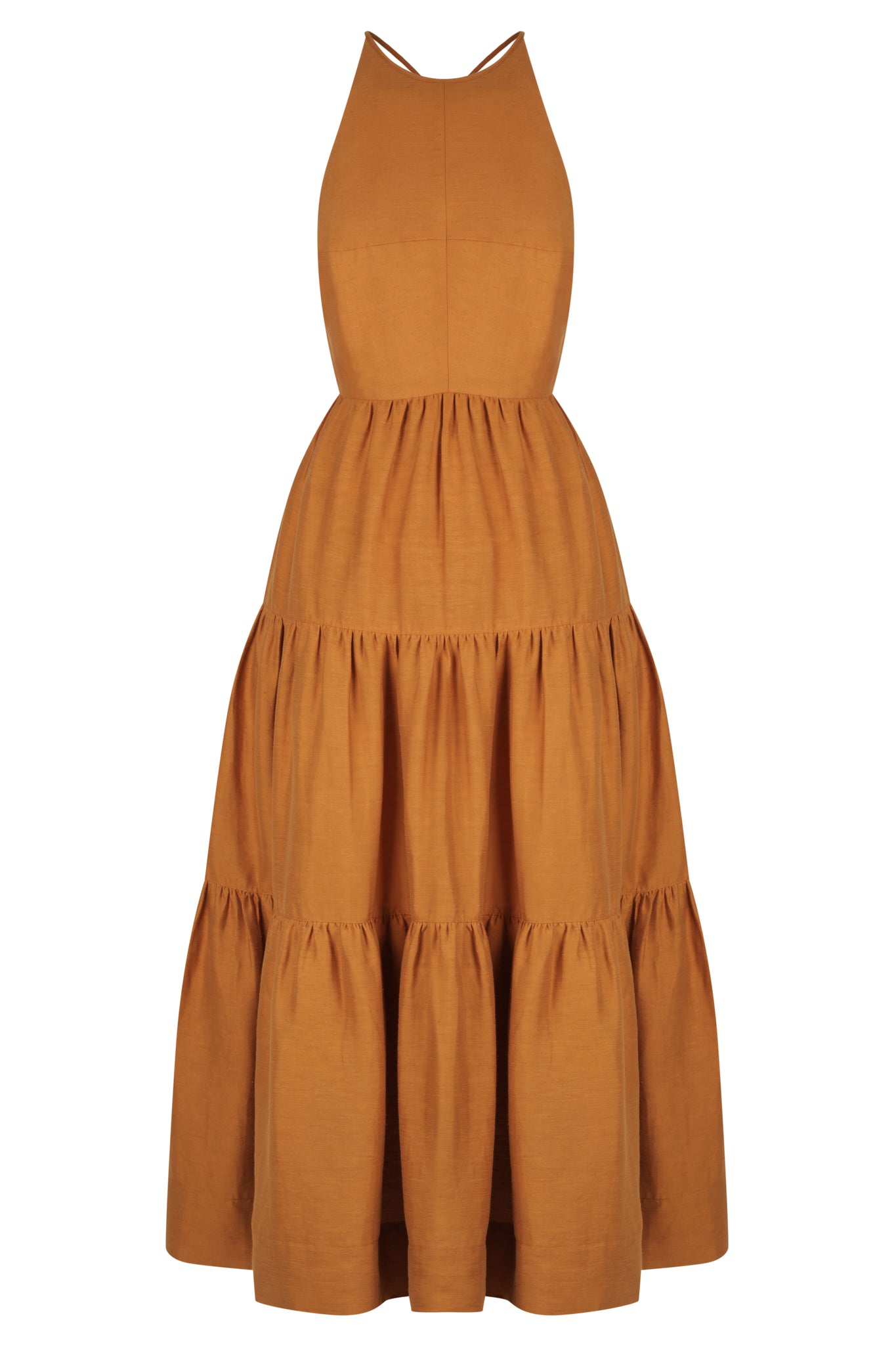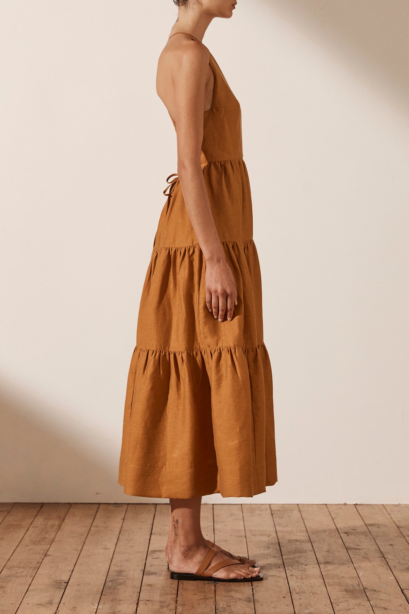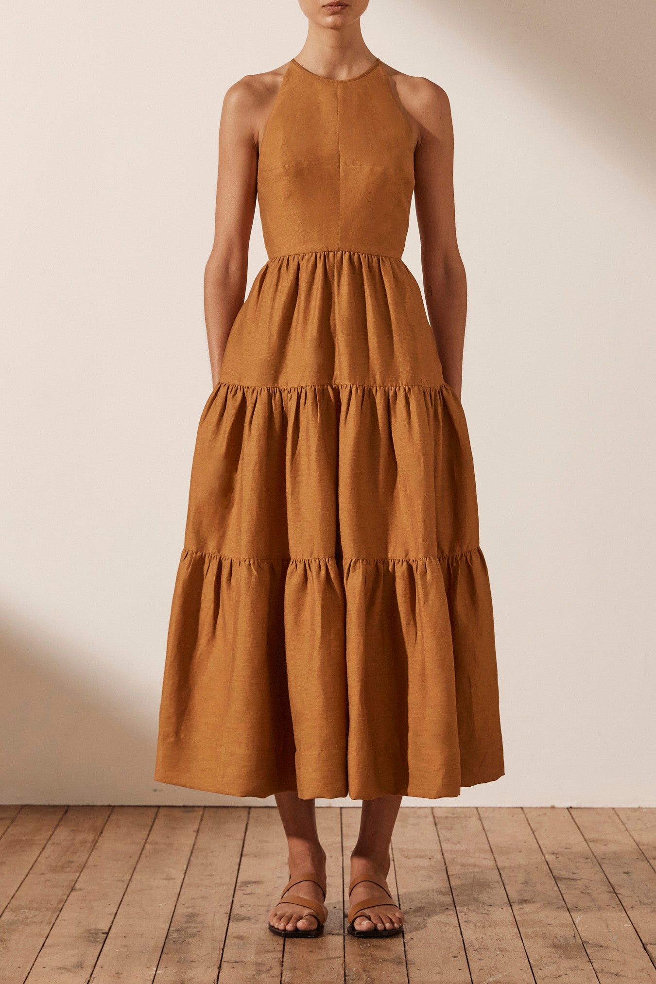 Premium linen blend fabric High neckline Fitted bodice Open back with low drawstring tie Side pockets Midi length tiered skirt Medium weight, non-stretchy woven 88% Linen 12% Nylon Lined Designed in Australia Made in China Our studio model...Read more