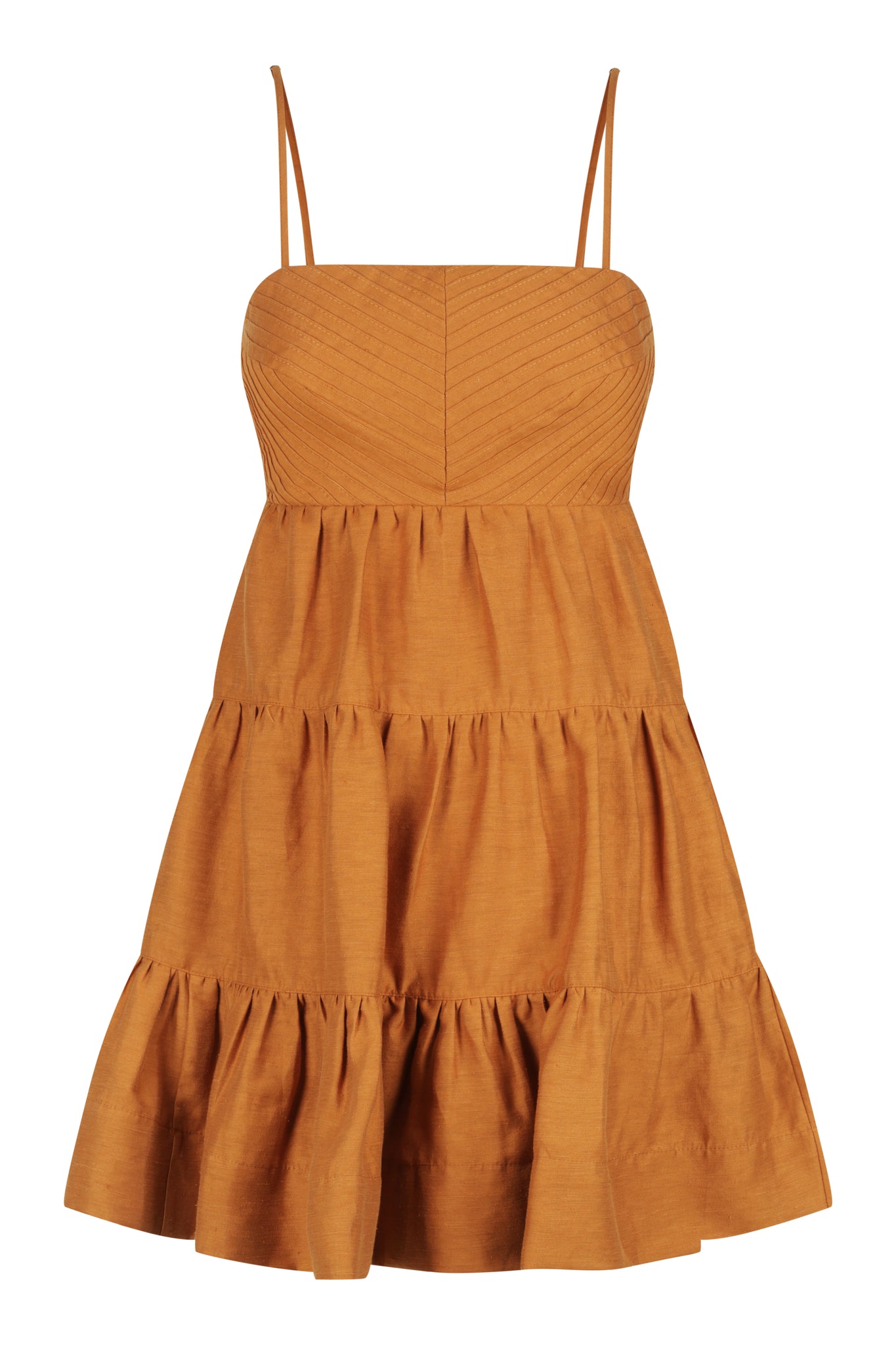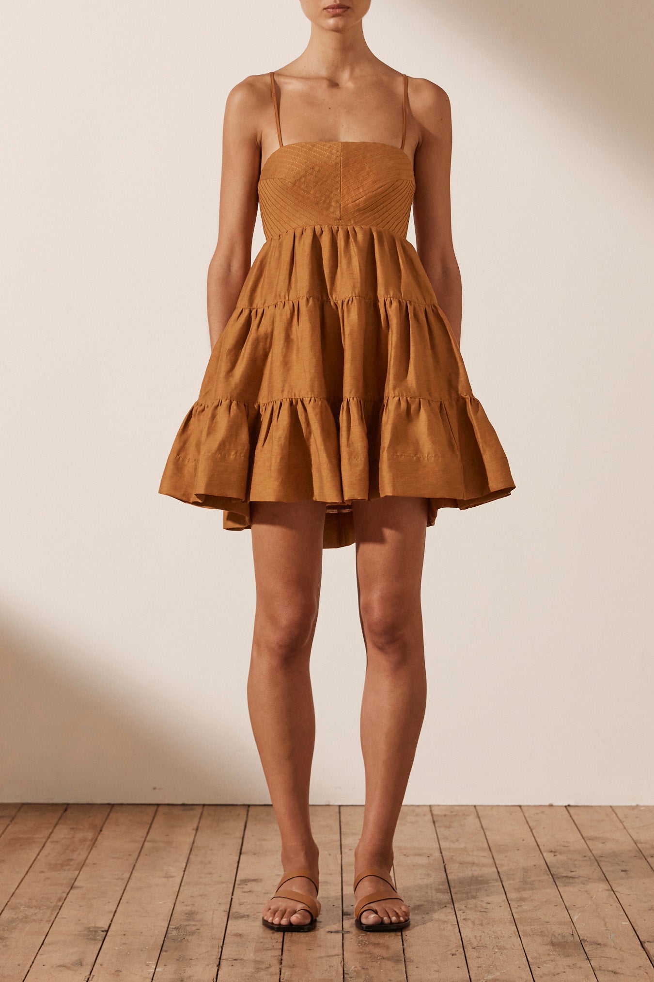 Pin tuck tiered mini dress with back cut out detail in a premium linen blend. Premium linen blend fabric Adjustable rouleau straps Square neckline with pintuck bodice Low back with tie and cut out detail Side pockets Tiered...Read more