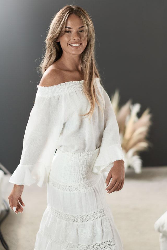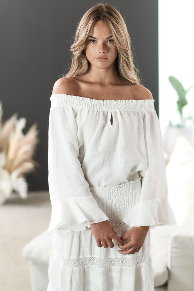 Soft and exquisite, the new Mayla On/Off Shoulder Linen Top is your new wardrobe essential! Design details include a keyhole front, fluted sleeves and multi stitch elasticised band that can be worn off or on the shoulder.